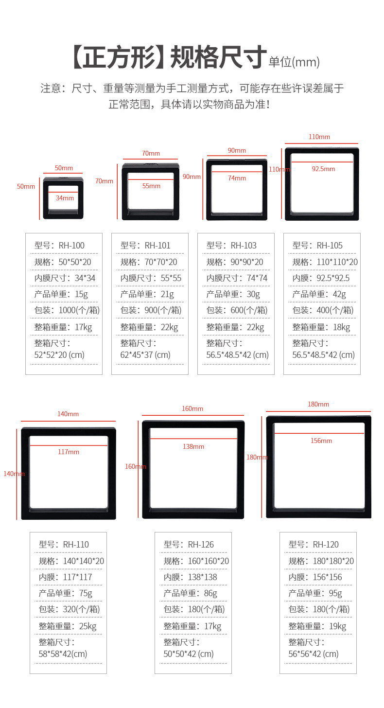 | Tamaño | 50*50*20,70*70*20,90*90*20,110*110*20,140*140*20,180*180*20,180*90*20,230*90*20 |