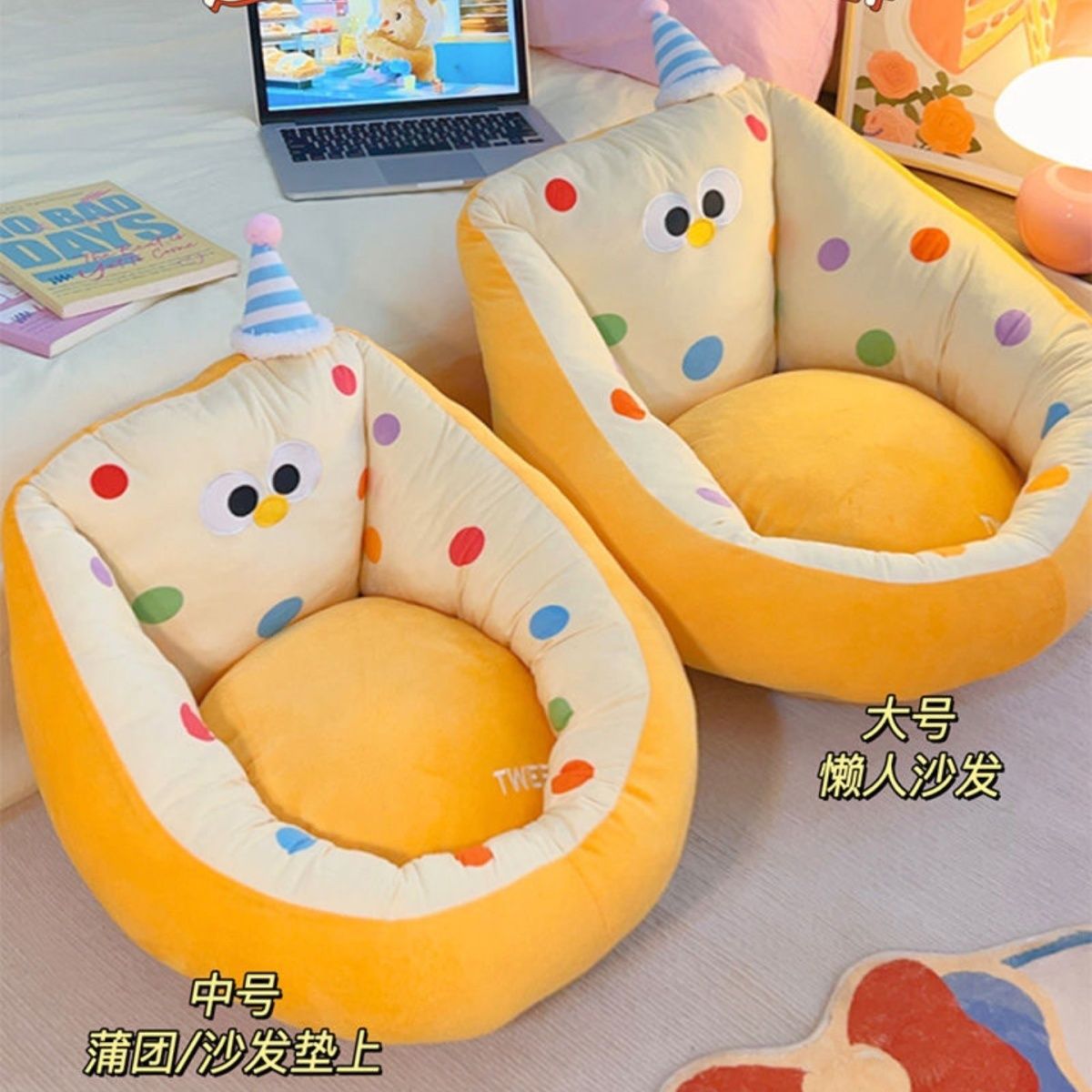 | Colores | Cuadros azules (con amarillo),Cuadros rosas (con verde),Sofá perezoso (lunares amarillos),Sofá perezoso (manzana linda),Sofá perezoso (lunares rosas) |