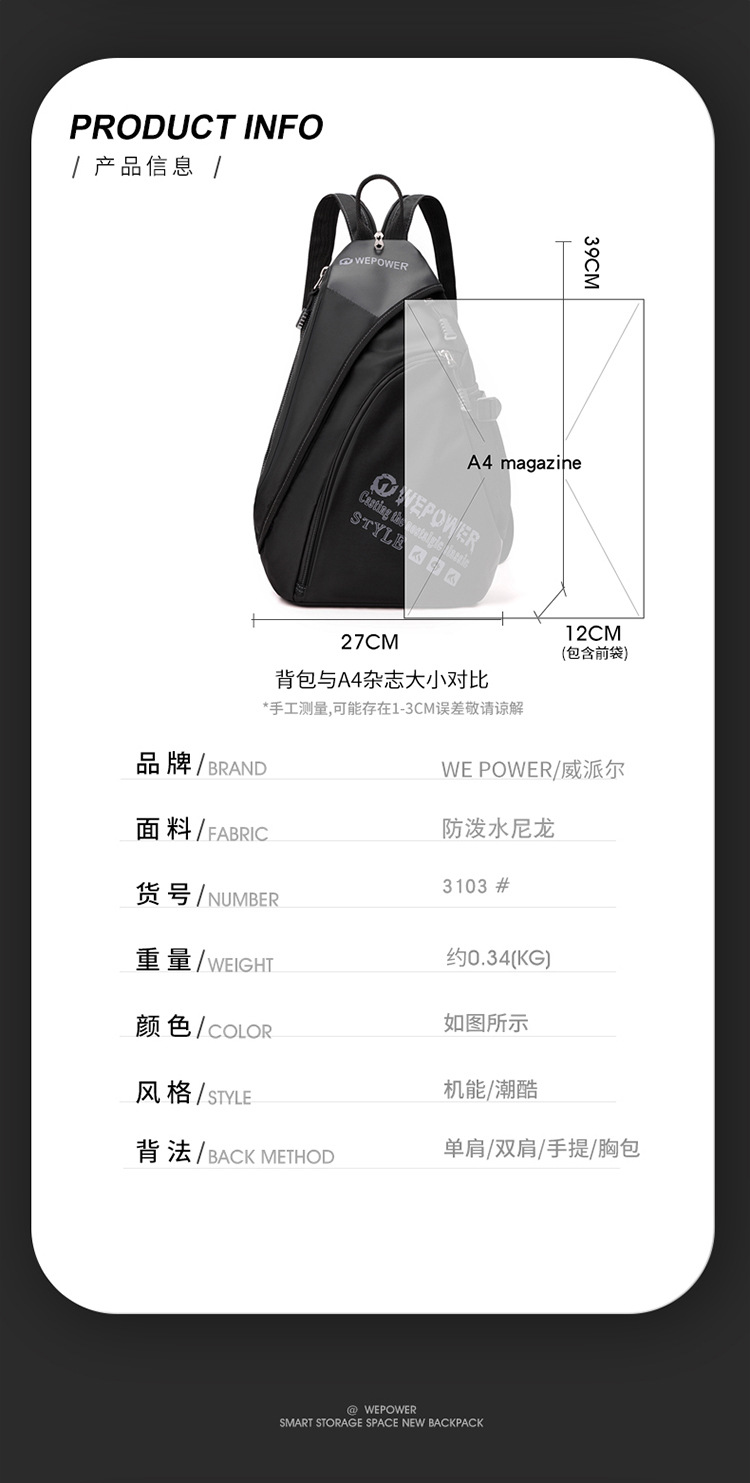 【产品货号】3103#胸包、单肩、斜挎包、可手提、可双肩