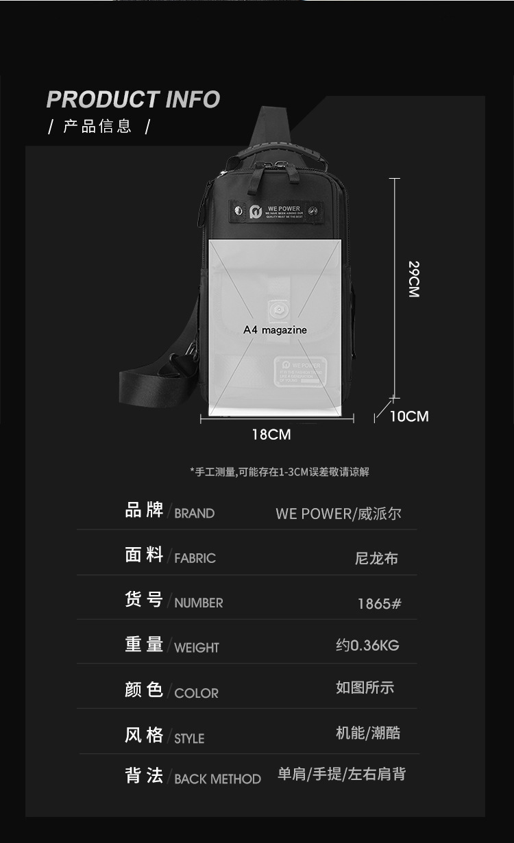 【产品货号】1865#胸包、单肩、斜挎包、可手提