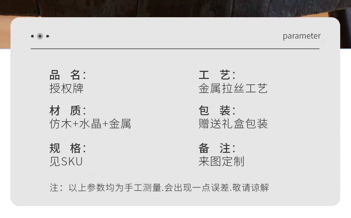 | Especificaciones | Modelo puro [20 * 15 cm], modelo puro [24 * 18 cm], modelo puro [27 * 22 cm], modelo de hoja de palma [20 * 15 cm], modelo de hoja de palma [24 * 18 cm], modelo de hoja de palma [27 * 22 cm], modelo de estrella de elevación humana [20 * 15 cm], modelo de estrella de elevación humana [24 * 18 cm], modelo de estrella de elevación humana [27 * 22 cm], modelo de espilla de trigo [20 * 15 cm], modelo de espilla de trigo [24 * 18 cm], modelo de espilla de trigo [27 * 22 cm], 20 * 15 cm de hojas, 24 * 18 cm de hojas, 27 * 22 cm de hojas, 25 * 18 cm de cristal azul + hoja de palma, 20 * 15 cm de cristal azul + hoja de palma, 23 * 16 cm de cristal azul + hoja de palma, 20 * 15 cm de cristal negro + hoja de palma, 23 * 16 cm de cristal negro + hoja de palma, 25 * 18 cm de cristal negro + hoja de palma, 20 * 25 cm de medalla de oro dibujada de nuez imitada, Medalla de oro cepillado de nuez imitación [24 * 31cm], medalla de oro cepillado de nuez imitación [30 * 40cm] |