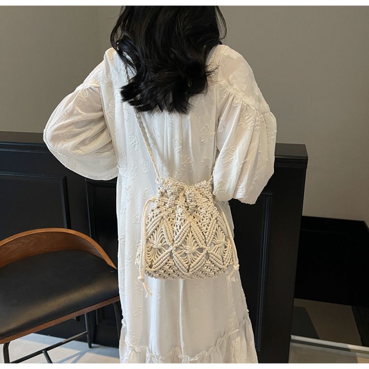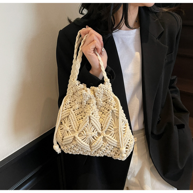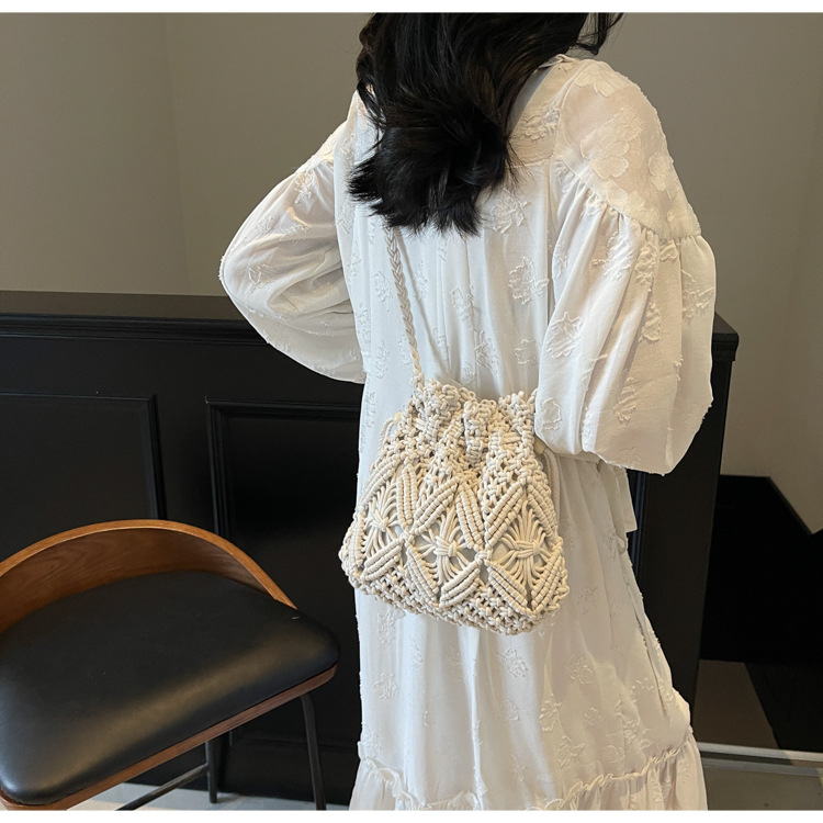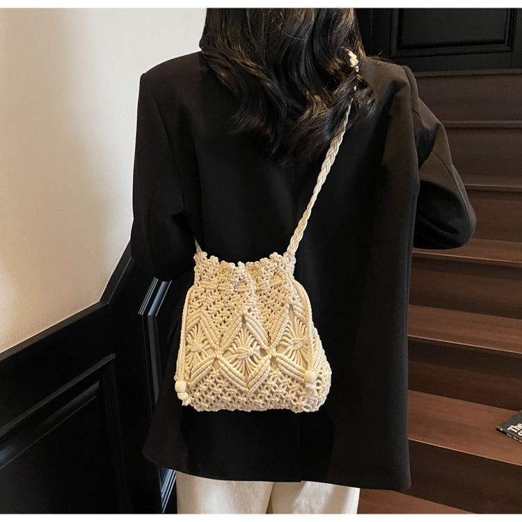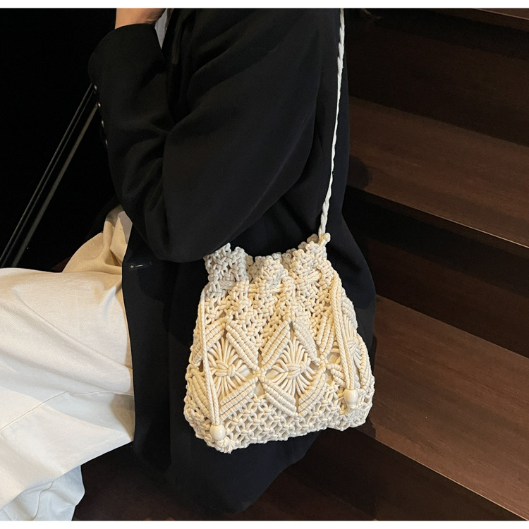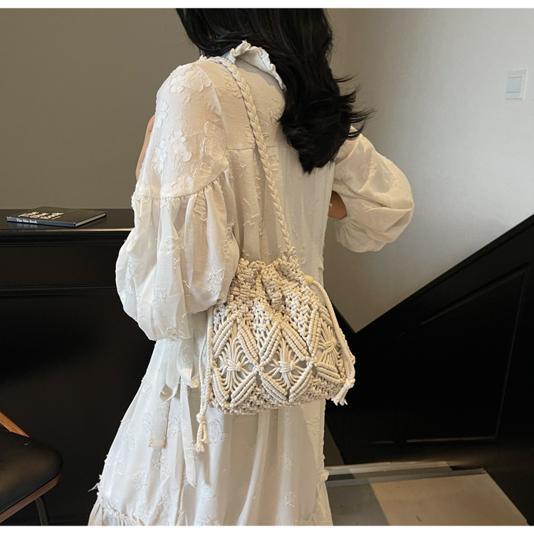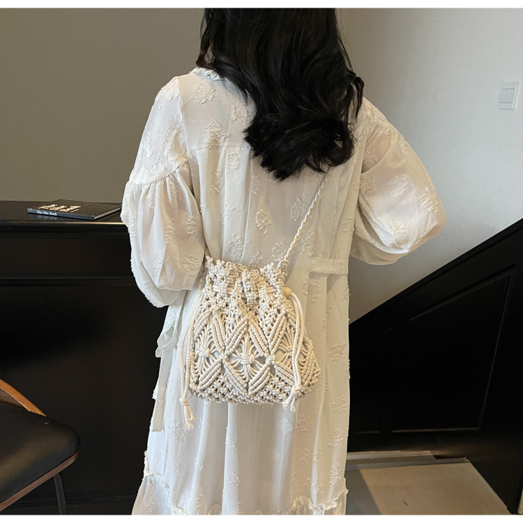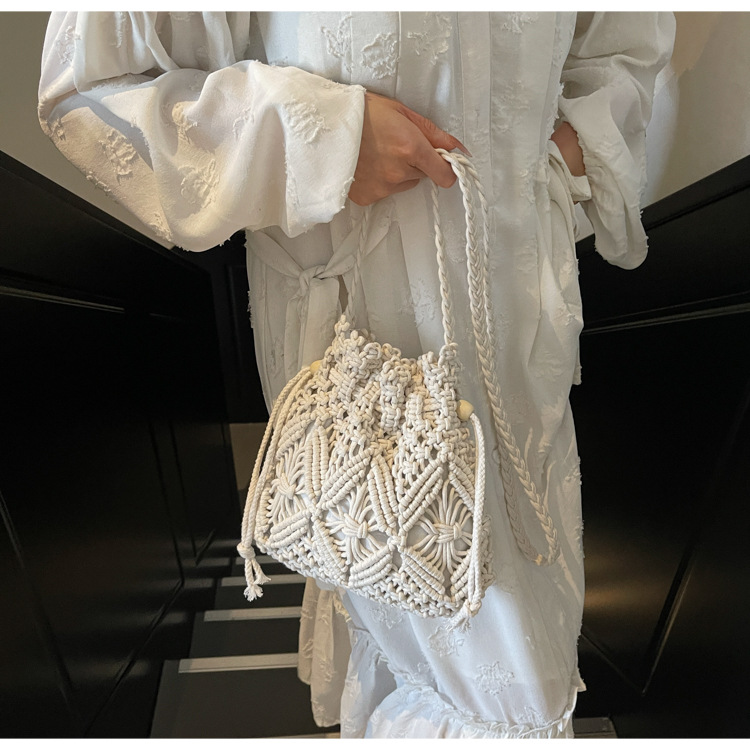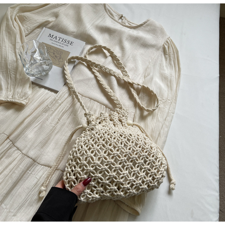 Bolso de cuerda de algodón tejido para mujer verano salvaje 2025 nueva moda diseño de nicho bolso de cubo de mensajero bolso de playa hueco