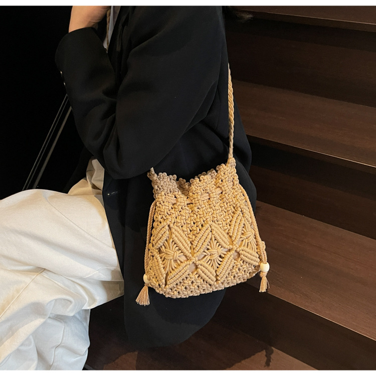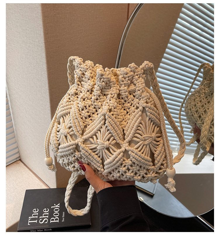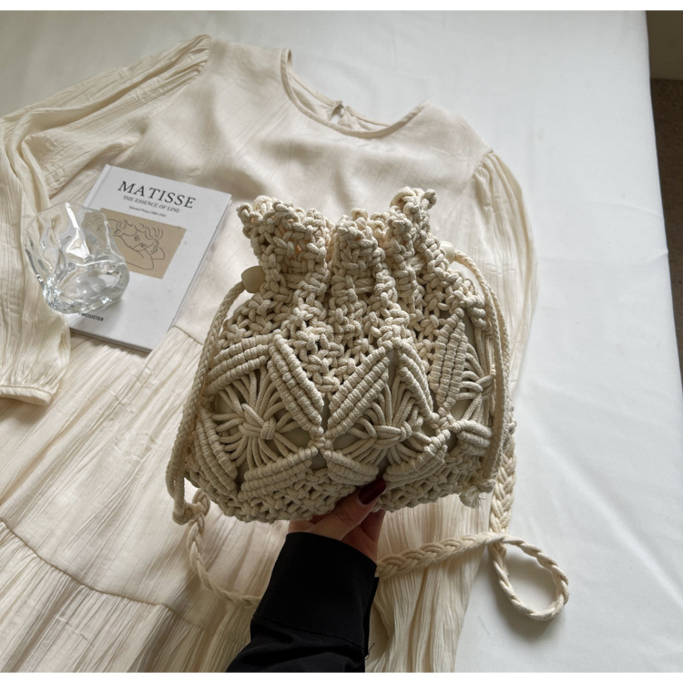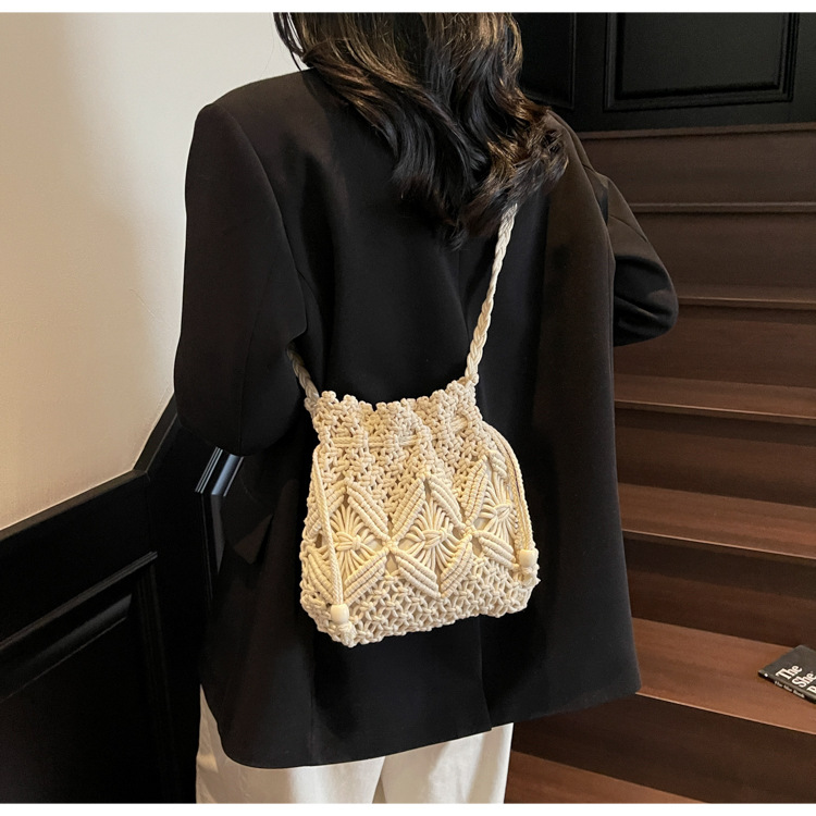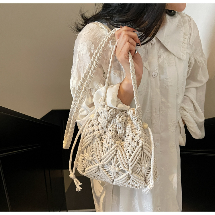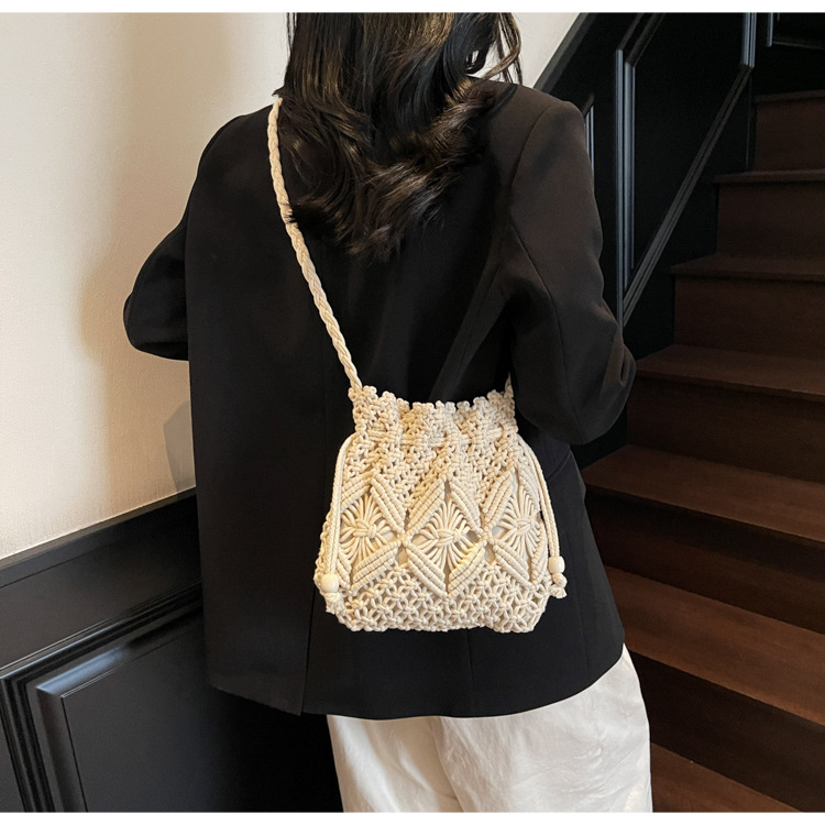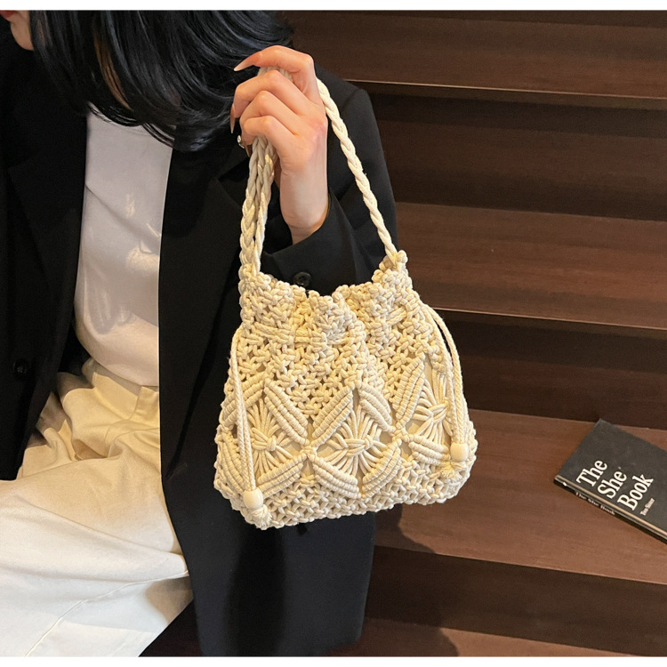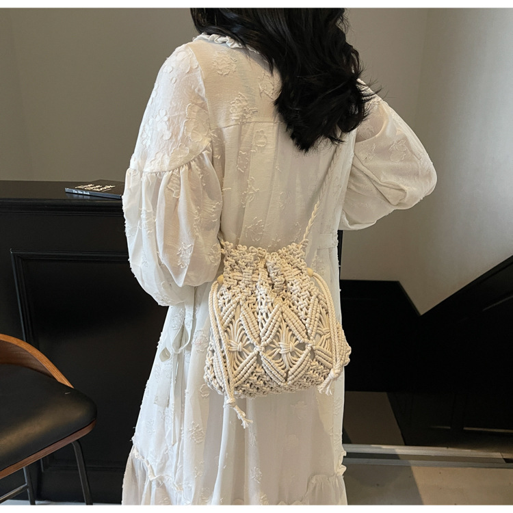 Bolso de cuerda de algodón tejido para mujer verano salvaje 2025 nueva moda diseño de nicho bolso de cubo de mensajero bolso de playa hueco