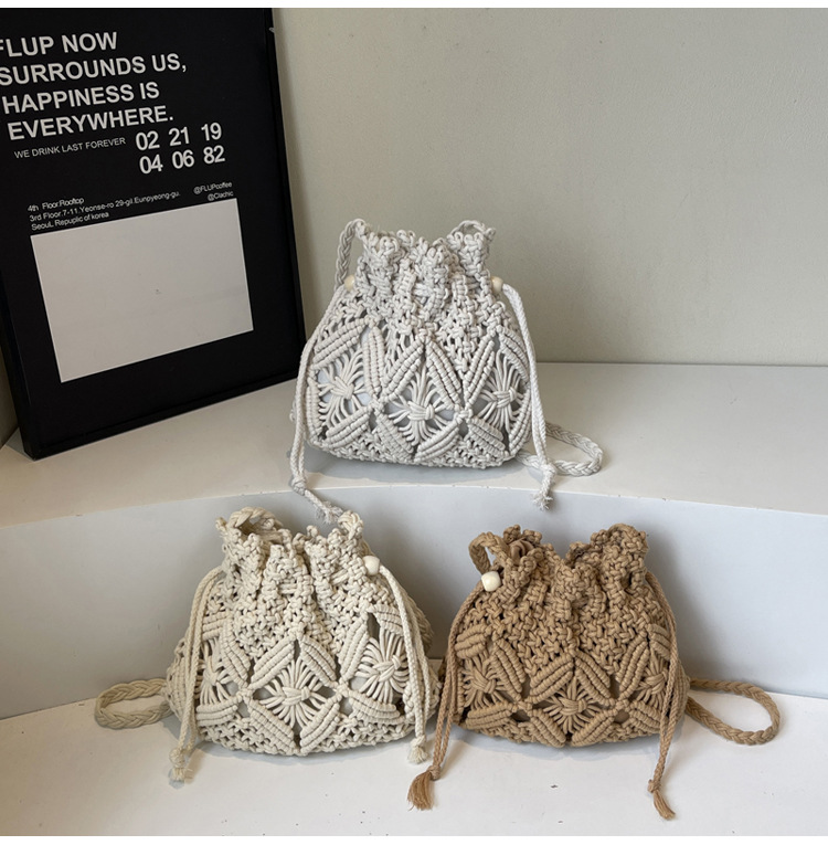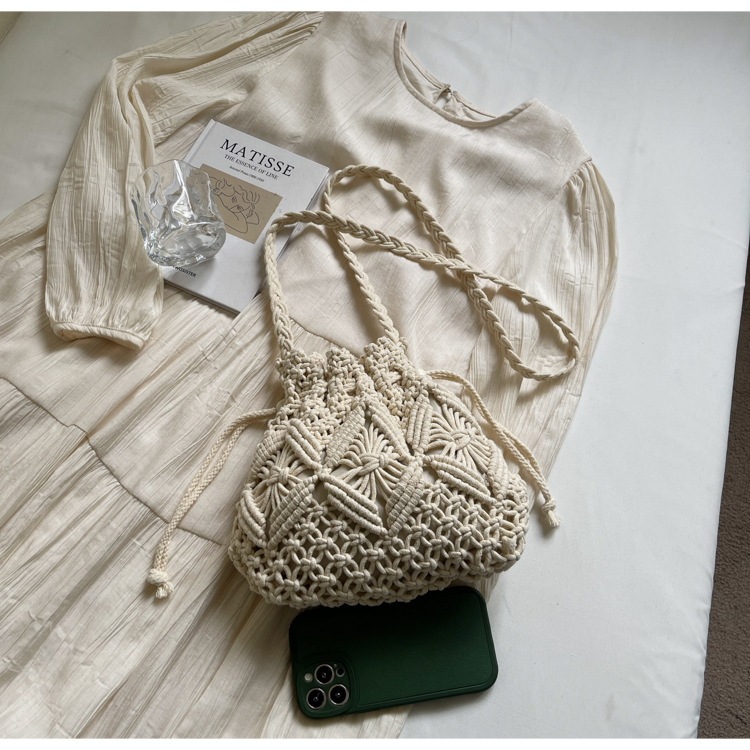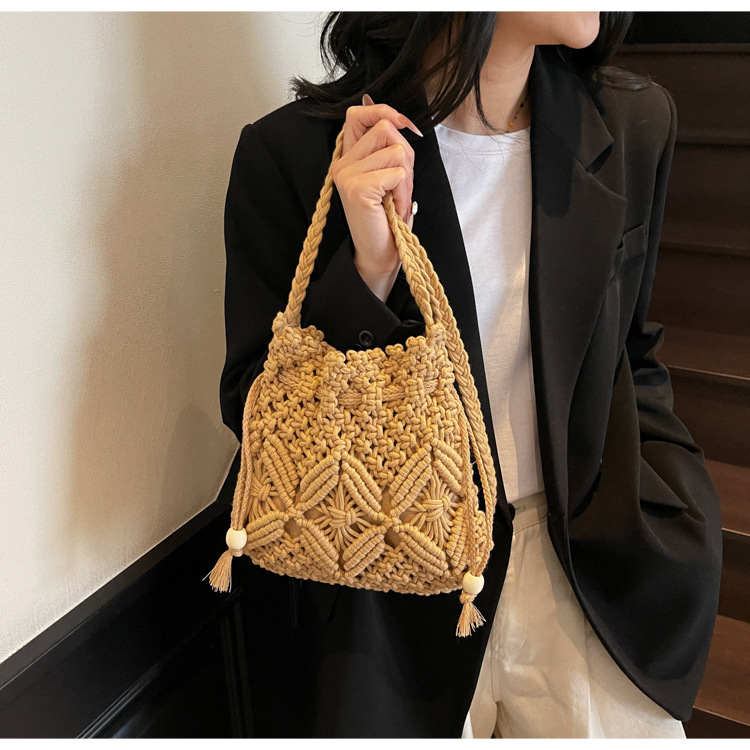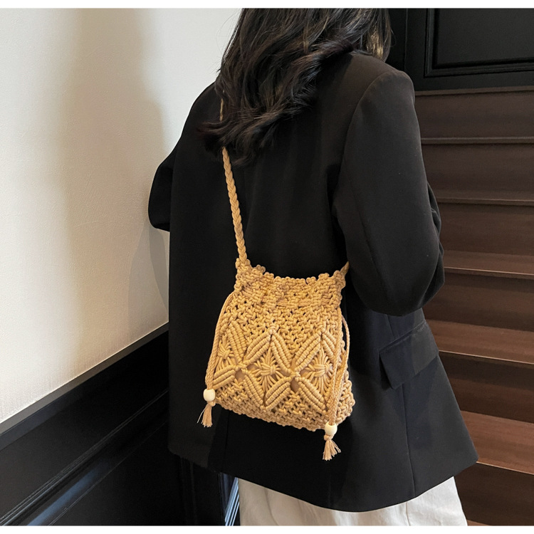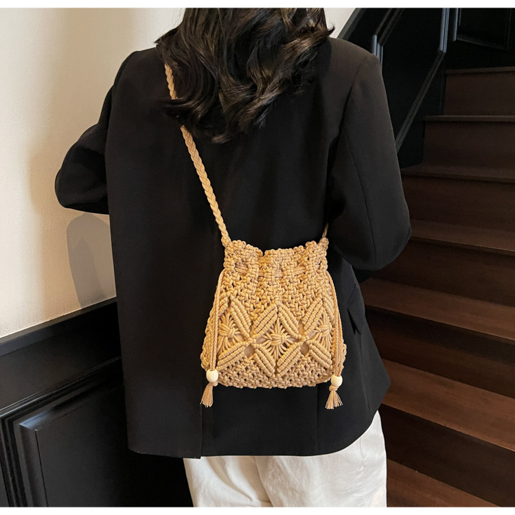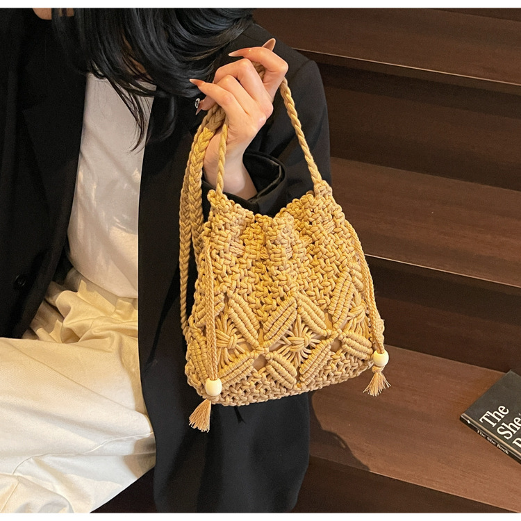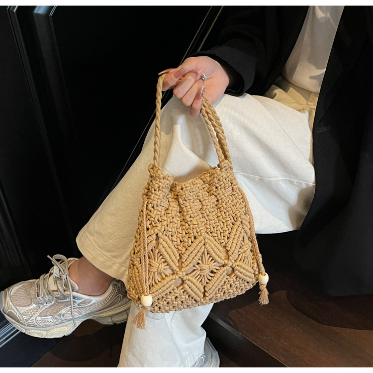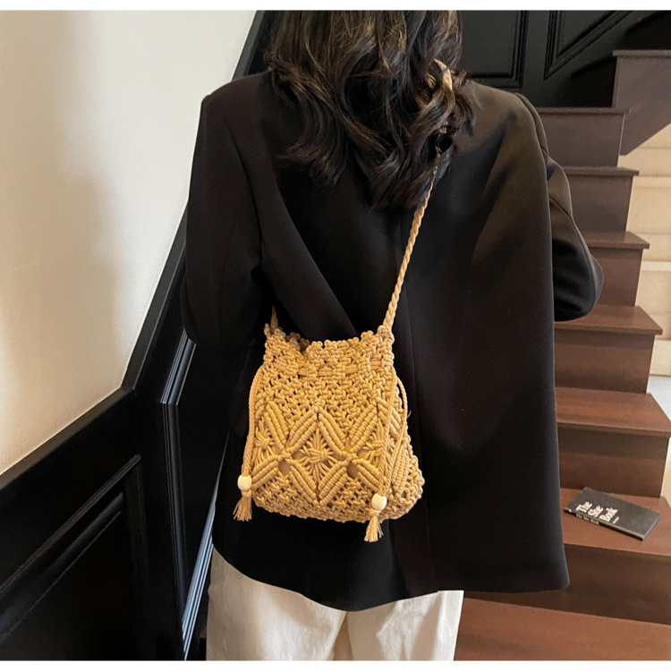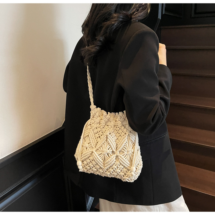 Bolso de cuerda de algodón tejido para mujer verano salvaje 2025 nueva moda diseño de nicho bolso de cubo de mensajero bolso de playa hueco