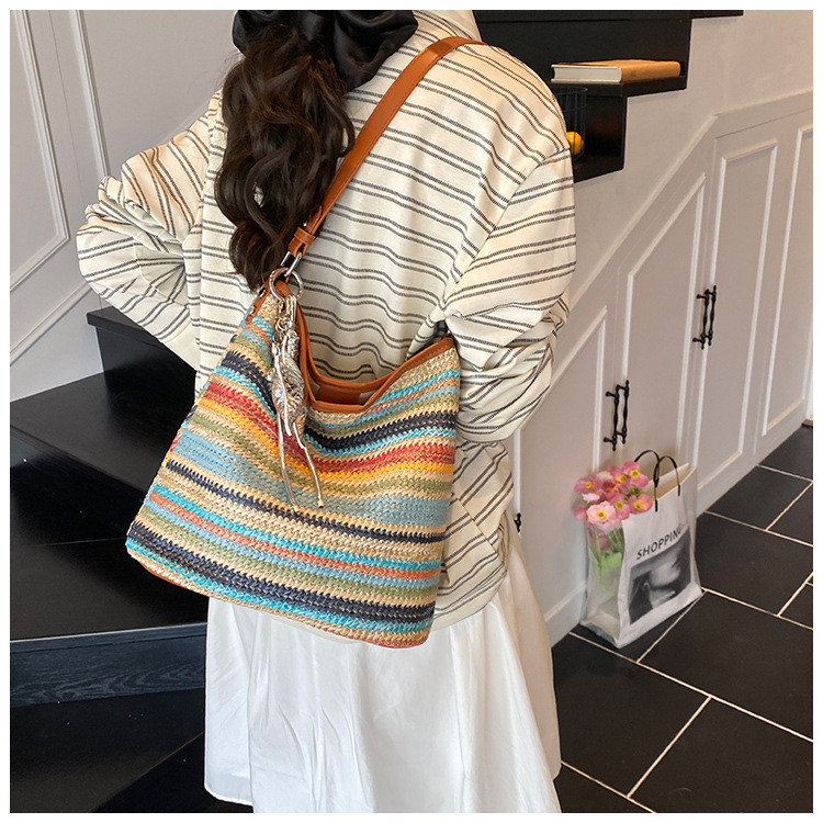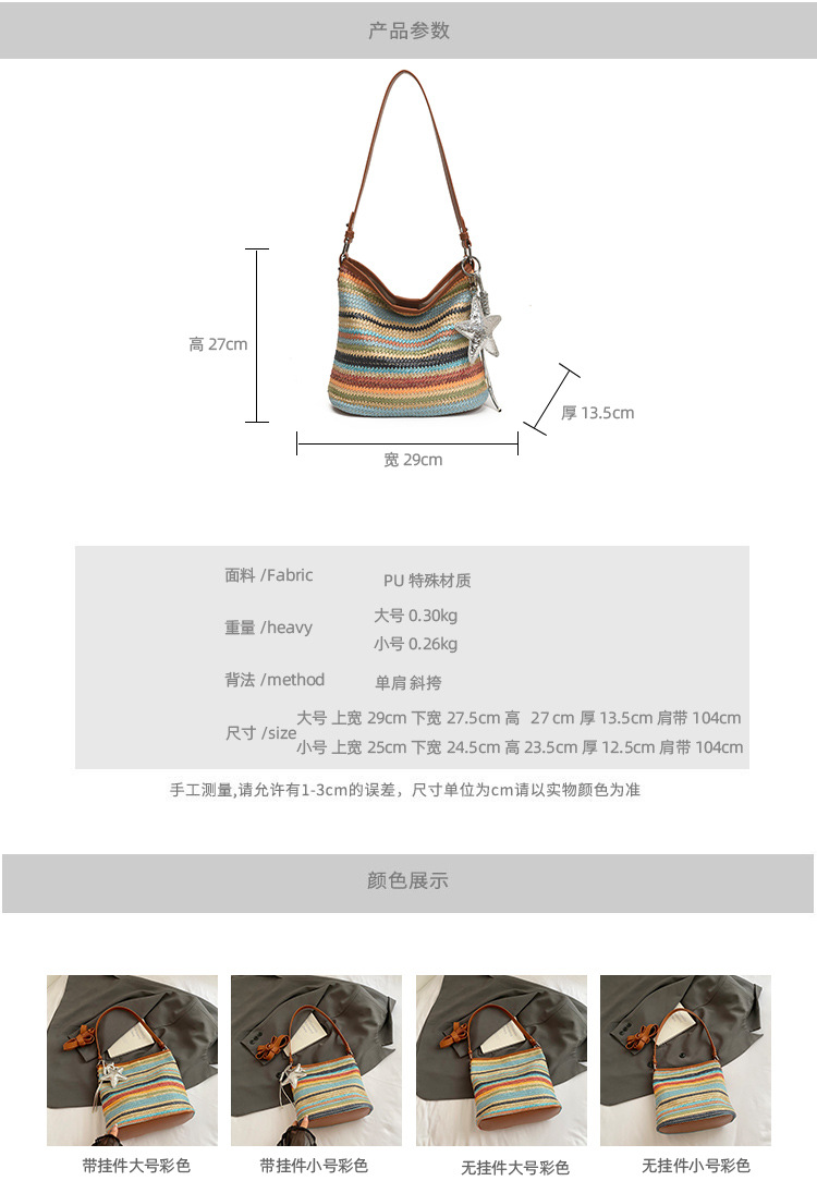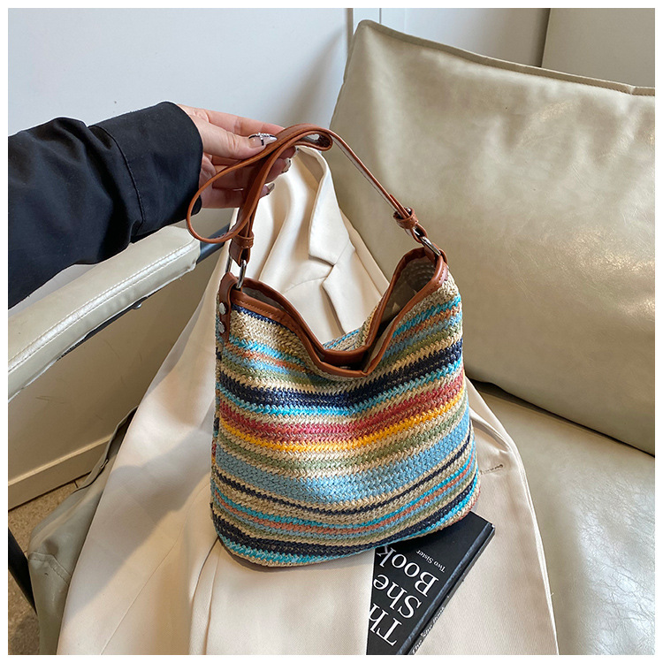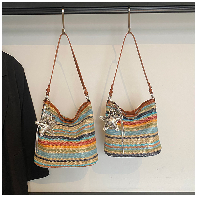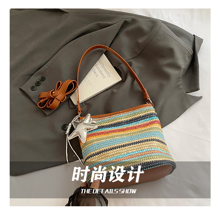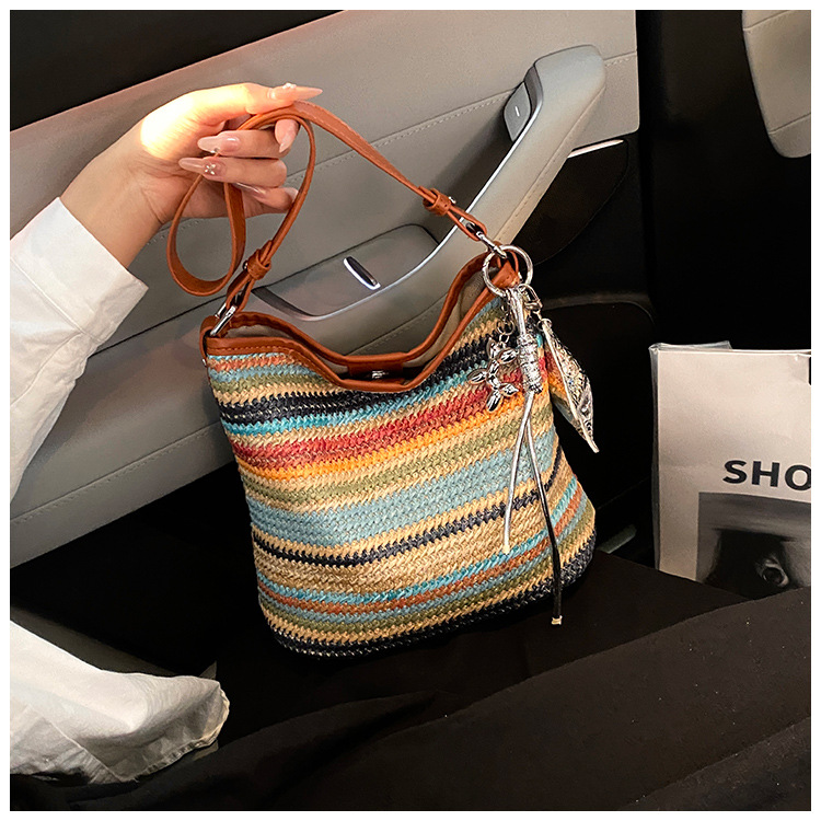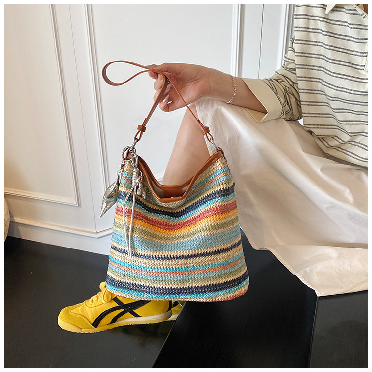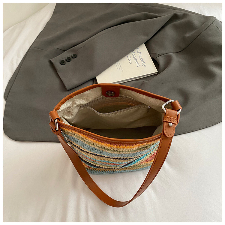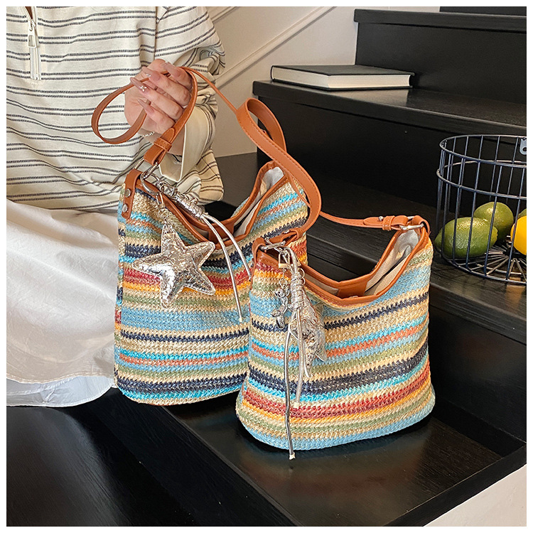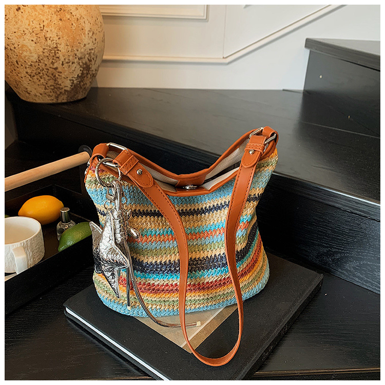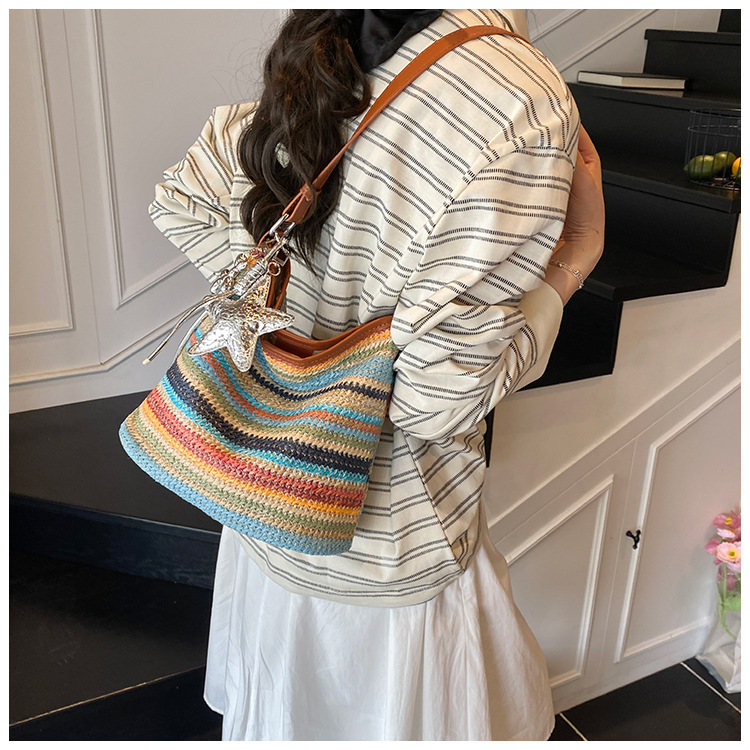 Bolso de cubo tejido arcoíris de estilo caliente de verano 2025 nuevo bolso de playa estilo vacaciones junto al mar bolso de hombro de axila de todo fósforo