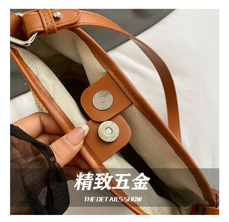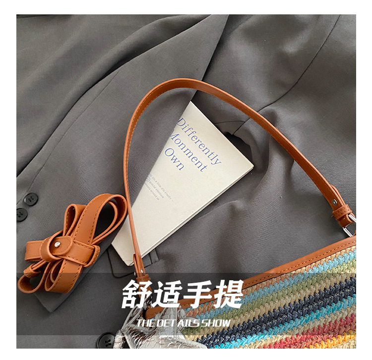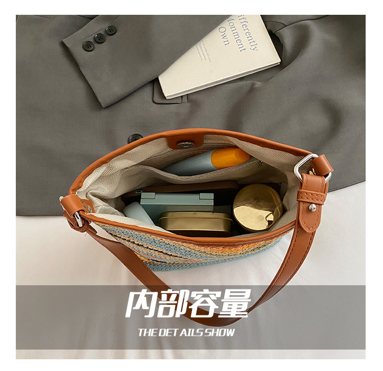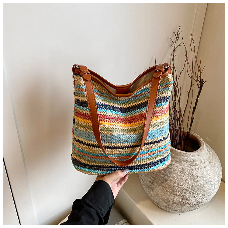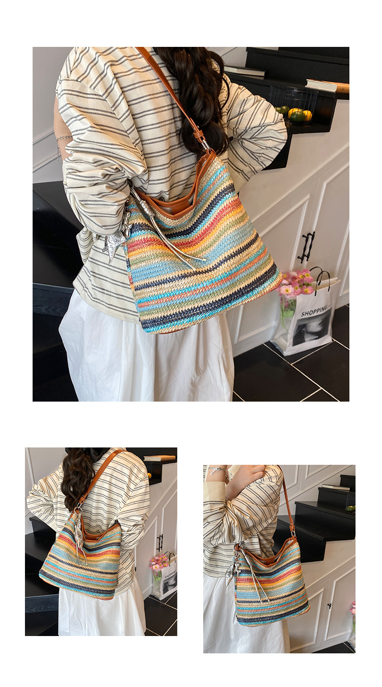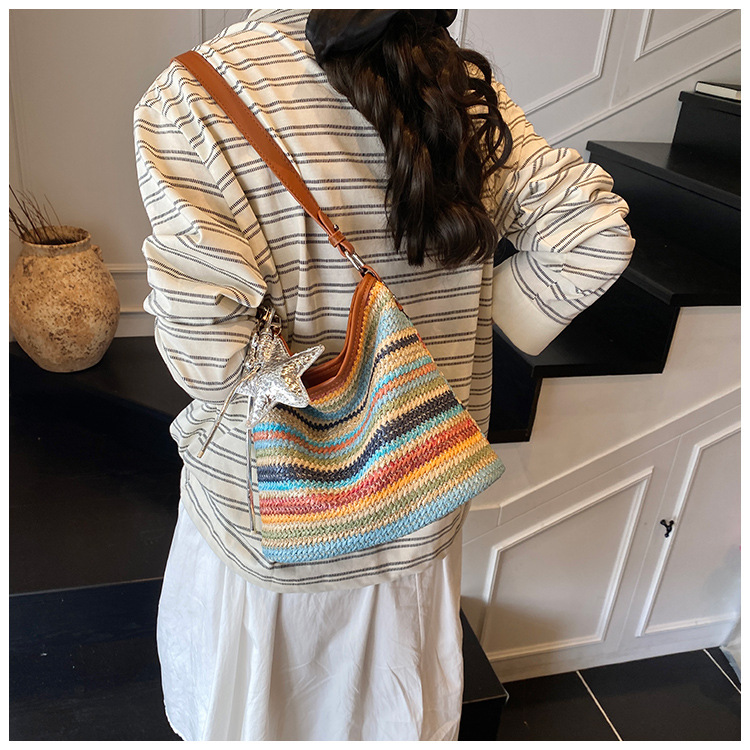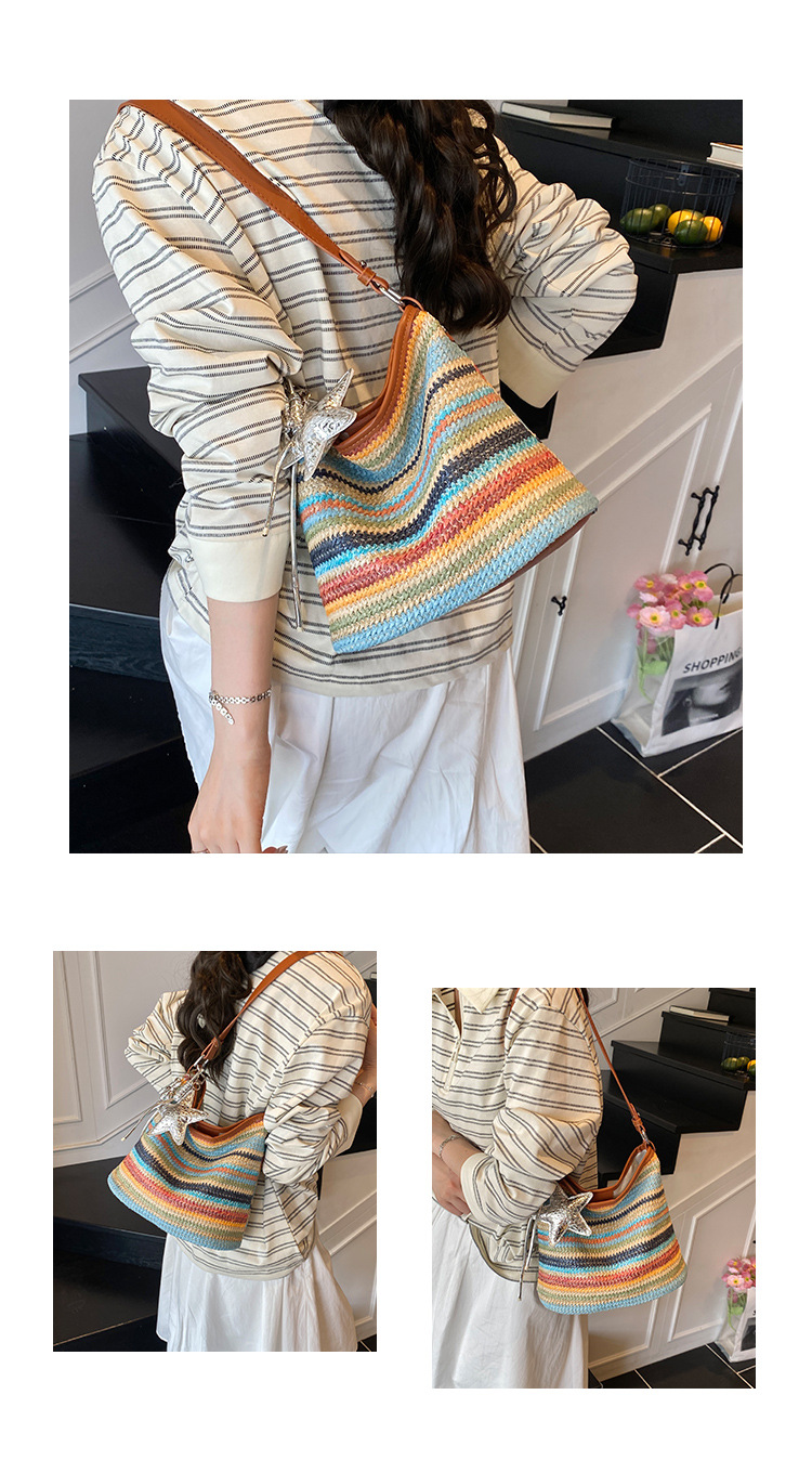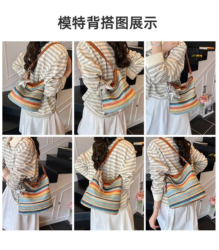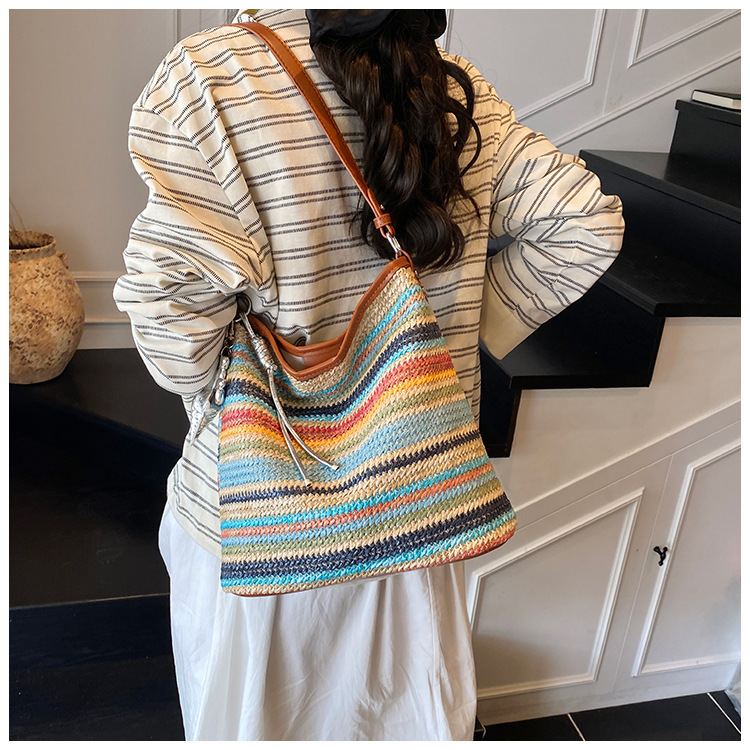 Bolso de cubo tejido arcoíris de estilo caliente de verano 2025 nuevo bolso de playa estilo vacaciones junto al mar bolso de hombro de axila de todo fósforo