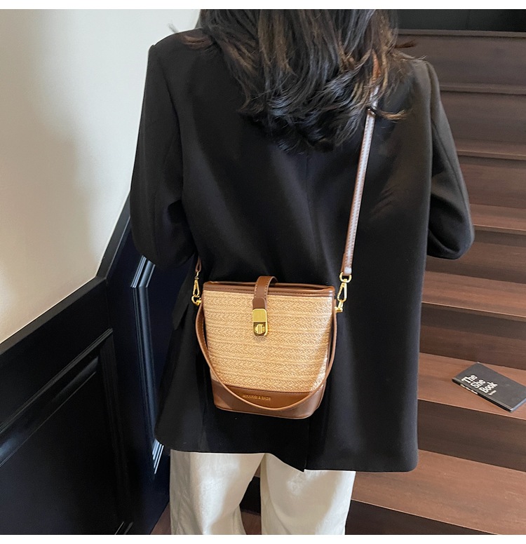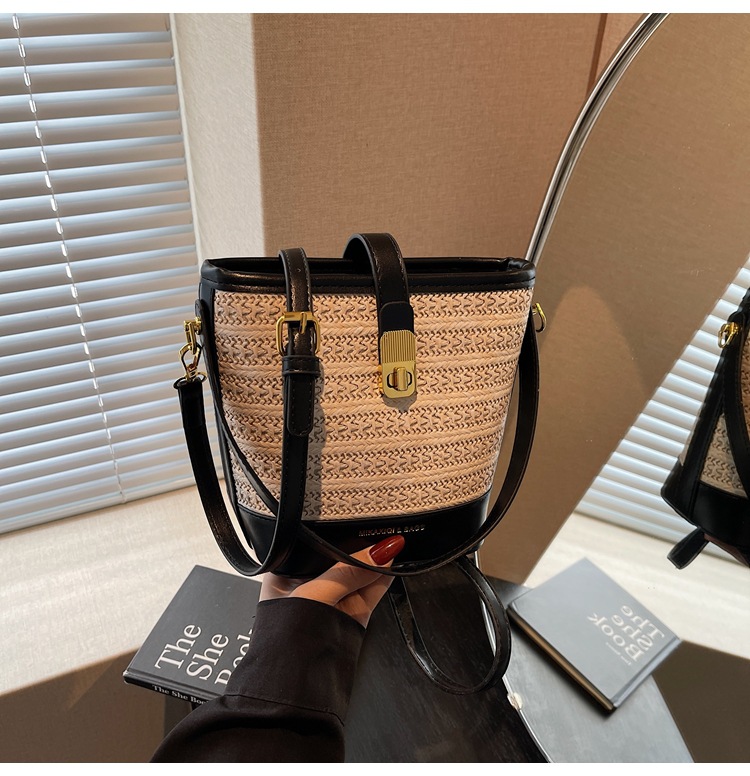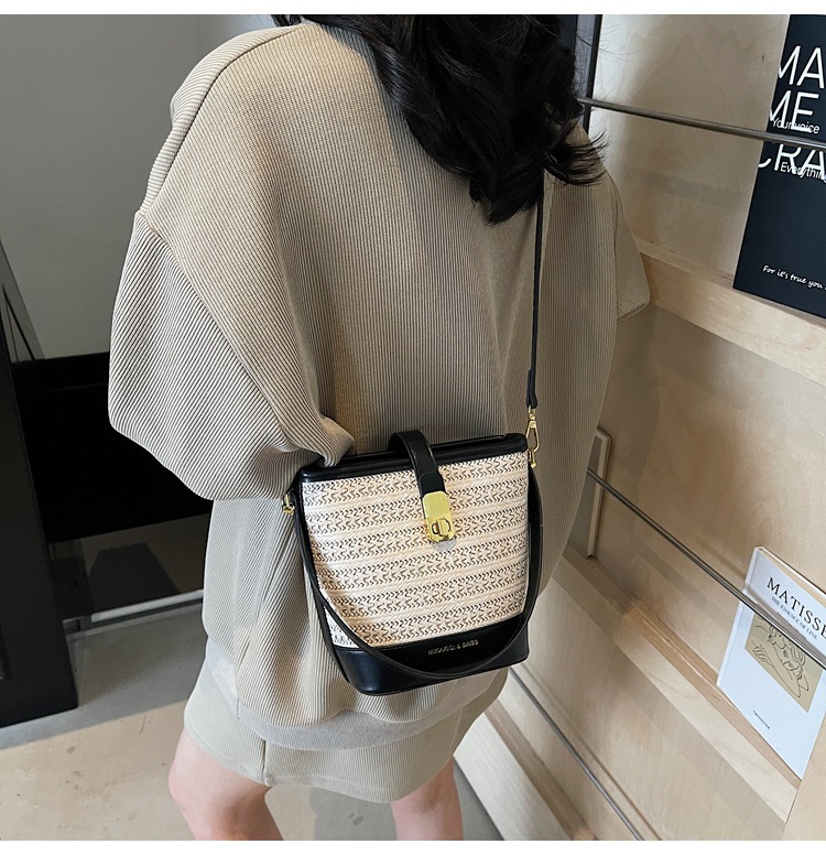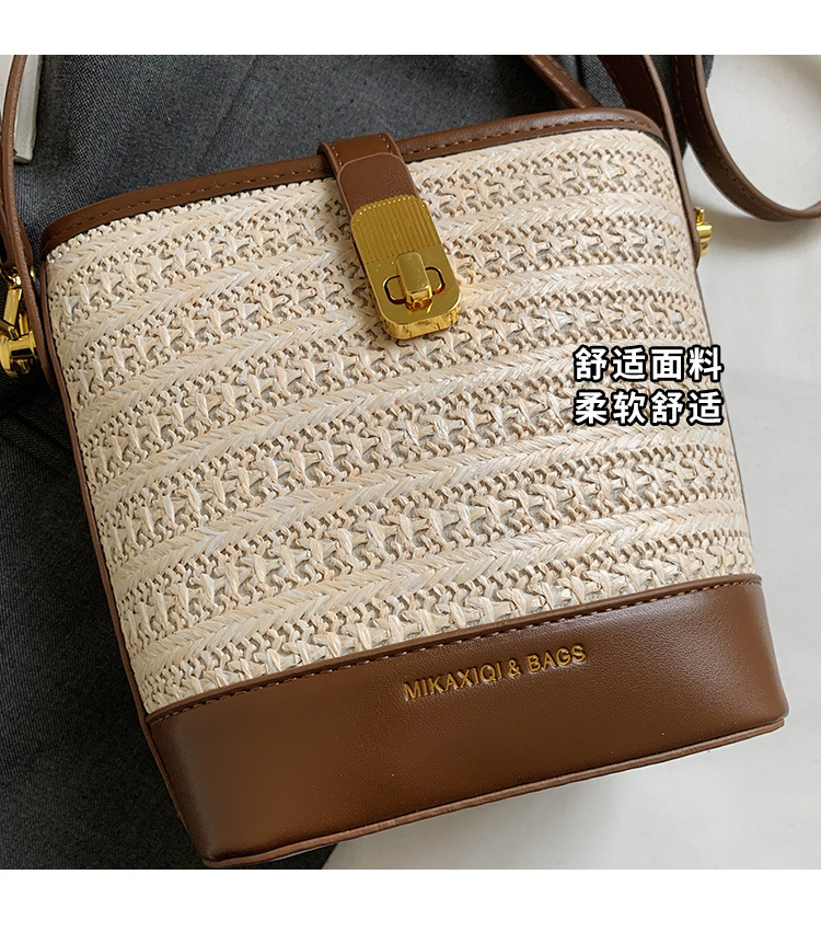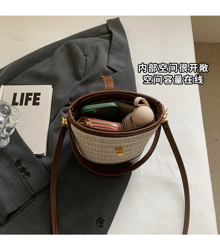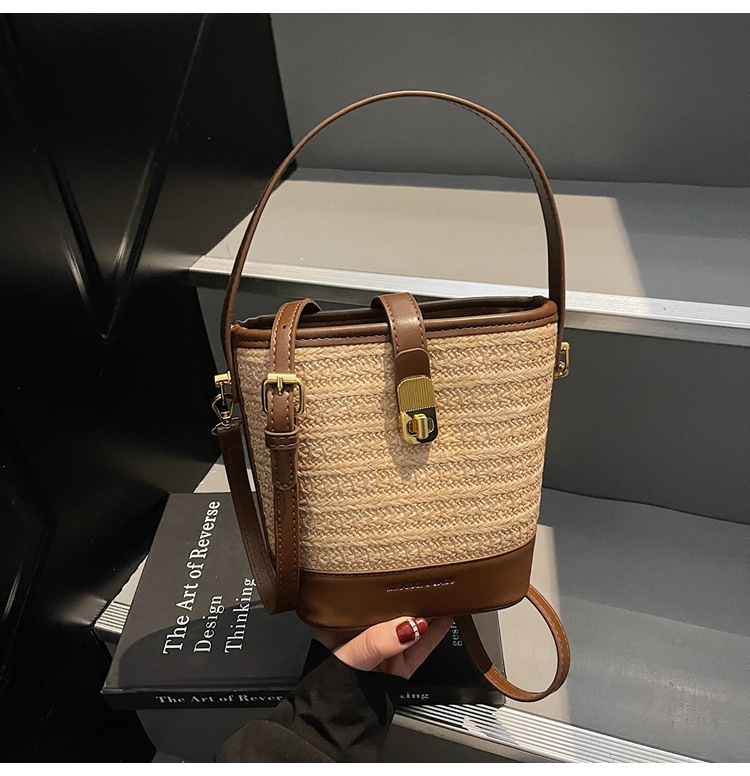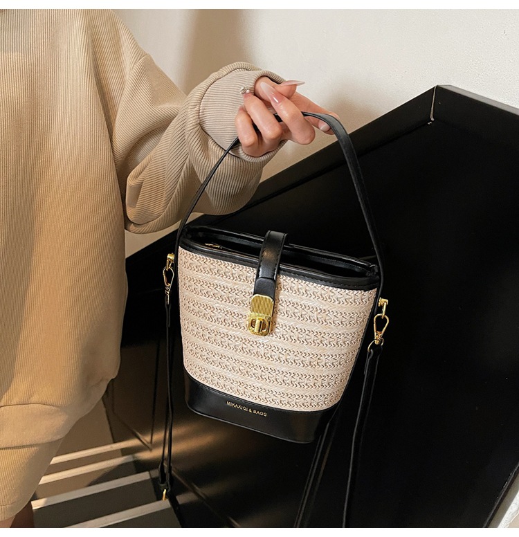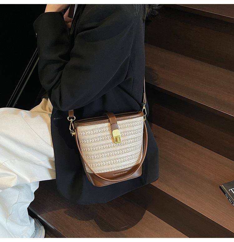 Bolso de cubo de paja de mano popular de verano 2025 nuevo bolso de mensajero tejido de vacaciones junto al mar con textura bolso femenino de todo fósforo