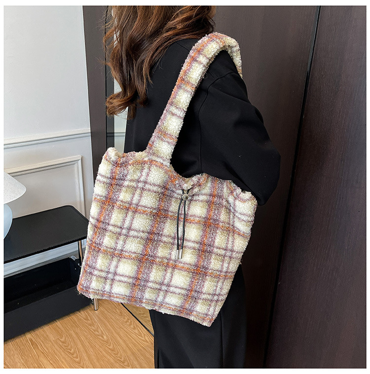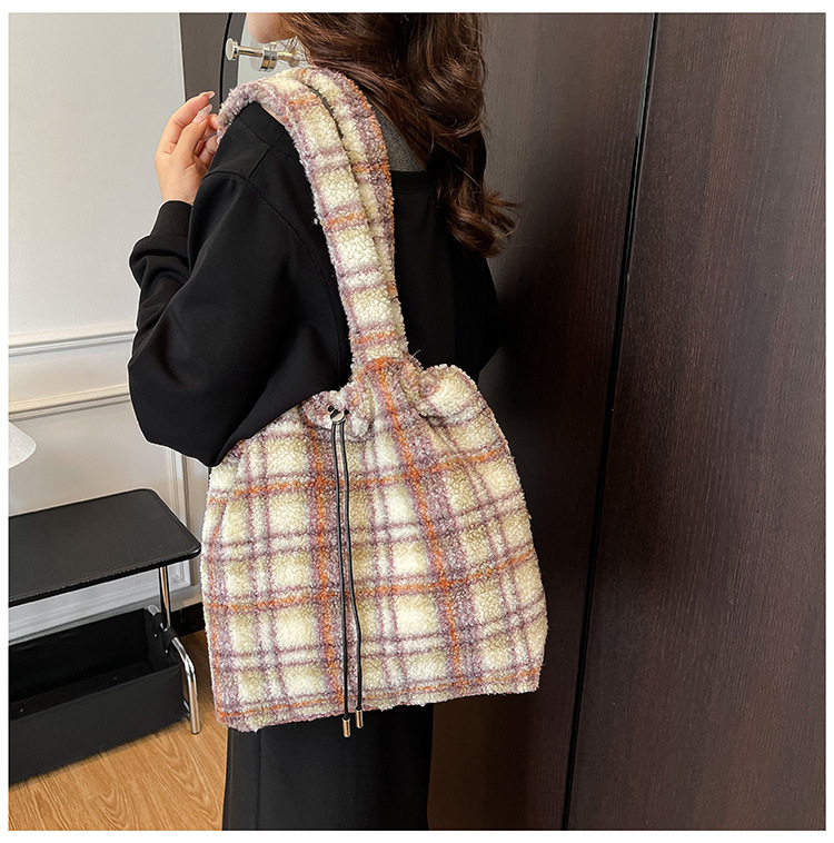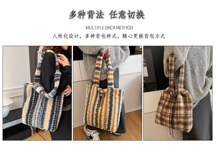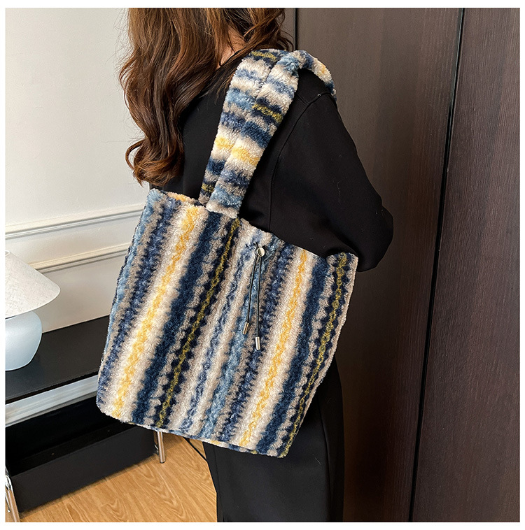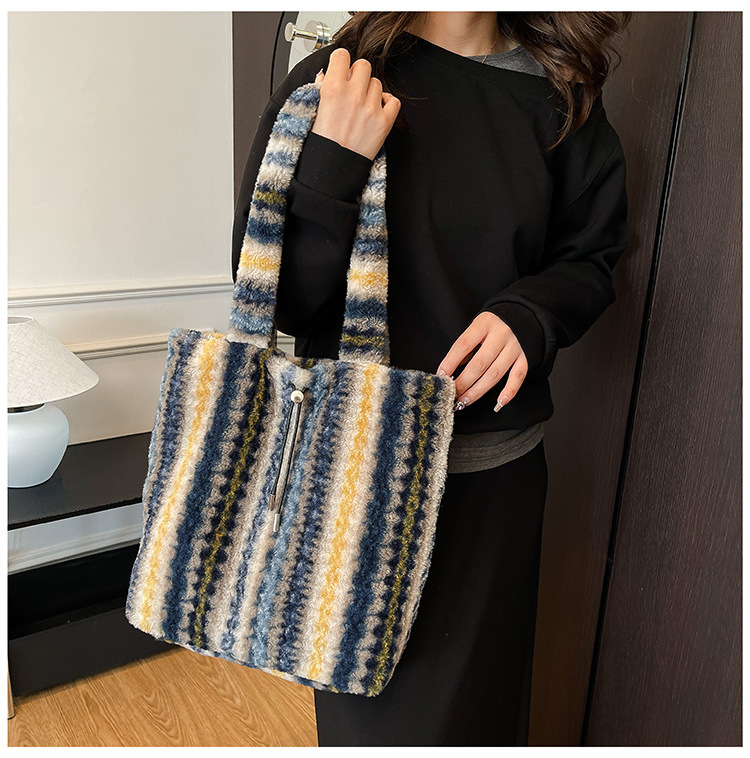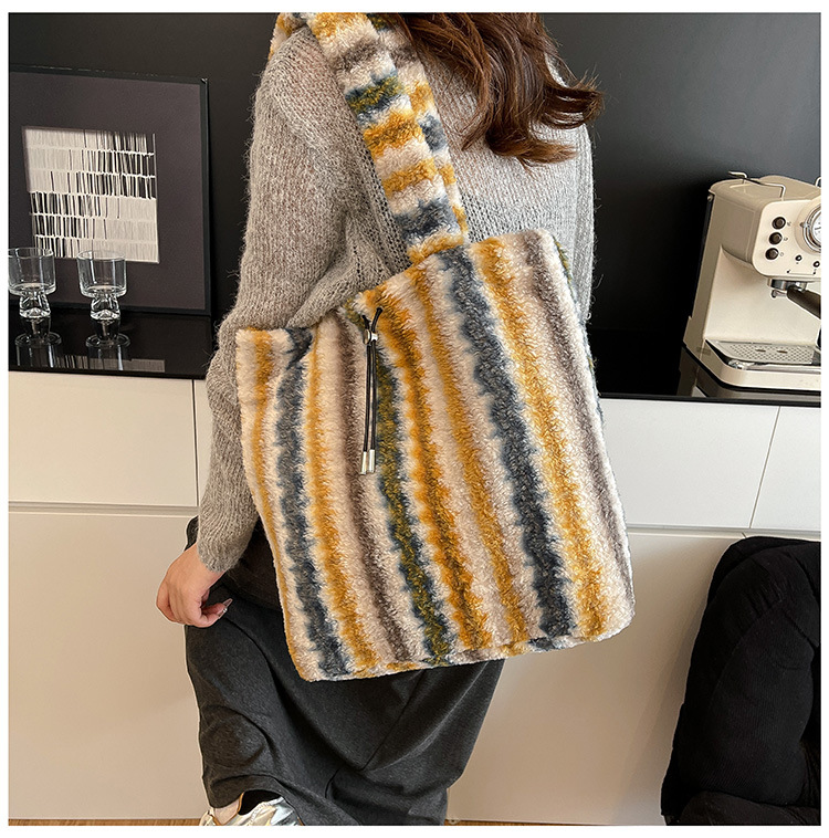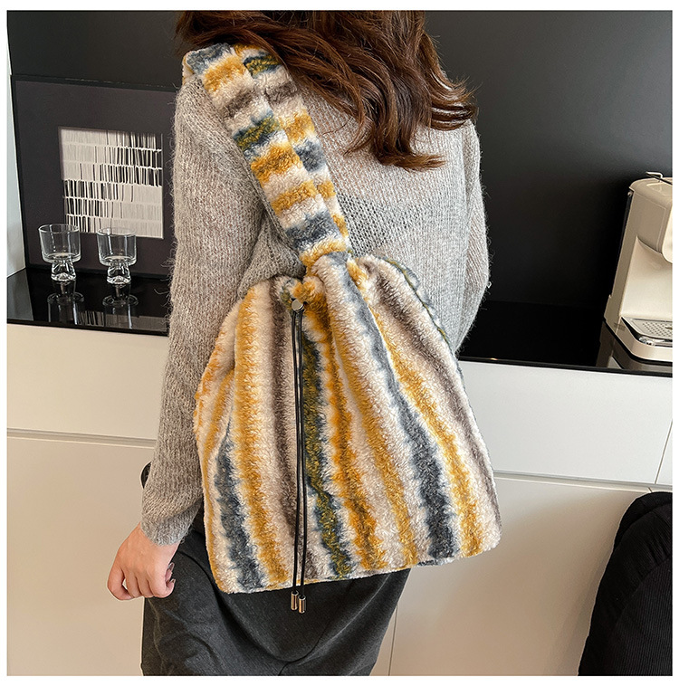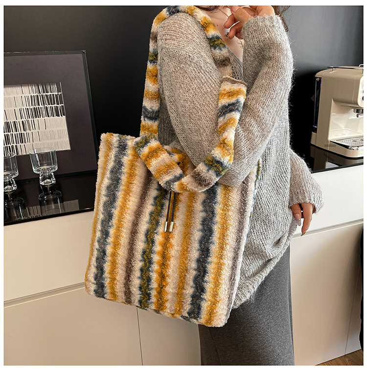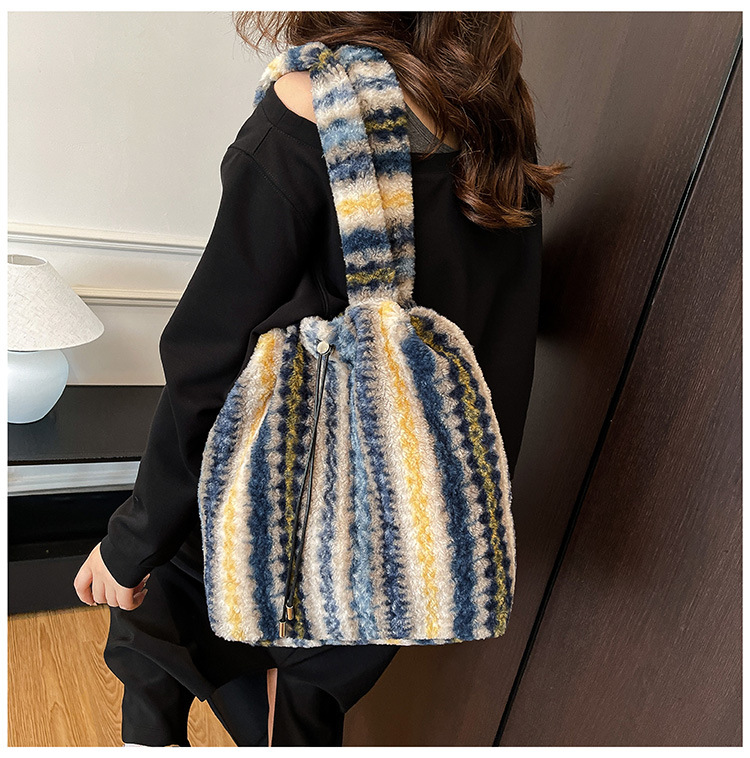 2025 otoño y invierno nuevo bolso de balde de peluche a rayas bolso de hombro de gran capacidad para mujeres bolso de brazo de transporte