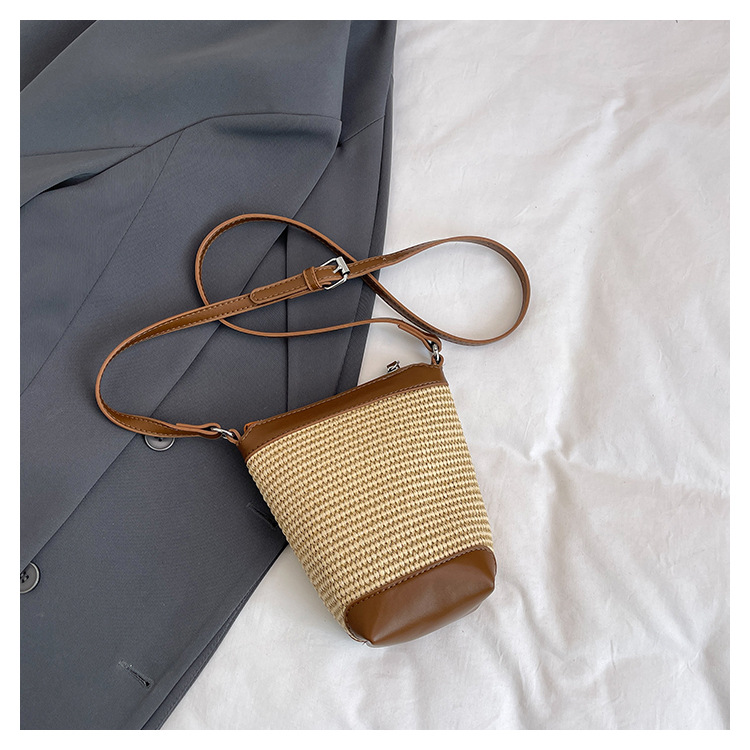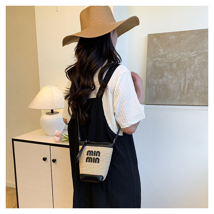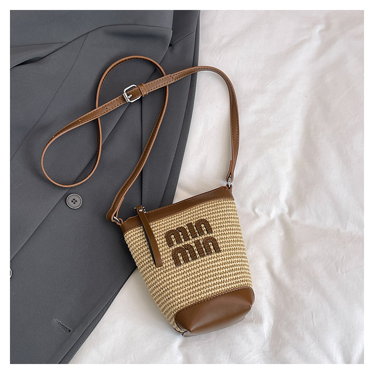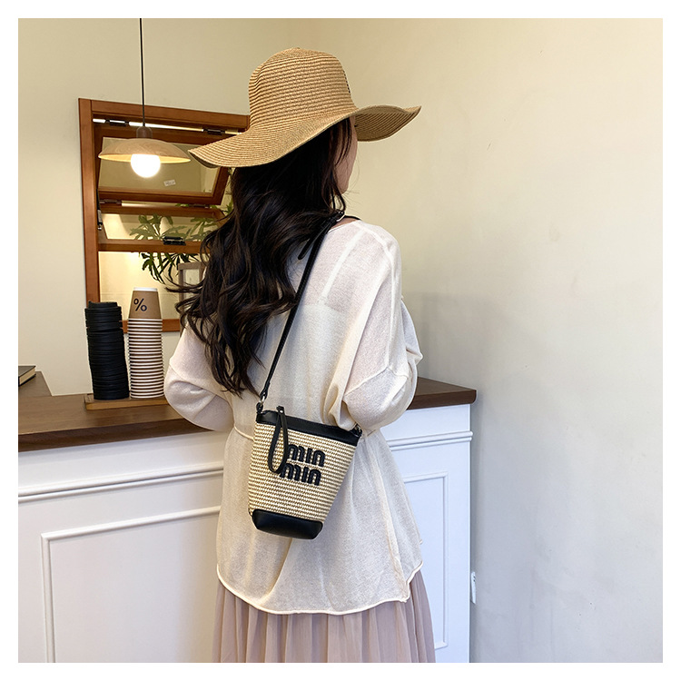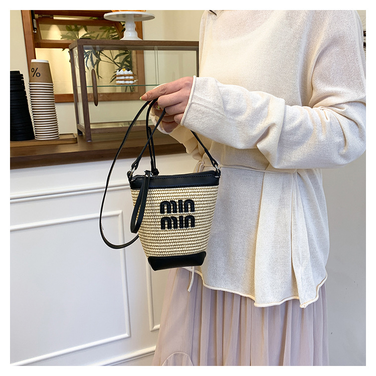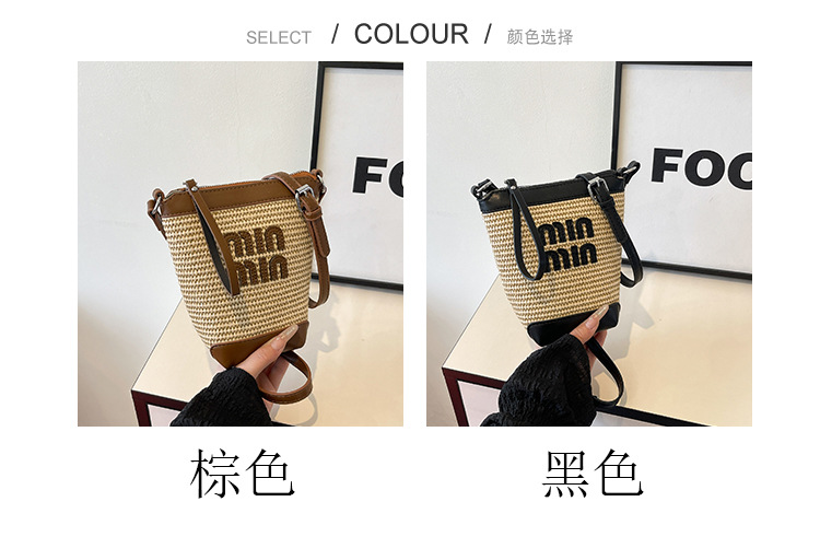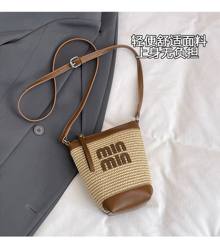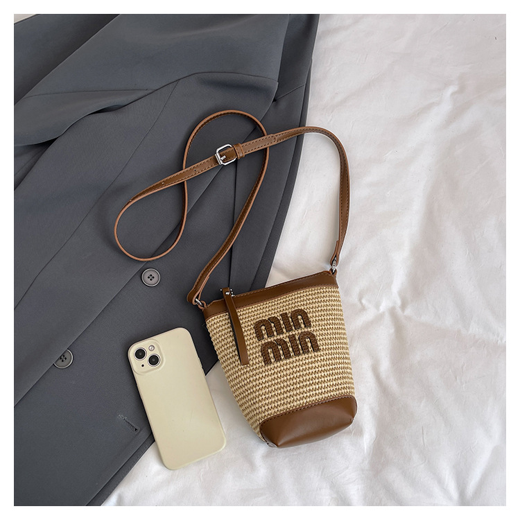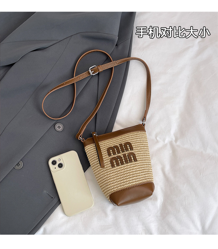 Bolso de teléfono móvil tejido de paja de color de contraste de moda para mujer 2025 nuevo bolso de cubo de primavera de moda bolso diagonal de un solo hombro para mujer