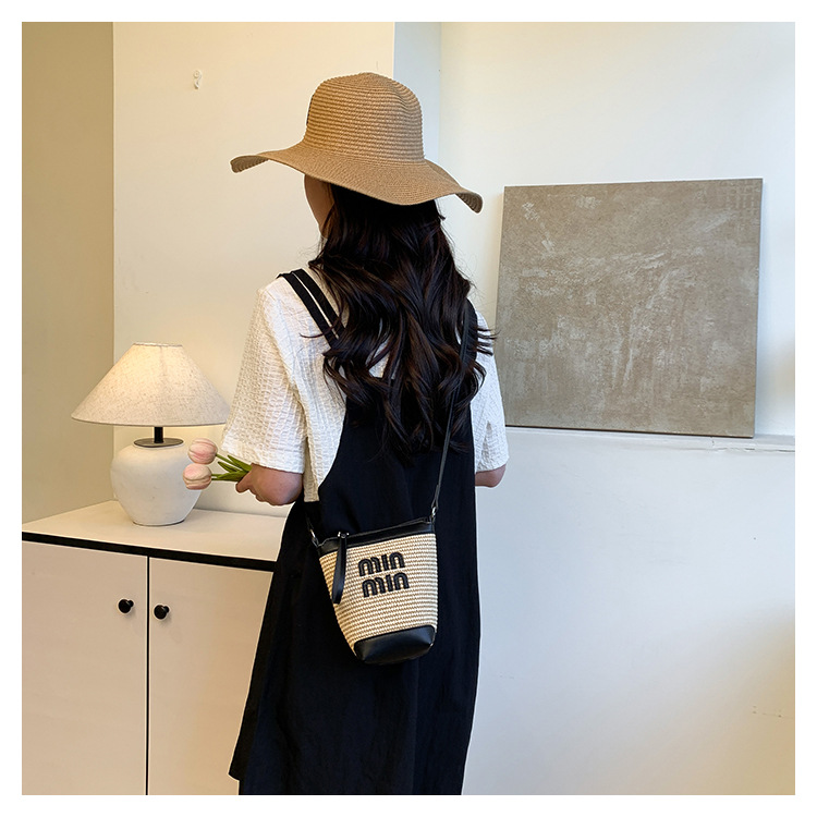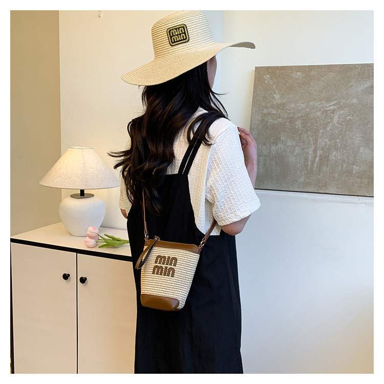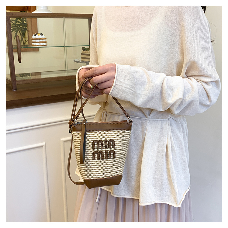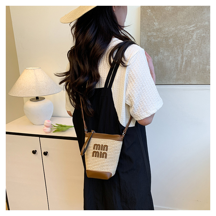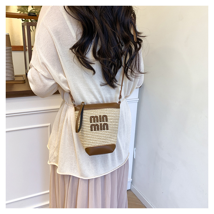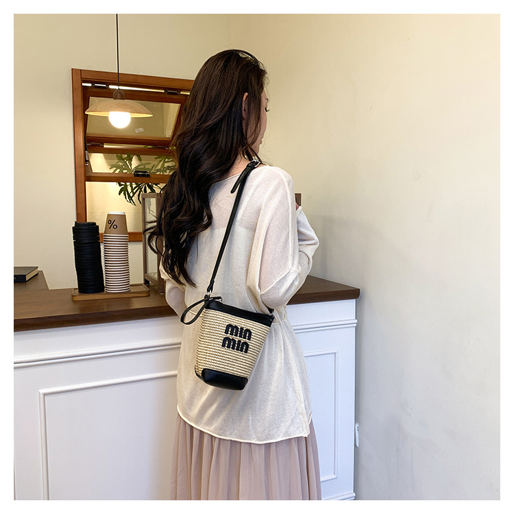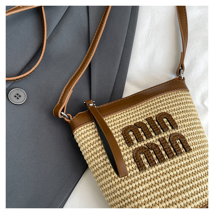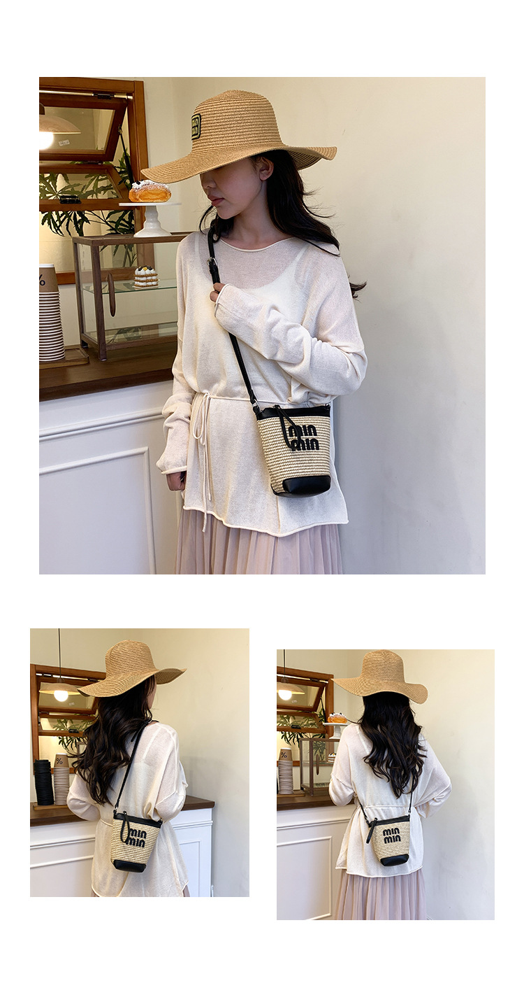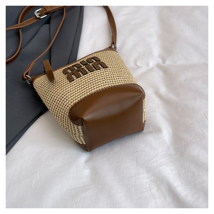 Bolso de teléfono móvil tejido de paja de color de contraste de moda para mujer 2025 nuevo bolso de cubo de primavera de moda bolso diagonal de un solo hombro para mujer