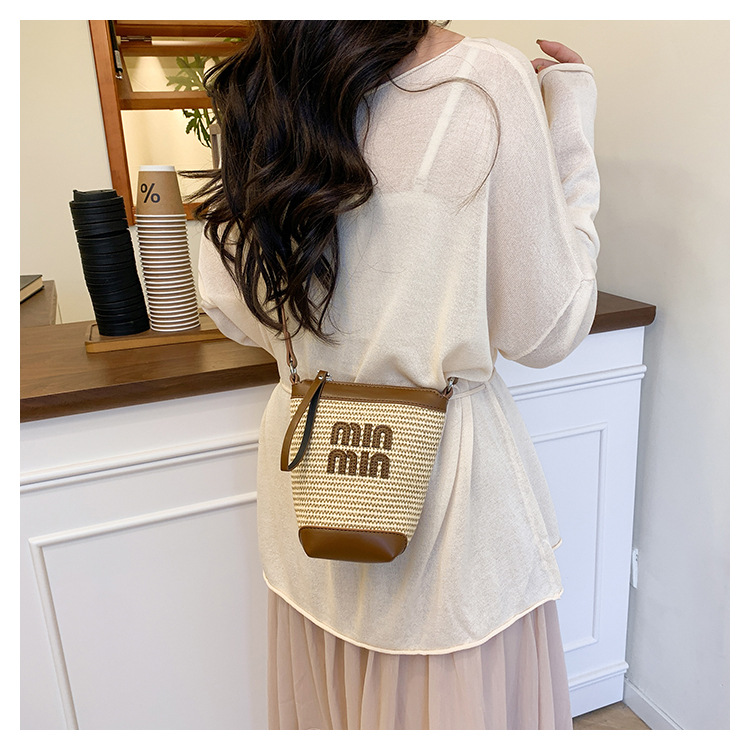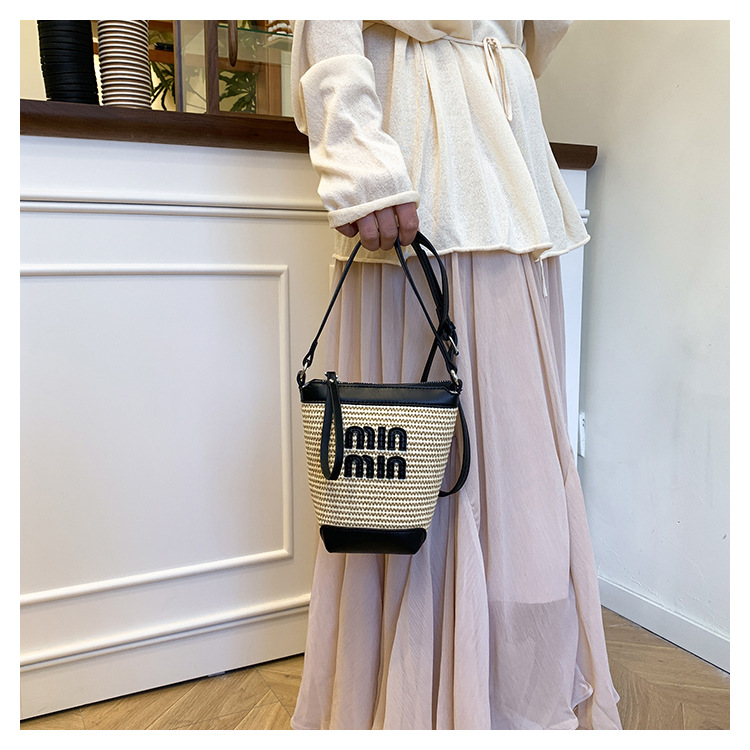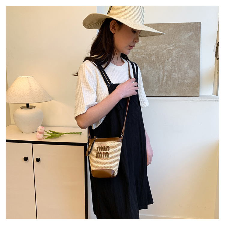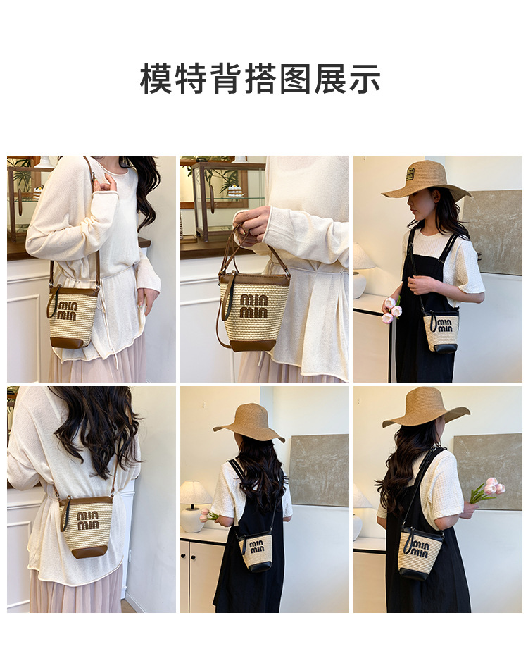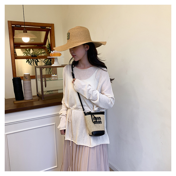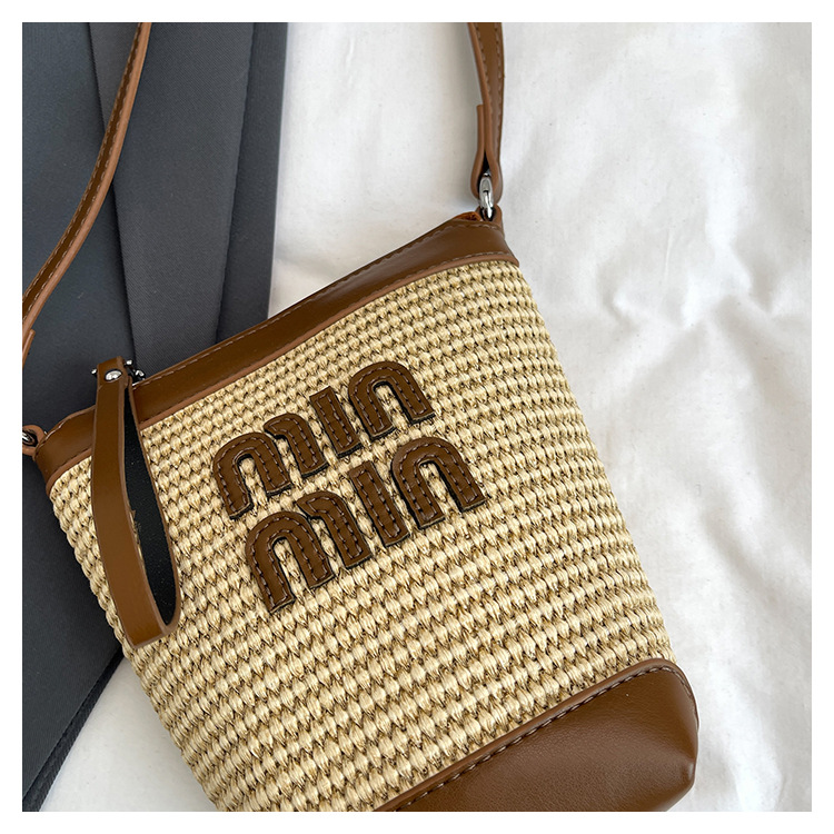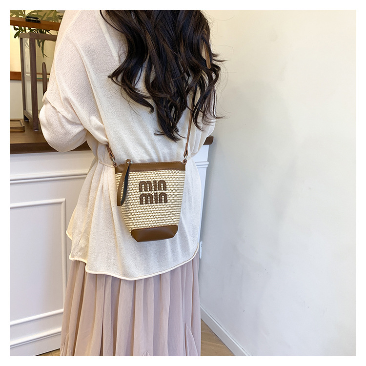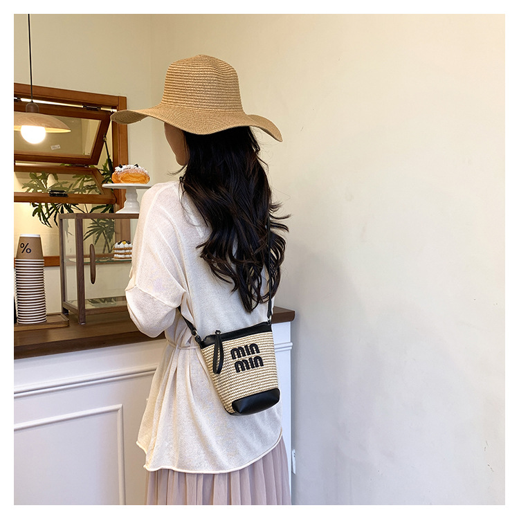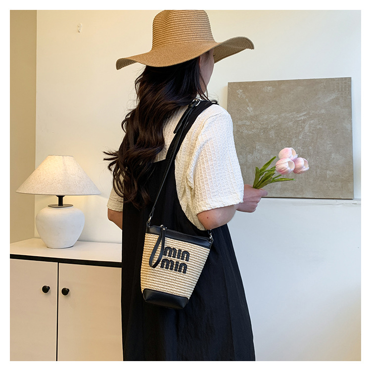 Bolso de teléfono móvil tejido de paja de color de contraste de moda para mujer 2025 nuevo bolso de cubo de primavera de moda bolso diagonal de un solo hombro para mujer