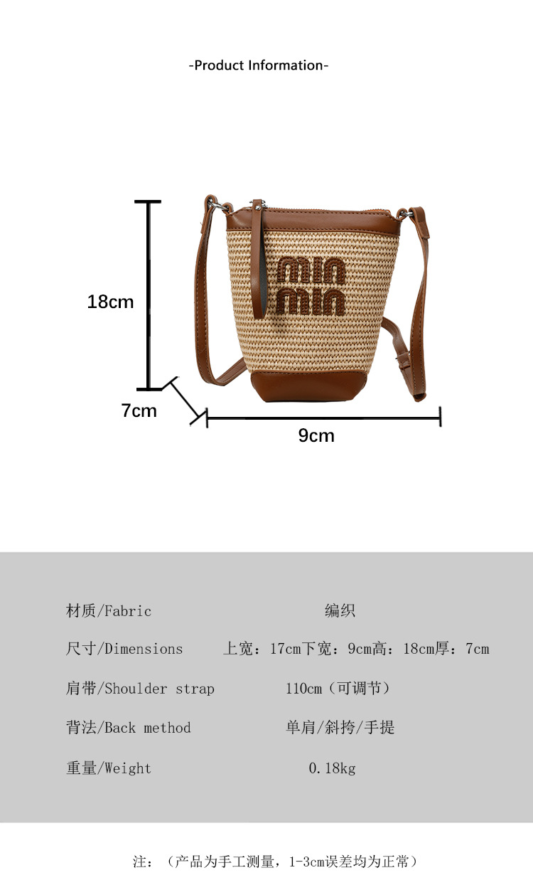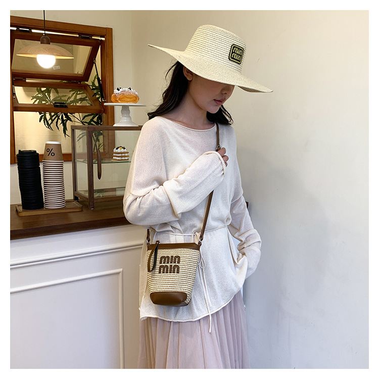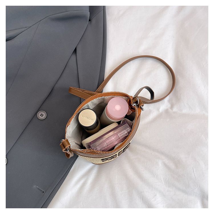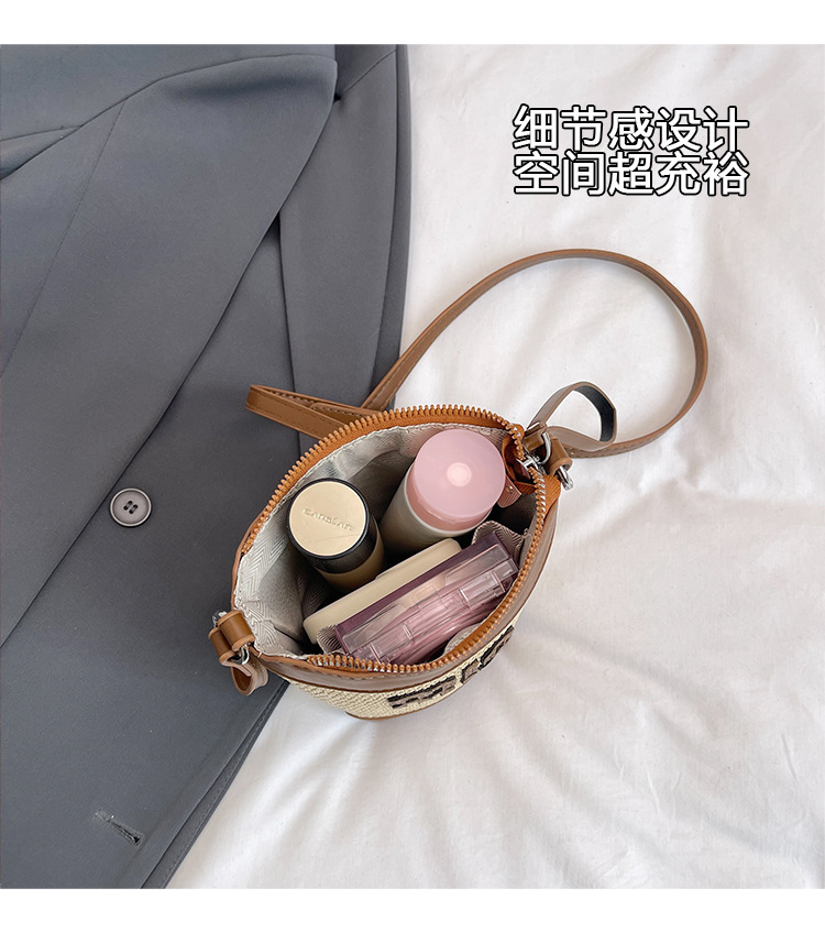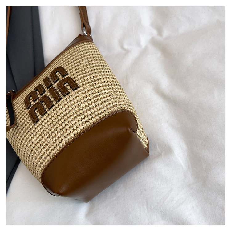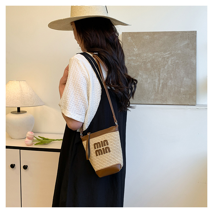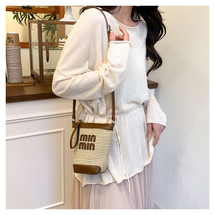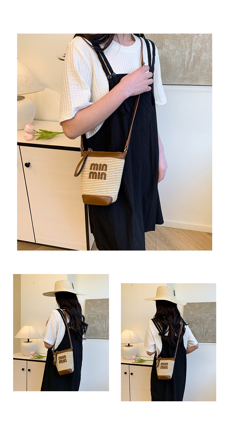 Bolso de teléfono móvil tejido de paja de color de contraste de moda para mujer 2025 nuevo bolso de cubo de primavera de moda bolso diagonal de un solo hombro para mujer