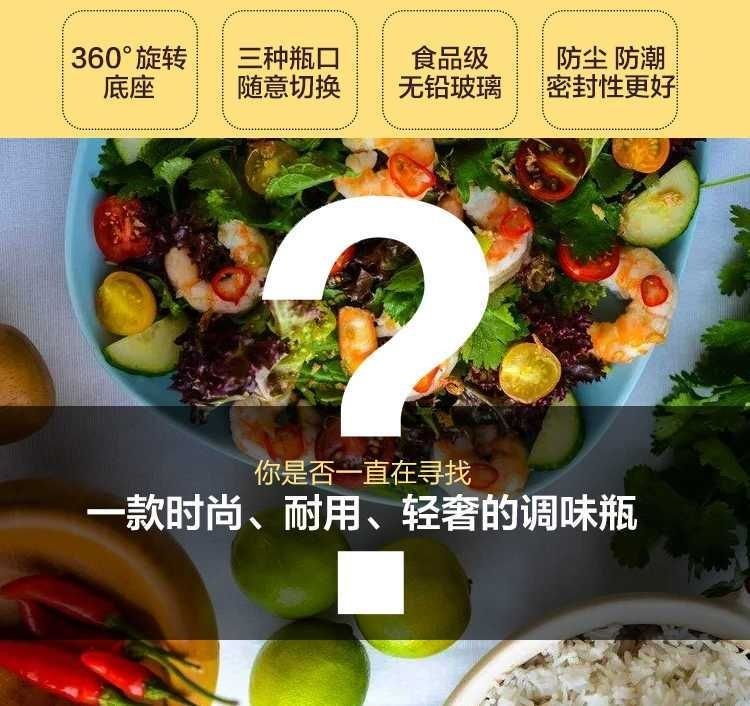 | Especificaciones | Actualizado 7 conjuntos [6 botellas + 1 base], botella de condimento única, cinco botellas de condimento |