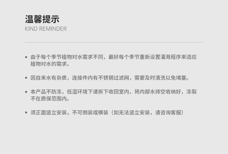 | Especificaciones | 中文单出口(含电池接头),【可控雨感】中文单出口(含电池接头),中文双出口(含电池接头),【可控雨感】中文双出口(含电池接头),中文单出口+插地两用喷头5米5组,中文单出口+插地两用喷头10米10组,中文单出口+插地两用喷头15米15组,中文单出口+插地两用喷头20米20组,中文单出口+插地两用喷头25米25组,中文单出口+插地两用喷头30米30组,中文单出口+插地两用喷头40米40组,中文单出口+插地两用喷头50米50组,中文单出口+万向铜嘴喷头5米5组,中文单出口+万向铜嘴喷头10米10组,中文单出口+万向铜嘴喷头15米15组,中文单出口+万向铜嘴喷头20米20组,中文单出口+万向铜嘴喷头25米25组,中文单出口+万向铜嘴喷头30米30组,中文单出口+万向铜嘴喷头40米40组,中文单出口+万向铜嘴喷头50米50组,【可控雨感】中文单出口+插地两用喷头5米5组,【可控雨感】中文单出口+插地两用喷头10米10组,【可控雨感】中文单出口+插地两用喷头15米15组,【可控雨感】中文单出口+插地两用喷头20米20组,【可控雨感】中文单出口+插地两用喷头25米25组,【可控雨感】中文单出口+插地两用喷头30米30组,【可控雨感】中文单出口+插地两用喷头40米40组,【可控雨感】中文单出口+插地两用喷头50米50组,【可控雨感】中文单出口+万向铜嘴喷头5米5组,【可控雨感】中文单出口+万向铜嘴喷头10米10组,【可控雨感】中文单出口+万向铜嘴喷头15米15组,【可控雨感】中文单出口+万向铜嘴喷头20米20组,【可控雨感】中文单出口+万向铜嘴喷头25米25组,【可控雨感】中文单出口+万向铜嘴喷头30米30组,【可控雨感】中文单出口+万向铜嘴喷头40米40组,【可控雨感】中文单出口+万向铜嘴喷头50米50组,中文双出口+插地两用喷头20米20组,中文双出口+插地两用喷头30米30组,中文双出口+插地两用喷头40米40组,中文双出口+插地两用喷头50米50组,中文双出口+万向铜嘴喷头20米20组,中文双出口+万向铜嘴喷头30米30组,中文双出口+万向铜嘴喷头40米40组,中文双出口+万向铜嘴喷头50米50组,【可控雨感】中文双出口+插地两用喷头20米20组,【可控雨感】中文双出口+插地两用喷头30米30组,【可控雨感】中文双出口+插地两用喷头40米40组,【可控雨感】中文双出口+插地两用喷头50米50组,【可控雨感】中文双出口+万向铜嘴喷头20米20组,【可控雨感】中文双出口+万向铜嘴喷头30米30组,【可控雨感】中文双出口+万向铜嘴喷头40米40组,【可控雨感】中文双出口+万向铜嘴喷头50米50组 |