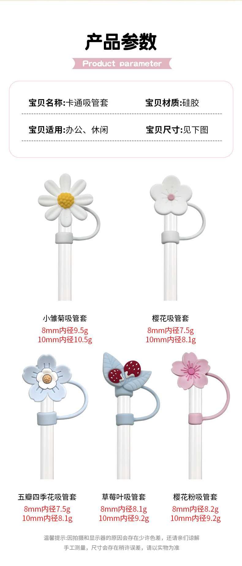 | Color | hojas de fresa, cinco flores de cuatro estaciones, margaritas, flores de cerezo, polen de cerezo |