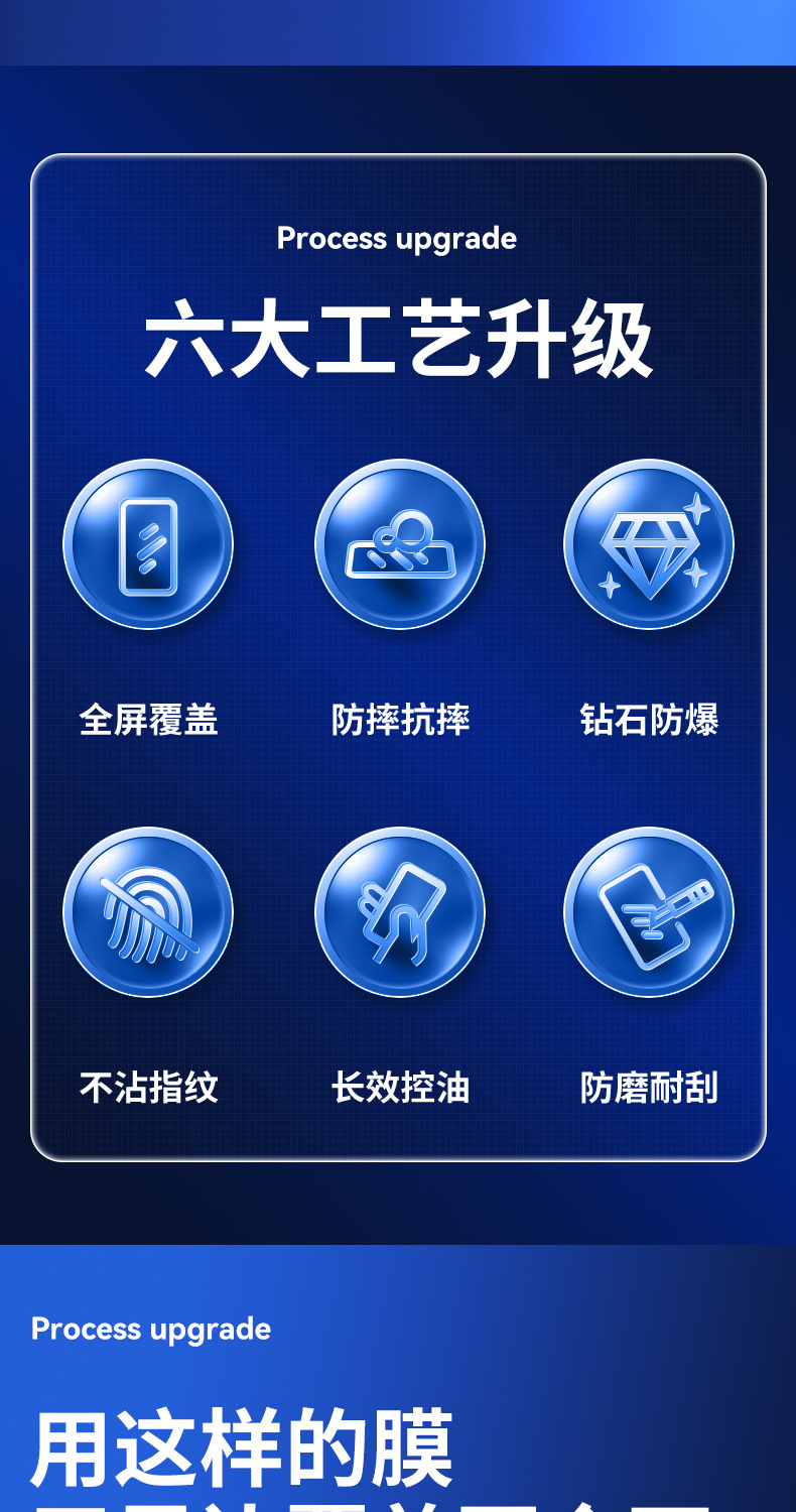 | Características de la película | Protección radiológica,HD,A prueba de explosiones,A prueba de polvo,Anti-huella dactilar,Anti-caída,Pantalla completa,Reparación automática,Pantalla no completa,Segunda caja de pegatina |
