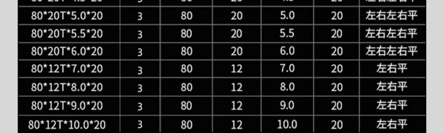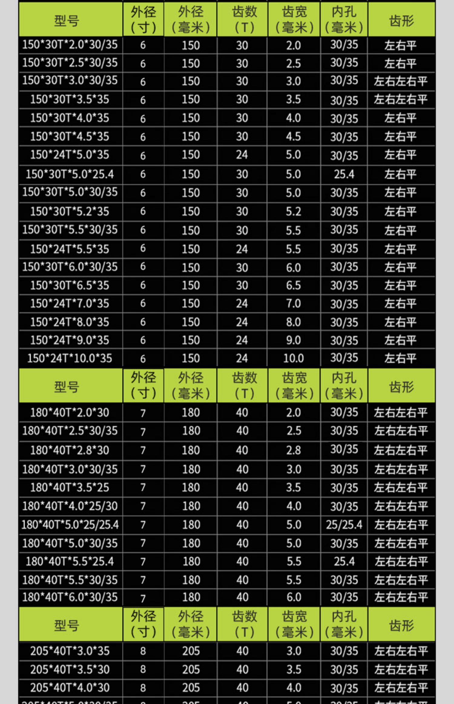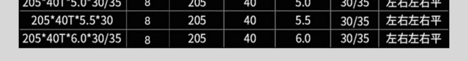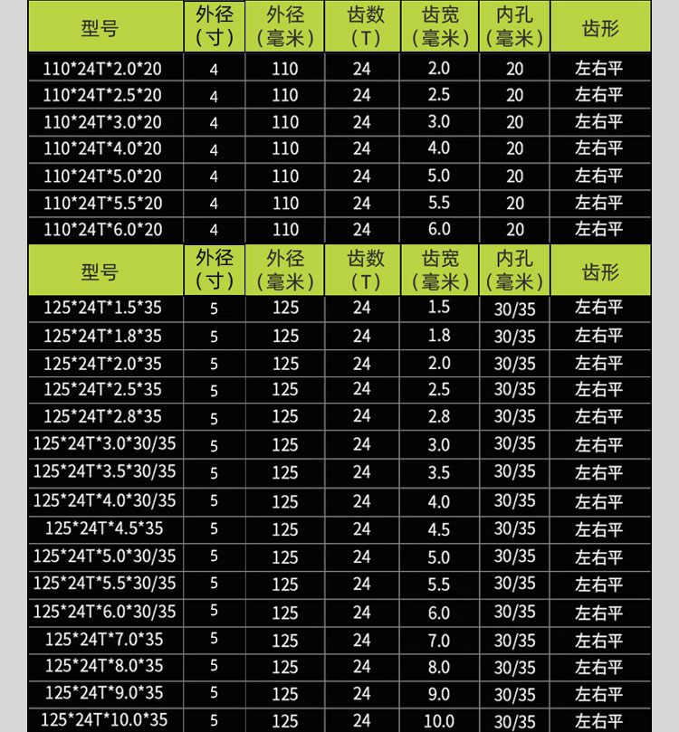 | Modelo | 24年工厂,品质更稳定,下面有外径110、125、150、180、205,进口合金 更锋利、更耐用,外径80*20齿*齿宽1.2毫米*孔20,外径80*20齿*齿宽1.5毫米*孔20,外径80*20齿*齿宽1.8毫米*孔20,外径80*20齿*齿宽2毫米*孔20,外径80*20齿*齿宽2.5毫米*孔20,外径80*20齿*齿宽3毫米*孔20,外径80*20齿*齿宽3.5毫米*孔20,外径80*20齿*齿宽4毫米*孔20,外径80*20齿*齿宽4.5毫米*孔20,外径80*20齿*齿宽5毫米*孔20,外径80*20齿*齿宽5.5毫米*孔20,外径80*12齿*齿宽8毫米*孔20,外径80*12齿*齿宽9毫米*孔20,外径80*12齿*齿宽10*孔20(mm),外径110*24齿*齿宽2毫米*孔20,外径110*24齿*齿宽2.5毫米*孔20,外径110*24齿*齿宽3毫米*孔20,外径110*24齿*齿宽4毫米*孔20,外径110*24齿*齿宽5毫米*孔20,外径110*24齿*齿宽5.5毫米*孔20,外径110*24齿*齿宽6毫米*孔20,外径110*24齿*齿宽6毫米*孔35,浅棕色外径110*30齿*齿宽1.2毫米*孔20,栗色外径110*30齿*齿宽2.2*孔30(mm,咖啡色外径110*30齿*齿宽2.2*孔35(mm,外径125*24齿*齿宽1.5毫米*孔35,外径125*24齿*齿宽1.8毫米*孔35,米白色125*24T*齿宽2毫米*孔35,浅灰色125*24T*齿宽2.5毫米*孔35,灰色125*24T*齿宽3毫米*孔30,银色125*24T*齿宽3毫米*孔35,桔红色125*24T*齿宽3.5毫米*孔35,粉红色125*24T*齿宽4毫米*孔35,红色125*24T*齿宽4.5毫米*孔30,藕色125*24T*齿宽4.5毫米*孔35,西瓜红125*24T*齿宽5mm*孔30,酒红色125*24T*齿宽5毫米*孔35,卡其色125*24T*齿宽5.5毫米*孔30,姜黄色125*24T*齿宽5.5毫米*孔35,明黄色125*24T*齿宽6毫米*孔30,杏色125*24T*齿宽6毫米*孔35,柠檬黄125*24T*齿宽7毫米*孔35,桔色125*24T*宽8.0*35,巧克力色125*24T*宽9mm*35,浅黄色125*24T*宽10*35,以下为外径150mm——————————,金色150*30T*宽2.0*30,香槟色150*30T*宽2.0*35,黄色150*30T*宽2.5*30,军绿色150*30T*宽2.5*35,墨绿色150*30T*宽3.0*30,浅绿色150*30T*宽3.0*35,绿色150*30T*宽3.5*35,翠绿色150*36T*宽3.5*30,紫罗兰150*30T*宽4.0*30,荧光绿150*30T*宽4.0*35,青色150*30T*宽4.5*35,天蓝色150*36T*宽4.5*30,外径150*30齿*齿宽5*孔25.4(mm),孔雀蓝150*30T*宽5.0*30,宝蓝色150*24T*宽5.0*35,浅蓝色150*30T*宽5.0*35,湖蓝色150*30T*宽5.5*35,蓝色150*24T*宽5.5*35,藏青色150*30T*宽6.0*30,浅紫色150*30T*宽6.0*35,深紫色150*24T*宽7.0*35,紫红色150*30T*宽8mm*35,外径150*24齿*齿宽9.0*孔35(mm),外径150*24齿*齿宽10*孔35(mm),外径180*40齿*齿宽2*孔35(mm),外径180*40齿*齿宽2.5*孔30(mm),外径180*40齿*齿宽2.5*孔35(mm),外径180*40齿*齿宽3*孔35(mm),外径180*40齿*齿宽4.0*孔25.4(mm),外径180*40齿*齿宽4.0*孔30(mm),外径180*40齿*齿宽4.0*孔35(mm),透明外径180*36齿*齿宽5*孔25.4(mm),外径180*40齿*齿宽5.0*孔30(mm),外径180*40齿*齿宽5.0*孔35(mm),花色外径180*40齿*齿宽5.5*孔25.4,外径180*40齿*齿宽5.5*孔30(mm),外径180*40齿*齿宽5.5*孔35(mm),驼色外径180*40齿*齿宽6*孔25.4,外径180*40齿*齿宽6.0*孔30(mm),外径180*40齿*齿宽6.0*孔35(mm),外径205*40齿*齿宽3*孔35(mm),外径205*40齿*齿宽3.5*孔30(mm),外径205*40齿*齿宽3.5*孔35(mm),外径205*40齿*齿宽4*孔30(mm),外径205*40齿*齿宽5*孔30(mm),外径205*40齿*齿宽5*孔35(mm),外径205*40齿*齿宽5.5*孔30(mm),外径205*40齿*齿宽6*孔30(mm) |