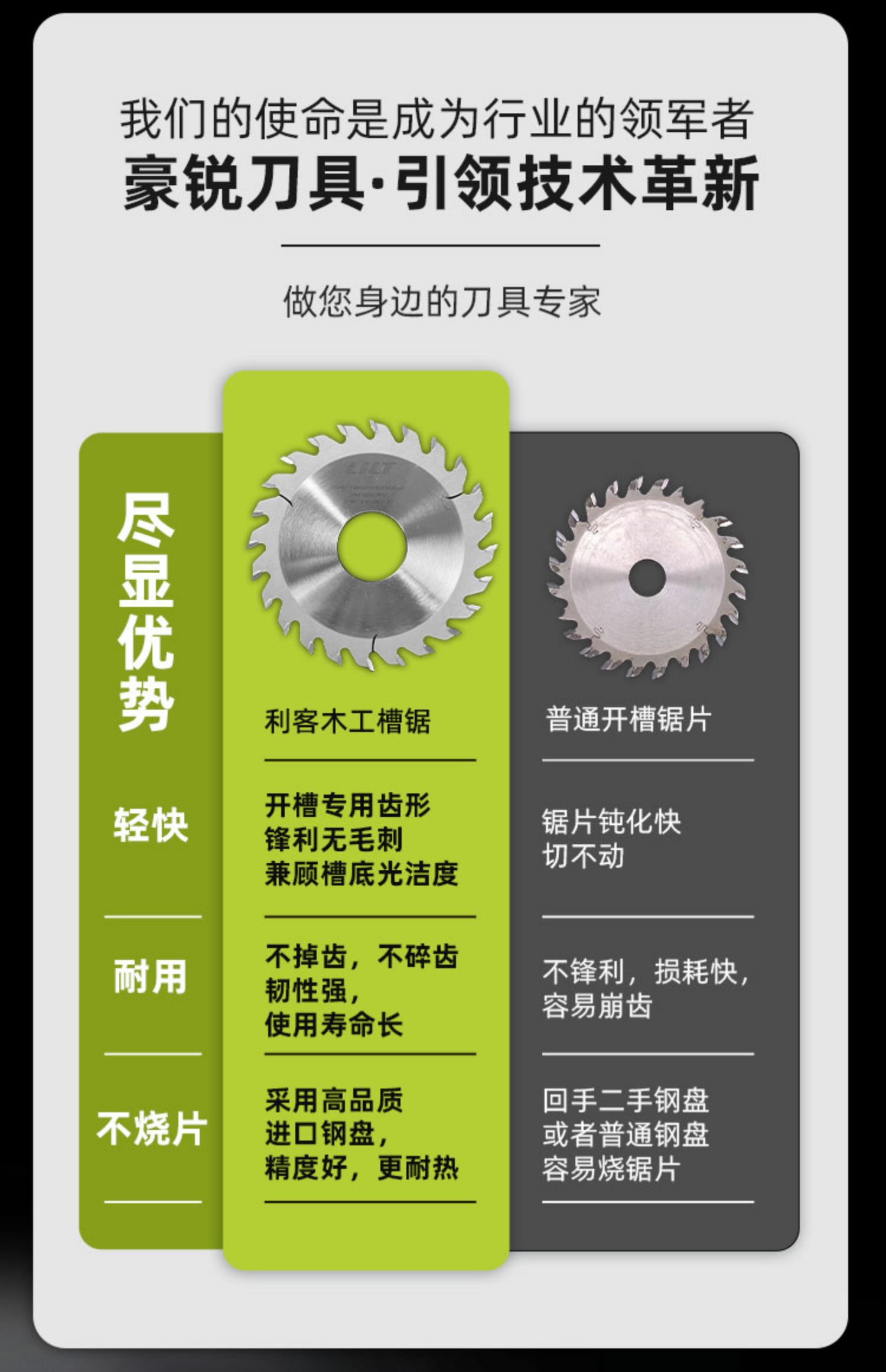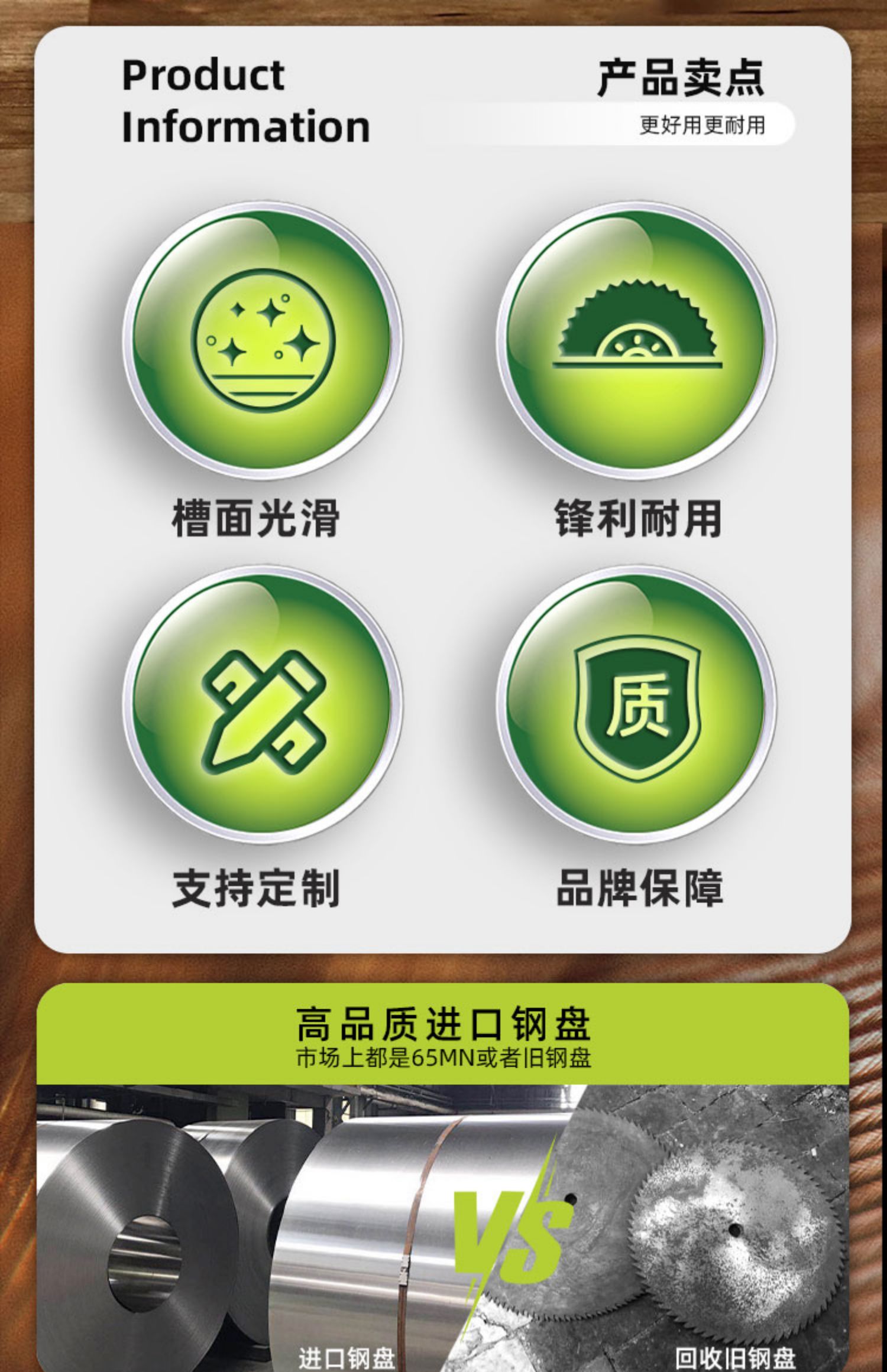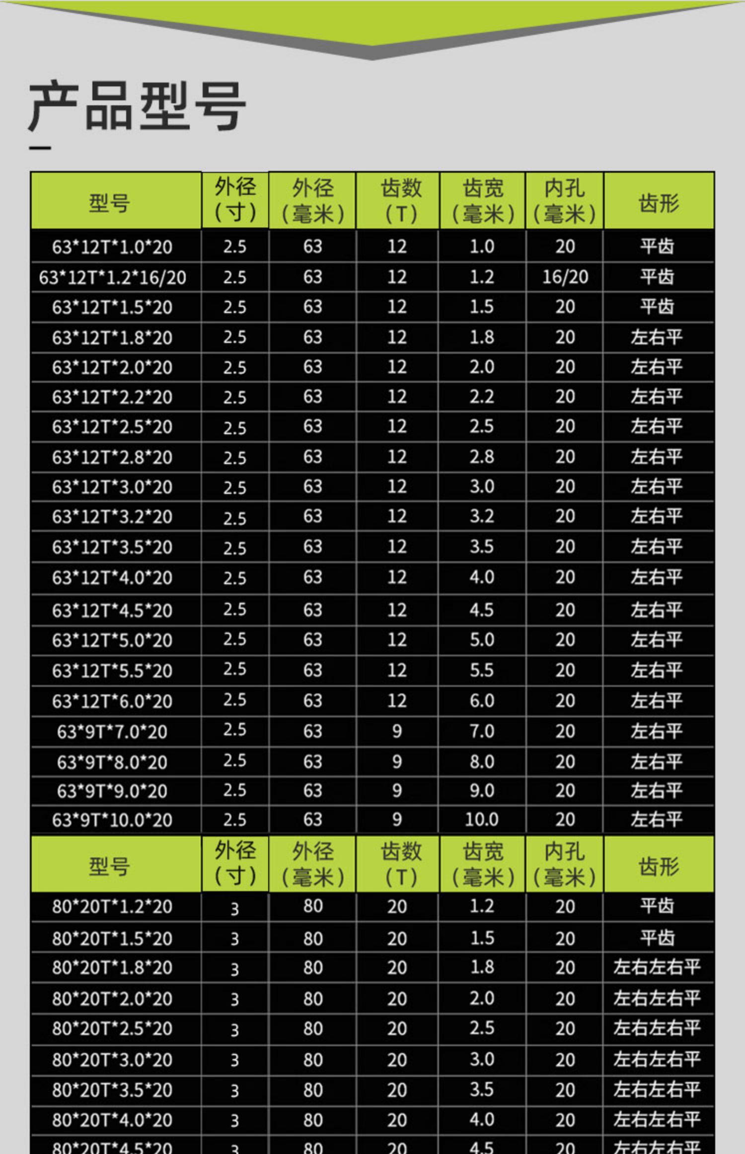 | Modelo | 24年工厂,品质更稳定,下面有外径110、125、150、180、205,进口合金 更锋利、更耐用,外径80*20齿*齿宽1.2毫米*孔20,外径80*20齿*齿宽1.5毫米*孔20,外径80*20齿*齿宽1.8毫米*孔20,外径80*20齿*齿宽2毫米*孔20,外径80*20齿*齿宽2.5毫米*孔20,外径80*20齿*齿宽3毫米*孔20,外径80*20齿*齿宽3.5毫米*孔20,外径80*20齿*齿宽4毫米*孔20,外径80*20齿*齿宽4.5毫米*孔20,外径80*20齿*齿宽5毫米*孔20,外径80*20齿*齿宽5.5毫米*孔20,外径80*12齿*齿宽8毫米*孔20,外径80*12齿*齿宽9毫米*孔20,外径80*12齿*齿宽10*孔20(mm),外径110*24齿*齿宽2毫米*孔20,外径110*24齿*齿宽2.5毫米*孔20,外径110*24齿*齿宽3毫米*孔20,外径110*24齿*齿宽4毫米*孔20,外径110*24齿*齿宽5毫米*孔20,外径110*24齿*齿宽5.5毫米*孔20,外径110*24齿*齿宽6毫米*孔20,外径110*24齿*齿宽6毫米*孔35,浅棕色外径110*30齿*齿宽1.2毫米*孔20,栗色外径110*30齿*齿宽2.2*孔30(mm,咖啡色外径110*30齿*齿宽2.2*孔35(mm,外径125*24齿*齿宽1.5毫米*孔35,外径125*24齿*齿宽1.8毫米*孔35,米白色125*24T*齿宽2毫米*孔35,浅灰色125*24T*齿宽2.5毫米*孔35,灰色125*24T*齿宽3毫米*孔30,银色125*24T*齿宽3毫米*孔35,桔红色125*24T*齿宽3.5毫米*孔35,粉红色125*24T*齿宽4毫米*孔35,红色125*24T*齿宽4.5毫米*孔30,藕色125*24T*齿宽4.5毫米*孔35,西瓜红125*24T*齿宽5mm*孔30,酒红色125*24T*齿宽5毫米*孔35,卡其色125*24T*齿宽5.5毫米*孔30,姜黄色125*24T*齿宽5.5毫米*孔35,明黄色125*24T*齿宽6毫米*孔30,杏色125*24T*齿宽6毫米*孔35,柠檬黄125*24T*齿宽7毫米*孔35,桔色125*24T*宽8.0*35,巧克力色125*24T*宽9mm*35,浅黄色125*24T*宽10*35,以下为外径150mm——————————,金色150*30T*宽2.0*30,香槟色150*30T*宽2.0*35,黄色150*30T*宽2.5*30,军绿色150*30T*宽2.5*35,墨绿色150*30T*宽3.0*30,浅绿色150*30T*宽3.0*35,绿色150*30T*宽3.5*35,翠绿色150*36T*宽3.5*30,紫罗兰150*30T*宽4.0*30,荧光绿150*30T*宽4.0*35,青色150*30T*宽4.5*35,天蓝色150*36T*宽4.5*30,外径150*30齿*齿宽5*孔25.4(mm),孔雀蓝150*30T*宽5.0*30,宝蓝色150*24T*宽5.0*35,浅蓝色150*30T*宽5.0*35,湖蓝色150*30T*宽5.5*35,蓝色150*24T*宽5.5*35,藏青色150*30T*宽6.0*30,浅紫色150*30T*宽6.0*35,深紫色150*24T*宽7.0*35,紫红色150*30T*宽8mm*35,外径150*24齿*齿宽9.0*孔35(mm),外径150*24齿*齿宽10*孔35(mm),外径180*40齿*齿宽2*孔35(mm),外径180*40齿*齿宽2.5*孔30(mm),外径180*40齿*齿宽2.5*孔35(mm),外径180*40齿*齿宽3*孔35(mm),外径180*40齿*齿宽4.0*孔25.4(mm),外径180*40齿*齿宽4.0*孔30(mm),外径180*40齿*齿宽4.0*孔35(mm),透明外径180*36齿*齿宽5*孔25.4(mm),外径180*40齿*齿宽5.0*孔30(mm),外径180*40齿*齿宽5.0*孔35(mm),花色外径180*40齿*齿宽5.5*孔25.4,外径180*40齿*齿宽5.5*孔30(mm),外径180*40齿*齿宽5.5*孔35(mm),驼色外径180*40齿*齿宽6*孔25.4,外径180*40齿*齿宽6.0*孔30(mm),外径180*40齿*齿宽6.0*孔35(mm),外径205*40齿*齿宽3*孔35(mm),外径205*40齿*齿宽3.5*孔30(mm),外径205*40齿*齿宽3.5*孔35(mm),外径205*40齿*齿宽4*孔30(mm),外径205*40齿*齿宽5*孔30(mm),外径205*40齿*齿宽5*孔35(mm),外径205*40齿*齿宽5.5*孔30(mm),外径205*40齿*齿宽6*孔30(mm) |