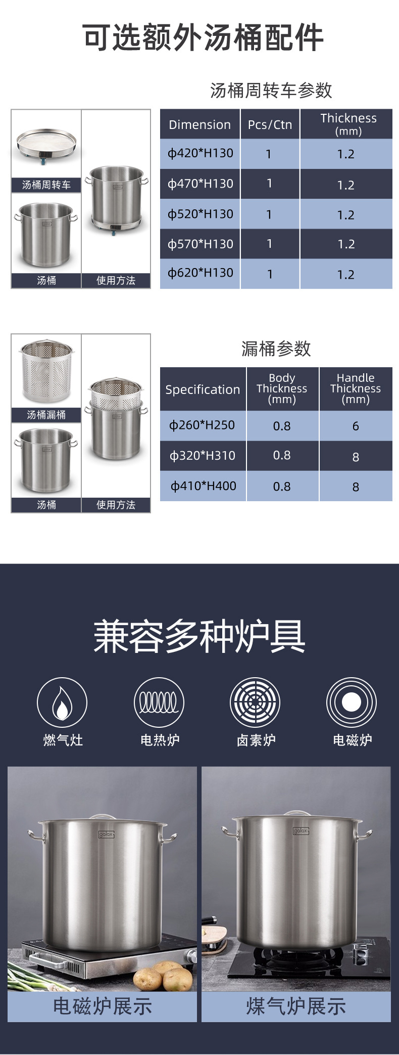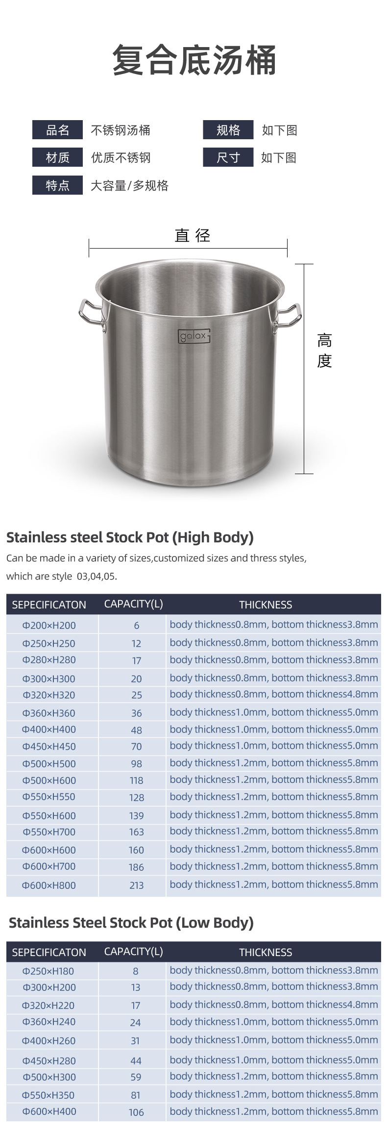 | Especificaciones | Para 8 personas Φ 200 * H200 (6L) recomendado para el hogar, para 16 personas Φ 250 * H250 (12L) venta preferencial recomendado para el hogar, para 25 personas Φ 280 * H280 (17L) recomendado para el hogar, para 35 personas Φ 300 * H300 (20L), para 45 personas Φ 320 * H320 (25L), para 55 personas Φ 360 * H360 (36L), para la cocina de comedor comercial Φ 400 * H400 (48L), cocina de comedor comercial Φ 450 * H450 (70L), cocina de comedor comercial Φ 500 * H500 (98L), cocina de comedor comercial Φ 500 * H600 (118L), cocina de comedor comercial Φ 550 * H550 (131L), cocina de comedor comercial Φ 550 * H600 (143L), cocina de comedor comercial Φ 600 * H600 (160L), cocina de comedor comercial Φ 600 * H800 (213L), Para 16 personas Φ 250 * H180 (8L) recomendado para el hogar, para 25 personas Φ 300 * H200 (13L) recomendado para el hogar, cocina de comedor comercial Φ 320 * H220 (17L), cocina de comedor comercial Φ 360 * H240 (24L), cocina de comedor comercial Φ 400 * H260 (31L), cocina de comedor comercial Φ 450 * H280 (44L), cocina de comedor comercial Φ 500 * H300 (59L), Cocina de comedor comercial Φ 550 * H350 (83L), cocina de comedor comercial Φ 600 * H400 (113L) |