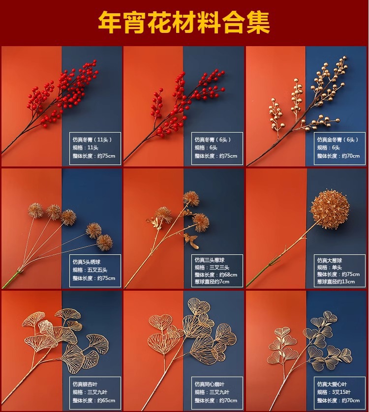 | Color | 1 ginkgo biloba, 1 hibisco de 11 cabezas, 1 eucalia, 1 orquídea de mariposa, 1 hortenida grande, 1 flor de ciruela, 1 loto, 1 hortenida de 5 cabezas, 1 corazón de melocotón, 1 palma dorada, 1 hibisco de 6 horchillas, 1 caqui, 1 neón, 1 flor de llama, 1 fruta del dragón, 1 hortenida de madera |