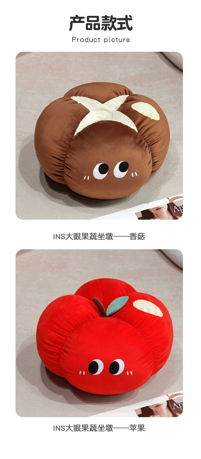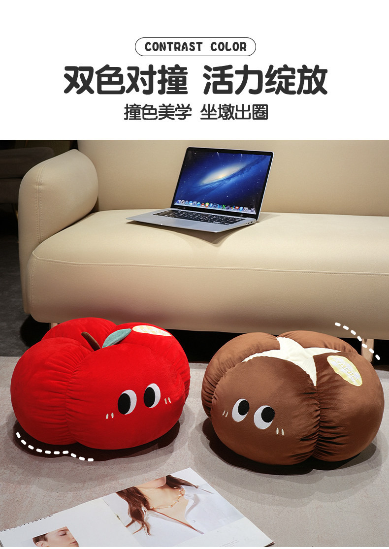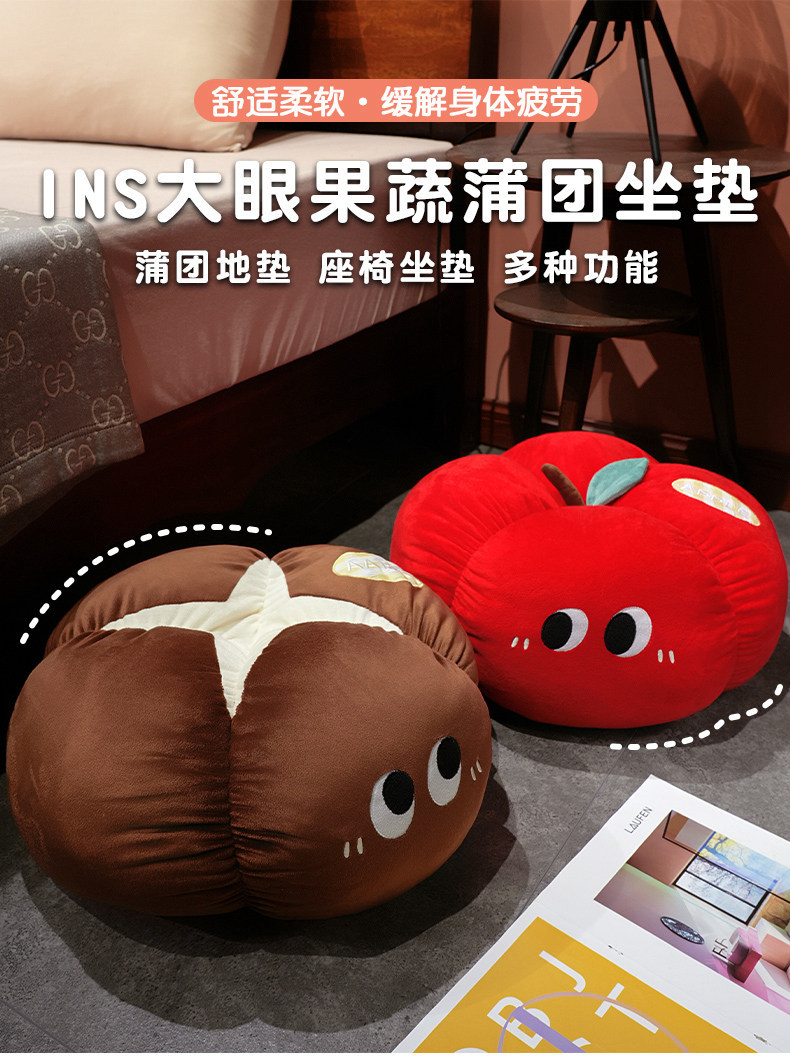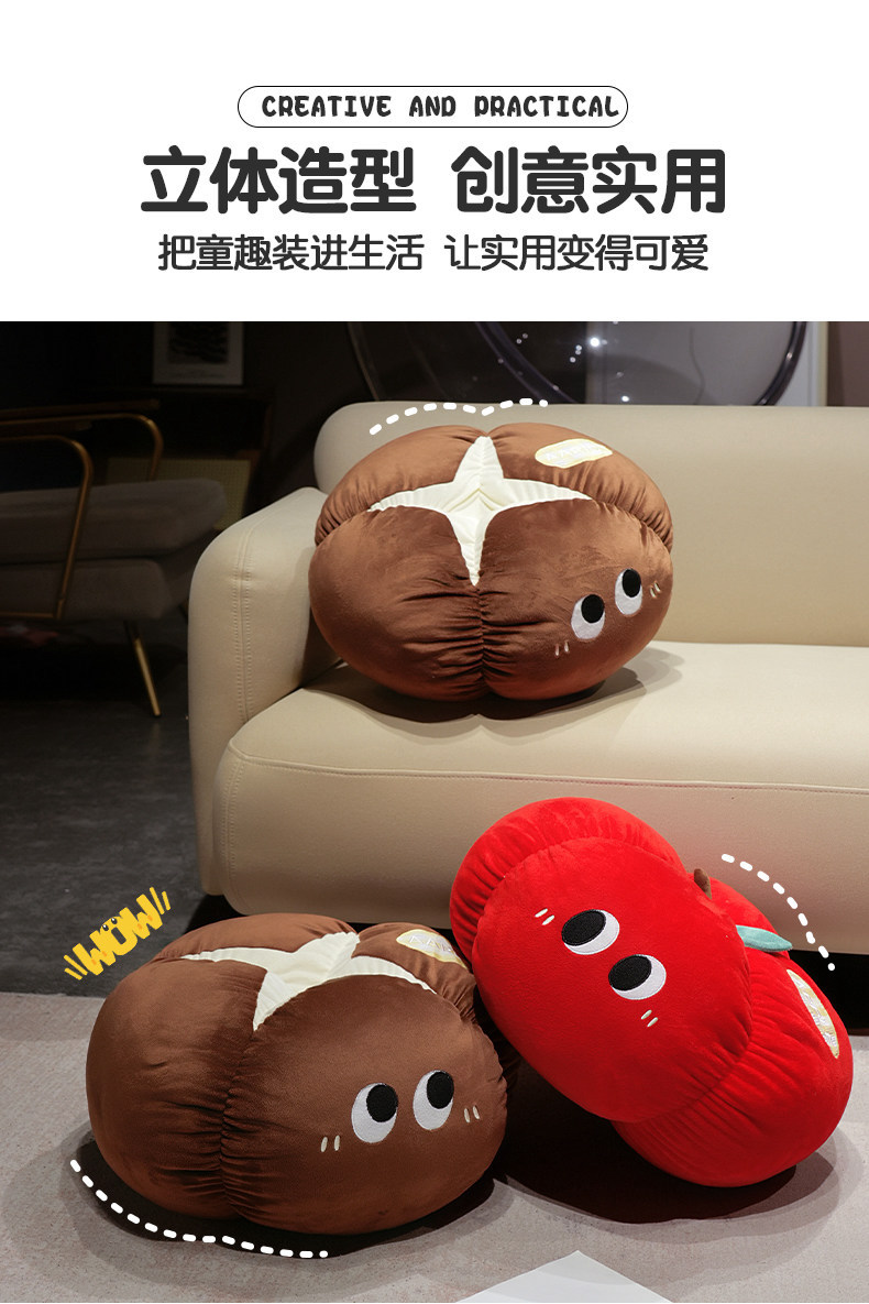 Manzana roja almohada almohada muñeca de peluche hongos de ojos grandes frutas y verduras en la cama en línea dormitorio rojo