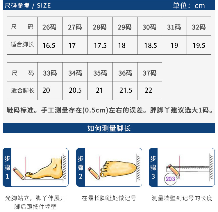 | Talla | 26 (16.5 cm de longitud interna), 27 (17 cm de longitud interna), 28 (17.5 cm de longitud interna), 29 (18 cm de longitud interna), 30 (18.5 cm de longitud interna), 31 (19 cm de longitud interna), 32 (19.5 cm de longitud interna), 33 (20 cm de longitud interna), 34 (20.5 cm de longitud interna), 35 (21 cm de longitud interna), 36 (21.5 cm de longitud interna), 37 (22 cm de longitud interna) |
