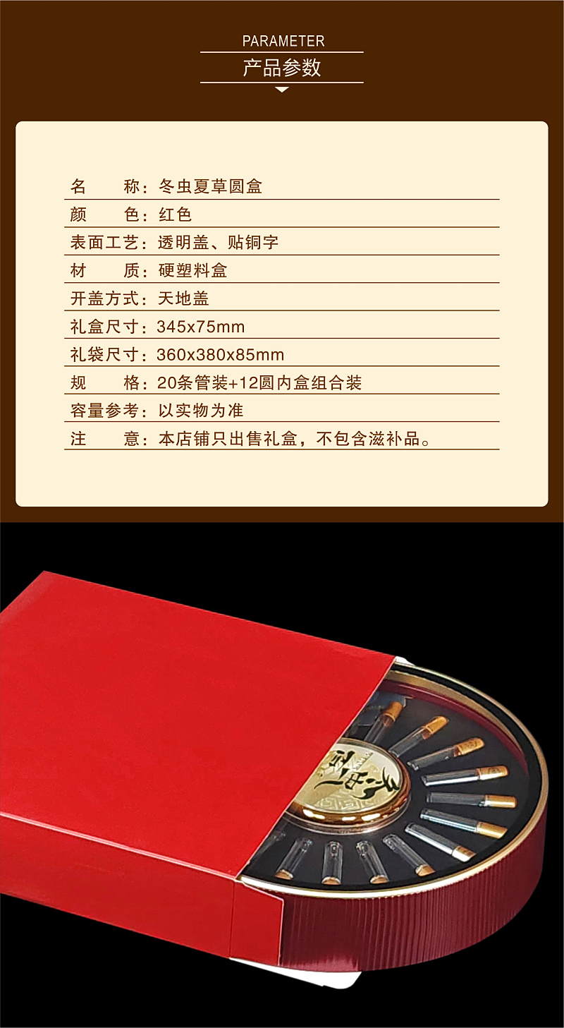 | Especificaciones y modelos | 1 juego de venta al por menor de cordyceps - 345x345x75mm, 10 juegos de cajas de precio unitario de cordyceps - 345x345x75mm, 1 juego de venta al por menor de ventanas de cordyceps veinte cajas de regalo - 345x345x75mm, 10 juegos de cajas de regalo de cordyceps - 345x345x75mm |