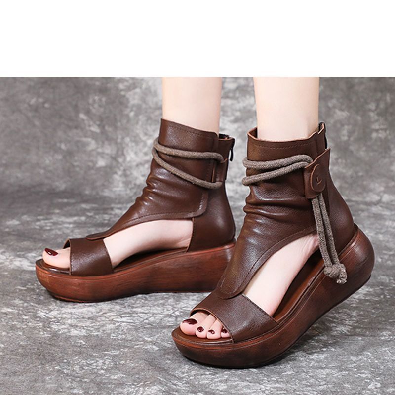 Sandálias de cuero suave de fondo grueso para mujeres retro 2024 nuevo verano de alta altura de estilo nacional de pastel