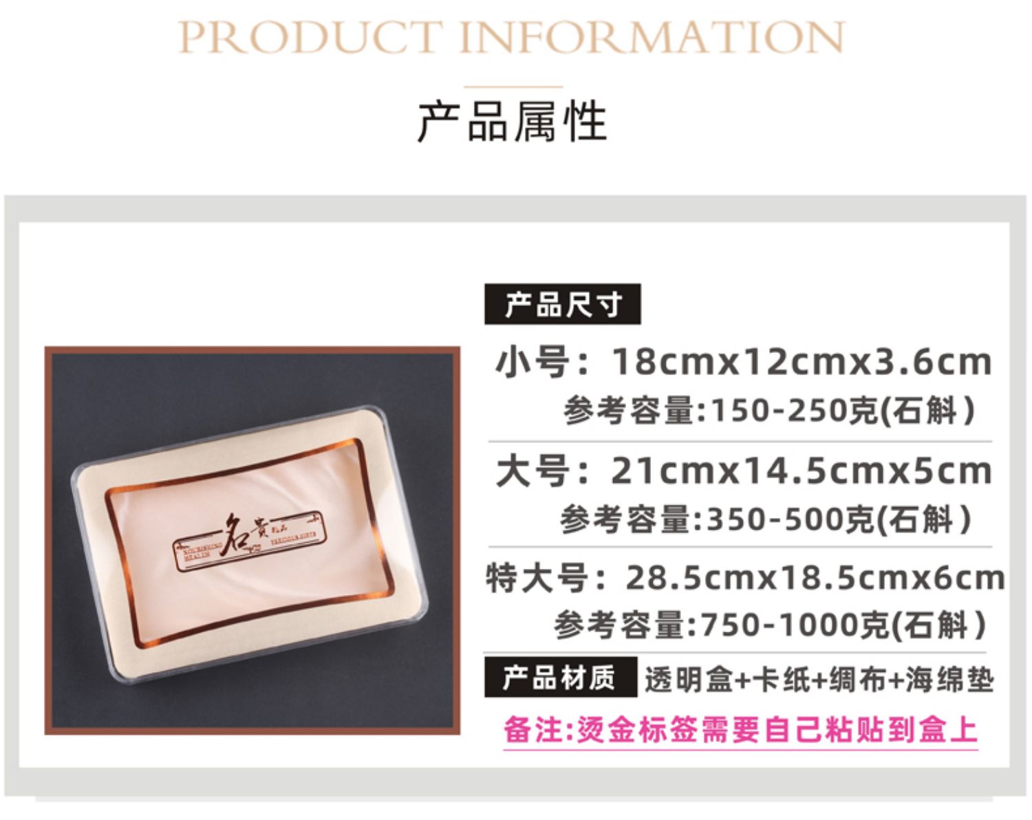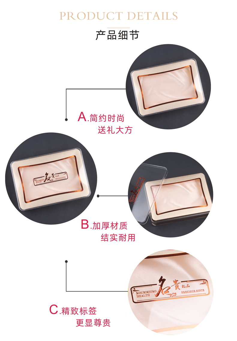 | Especificaciones y modelos | 零售价-小号-金色盒(无字),零售价-小号-金色盒(无字)+手提袋整套,零售价-小号-金色盒+名贵标签,零售价-小号-金色盒+名贵标签+手提袋整套,零售价-小号-金色盒+石斛标签,零售价-小号-金色盒+石斛标签+手提袋整套,零售价-小号-金色盒+海参标签,零售价-小号-金色盒+海参标签+手提袋整套,零售价-小号-金色盒+花旗参标签,零售价-小号-金色盒+花旗参标签+手提袋整套,零售价-小号-金色盒+西洋参标签,零售价-小号-金色盒+西洋参标签+手提袋整套,零售价-小号-金色盒+虫草标签,零售价-小号-金色盒+虫草标签+手提袋整套,零售价-小号-金色盒+天麻标签,零售价-小号-金色盒+天麻标签+手提袋整套,零售价-小号-金色盒+三七标签,零售价-小号-金色盒+三七标签+手提袋整套,零售价-小号-金色盒+鱼胶标签 (只能装切片鱼胶),零售价-小号-金色盒+鱼胶标签+手提袋整套 (只能装切片鱼胶),零售价-小号-金色盒+鲍鱼标签,零售价-小号-金色盒+鲍鱼标签+手提袋整套,零售价-小号-单买手提袋,零售价-大号-金色盒(无字),零售价-大号-金色盒(无字)+手提袋整套,零售价-大号-金色盒+名贵标签,零售价-大号-金色盒+名贵标签+手提袋整套,零售价-大号-金色盒+石斛标签,零售价-大号-金色盒+石斛标签+手提袋整套,零售价-大号-金色盒+海参标签,零售价-大号-金色盒+海参标签+手提袋整套,零售价-大号-金色盒+花旗参标签,零售价-大号-金色盒+花旗参标签+手提袋整套,零售价-大号-金色盒+西洋参标签,零售价-大号-金色盒+西洋参标签+手提袋整套,零售价-大号-金色盒+虫草标签,零售价-大号-金色盒+虫草标签+手提袋整套,零售价-大号-金色盒+天麻标签,零售价-大号-金色盒+天麻标签+手提袋整套,零售价-大号-金色盒+三七标签,零售价-大号-金色盒+三七标签+手提袋整套,零售价-大号-金色盒+鱼胶标签 (只能装切片鱼胶),零售价-大号-金色盒+鱼胶标签+手提袋整套 (只能装切片鱼胶),零售价-大号-金色盒+鲍鱼标签,零售价-大号-金色盒+鲍鱼标签+手提袋整套,零售价-大号-单买手提袋,10个起(每个单价)-小号-金色盒(无字),10个起(每个单价)-小号-金色盒(无字)+手提袋整套,10个起(每个单价)-小号-金色盒+名贵标签,10个起(每个单价)-小号-金色盒+名贵标签+手提袋整套,10个起(每个单价)-小号-金色盒+石斛标签,10个起(每个单价)-小号-金色盒+石斛标签+手提袋整套,10个起(每个单价)-小号-金色盒+海参标签,10个起(每个单价)-小号-金色盒+海参标签+手提袋整套,10个起(每个单价)-小号-金色盒+花旗参标签,10个起(每个单价)-小号-金色盒+花旗参标签+手提袋整套,10个起(每个单价)-小号-金色盒+西洋参标签,10个起(每个单价)-小号-金色盒+西洋参标签+手提袋整套,10个起(每个单价)-小号-金色盒+虫草标签,10个起(每个单价)-小号-金色盒+虫草标签+手提袋整套,10个起(每个单价)-小号-金色盒+天麻标签,10个起(每个单价)-小号-金色盒+天麻标签+手提袋整套,10个起(每个单价)-小号-金色盒+三七标签,10个起(每个单价)-小号-金色盒+三七标签+手提袋整套,10个起(每个单价)-小号-金色盒+鱼胶标签 (只能装切片鱼胶),10个起(每个单价)-小号-金色盒+鱼胶标签+手提袋整套 (只能装切片鱼胶),10个起(每个单价)-小号-金色盒+鲍鱼标签,10个起(每个单价)-小号-金色盒+鲍鱼标签+手提袋整套,10个起(每个单价)-小号-单买手提袋,10个起(每个单价)-大号-金色盒(无字),10个起(每个单价)-大号-金色盒(无字)+手提袋整套,10个起(每个单价)-大号-金色盒+名贵标签,10个起(每个单价)-大号-金色盒+名贵标签+手提袋整套,10个起(每个单价)-大号-金色盒+石斛标签,10个起(每个单价)-大号-金色盒+石斛标签+手提袋整套,10个起(每个单价)-大号-金色盒+海参标签,10个起(每个单价)-大号-金色盒+海参标签+手提袋整套,10个起(每个单价)-大号-金色盒+花旗参标签,10个起(每个单价)-大号-金色盒+花旗参标签+手提袋整套,10个起(每个单价)-大号-金色盒+西洋参标签,10个起(每个单价)-大号-金色盒+西洋参标签+手提袋整套,10个起(每个单价)-大号-金色盒+虫草标签,10个起(每个单价)-大号-金色盒+虫草标签+手提袋整套,10个起(每个单价)-大号-金色盒+天麻标签,10个起(每个单价)-大号-金色盒+天麻标签+手提袋整套,10个起(每个单价)-大号-金色盒+三七标签,10个起(每个单价)-大号-金色盒+三七标签+手提袋整套,10个起(每个单价)-大号-金色盒+鱼胶标签 (只能装切片鱼胶),10个起(每个单价)-大号-金色盒+鱼胶标签+手提袋整套 (只能装切片鱼胶),10个起(每个单价)-大号-金色盒+鲍鱼标签,10个起(每个单价)-大号-金色盒+鲍鱼标签+手提袋整套,10个起(每个单价)-大号-单买手提袋,28个起(每个)-小号-金色盒(无字),28个起(每个)-小号-金色盒(无字)+手提袋整套,28个起(每个)-小号-金色盒+名贵标签,28个起(每个)-小号-金色盒+名贵标签+手提袋整套,28个起(每个)-小号-金色盒+石斛标签,28个起(每个)-小号-金色盒+石斛标签+手提袋整套,28个起(每个)-小号-金色盒+海参标签,28个起(每个)-小号-金色盒+海参标签+手提袋整套,28个起(每个)-小号-金色盒+花旗参标签,28个起(每个)-小号-金色盒+花旗参标签+手提袋整套,28个起(每个)-小号-金色盒+西洋参标签,28个起(每个)-小号-金色盒+西洋参标签+手提袋整套,28个起(每个)-小号-金色盒+虫草标签,28个起(每个)-小号-金色盒+虫草标签+手提袋整套,28个起(每个)-小号-金色盒+天麻标