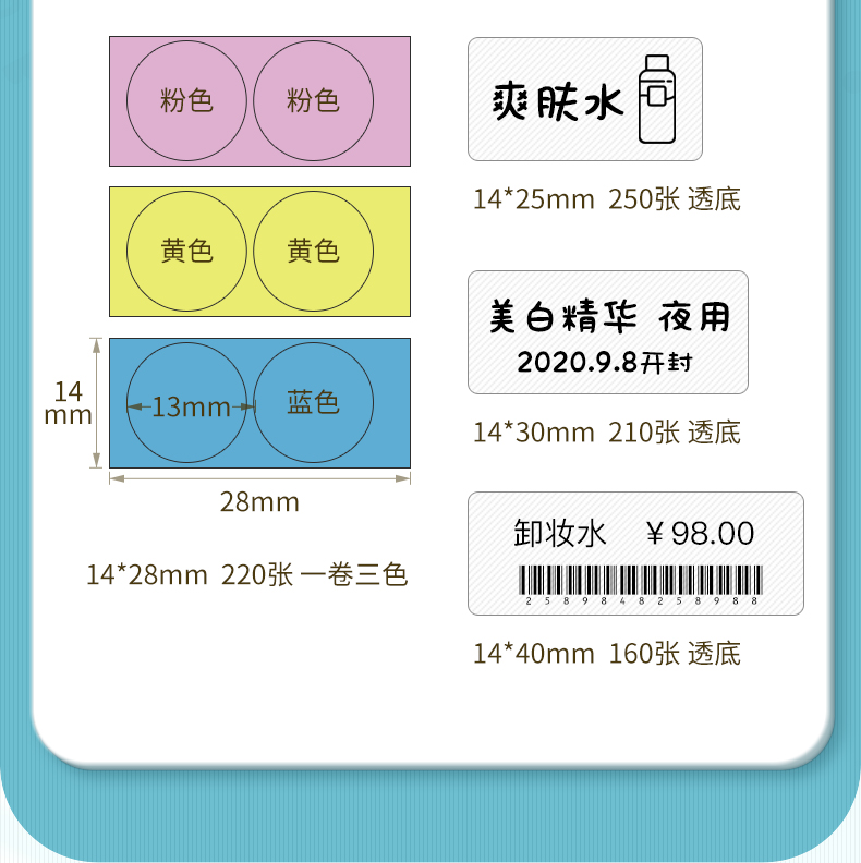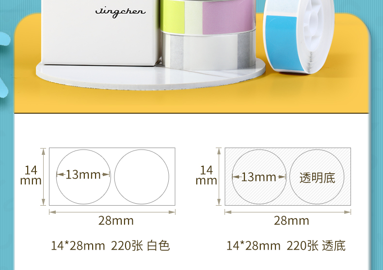 | Especificaciones y modelos | Las etiquetas se pueden personalizar, 1 rollo se puede establecer, se puede recibir un pedido urgente, [No. 49] 14 * 28 - 205 hojas de círculo amarillo brillante, [No. 50] 14 * 28 - 205 hojas de círculo rojo, [No. 51] 14 * 28 - 205 hojas de círculo verde fruta, [No. 47] diámetro redondo 13 mm-blanco, [No. 52] diámetro redondo 13 mm-posa amarillo azul, [No. 48] diámetro redondo 13 mm-transparente, [No. 53] diámetro redondo 13 mm-morandi primavera,[No. 54] diámetro redondo 13 mm - Morandi秋, [No. 55] estrella redonda de doble fila 14 * 28 - 205 hojas, [No. 32] etiqueta transparente 14 * 25 mm 240 hojas, [No. 33] etiqueta transparente 14 * 30 mm 210 hojas, [No. 34] etiqueta transparente 14 * 40 mm 160 hojas, [No. 36] etiqueta transparente (bear pequeño oso blanco) 14 * 40 mm 160 hojas |