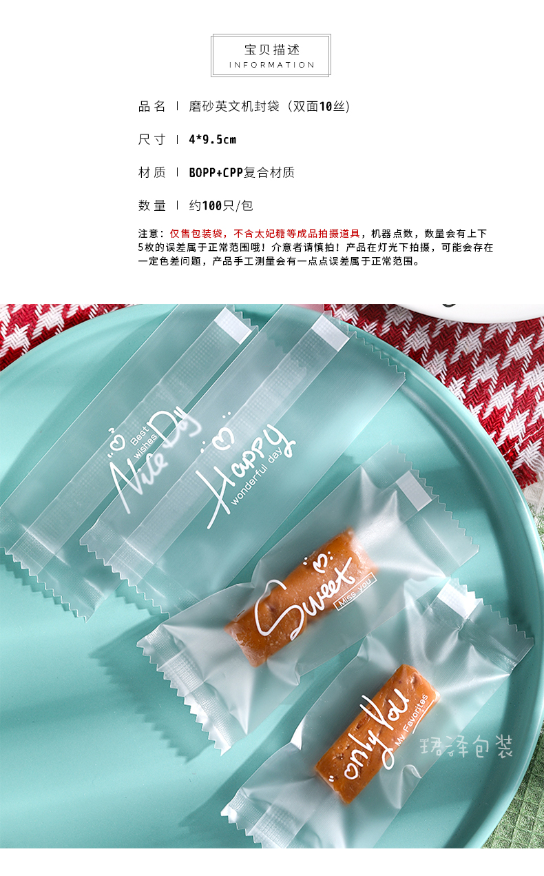 | Especificaciones y modelos | 约100只(磨砂英文+糯米纸),【4*9.5cm】磨砂英文约100只,约100只(金底life+糯米纸),【4*9.5cm】机封金底life约100只,约100只(luck糖袋+糯米纸),【4*9.5cm】机封luck糖袋,约100只(三只熊+糯米纸),【4*9.5cm】三只熊约100只,约100只(太空女孩+糯米纸),【4*9.5cm】太空女孩约100只,约200只(白底甜蜜+糯米纸),【4*9.5cm】白底甜蜜约200只,约200只(金底英文+糯米纸),【4*9cm】金底英文约200只,约200只(白底字母+糯米纸),【4*9cm】白底字母约200只,约200只(三色英文笑脸+糯米纸),【4*9cm】三色英文笑脸约200只,约200只(方块熊+糯米纸),【4*9cm】方块熊约200只,约200只(红底熊+糯米纸),【4*9cm】红底熊约200只,约200只(元寳狗+糯米纸),【4*9cm】元寳狗约200只,【4*9cm】兔子小熊约200只,约200只(兔子小熊+糯米纸),约200只(格子熊+糯米纸),【4*9cm】格子熊约200只,约200只(字母熊+糯米纸),【4*9cm】字母熊约200只,约200只(快乐鸭+糯米纸),【4*9cm】快乐鸭约200只,约200只(好运蛇+糯米纸),【4*9cm】好运蛇约200只,约200只(条纹兔+糯米纸),【4*9cm】条纹兔约200只,约200只(和风新春+糯米纸),【4*9cm】和风新春约200只,约200只(三色新年祝福+糯米纸),【4*9cm】三色新年祝福约200只,约200只(心意+糯米纸),【4*9cm】心意约200只,约200只(透明粉花+糯米纸),【4*9cm】透明粉花约200只,约200只(对角樱花+糯米纸),【4*9.5cm】对角樱花约200只,约200只(乱版樱花+糯米纸),【4*9.5cm】乱版樱花约200只 |
