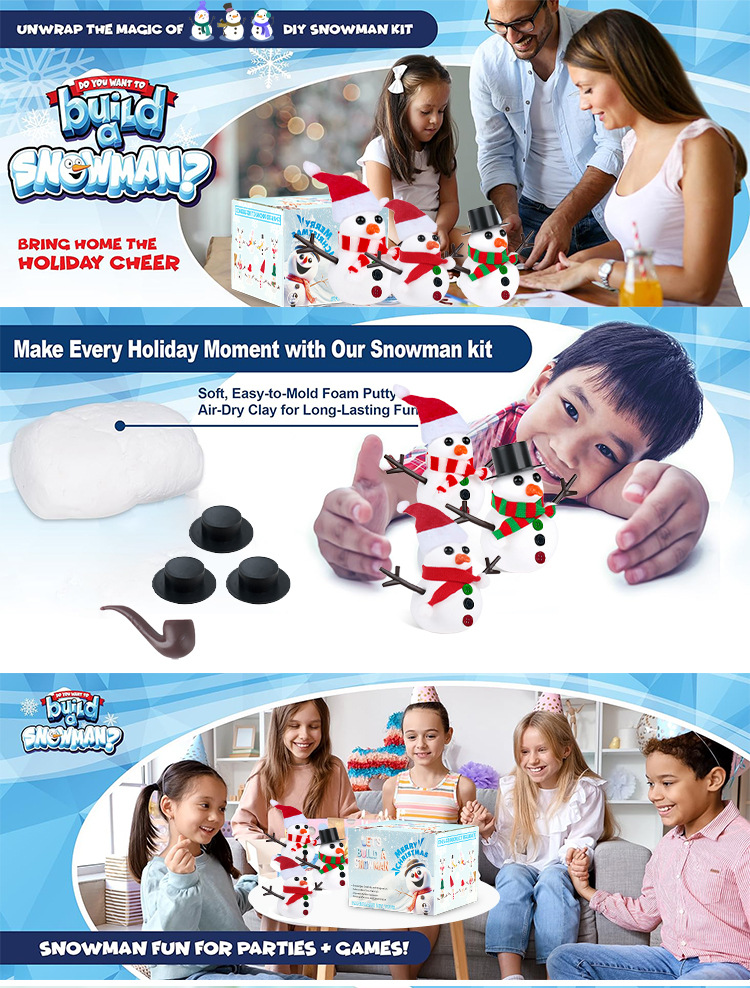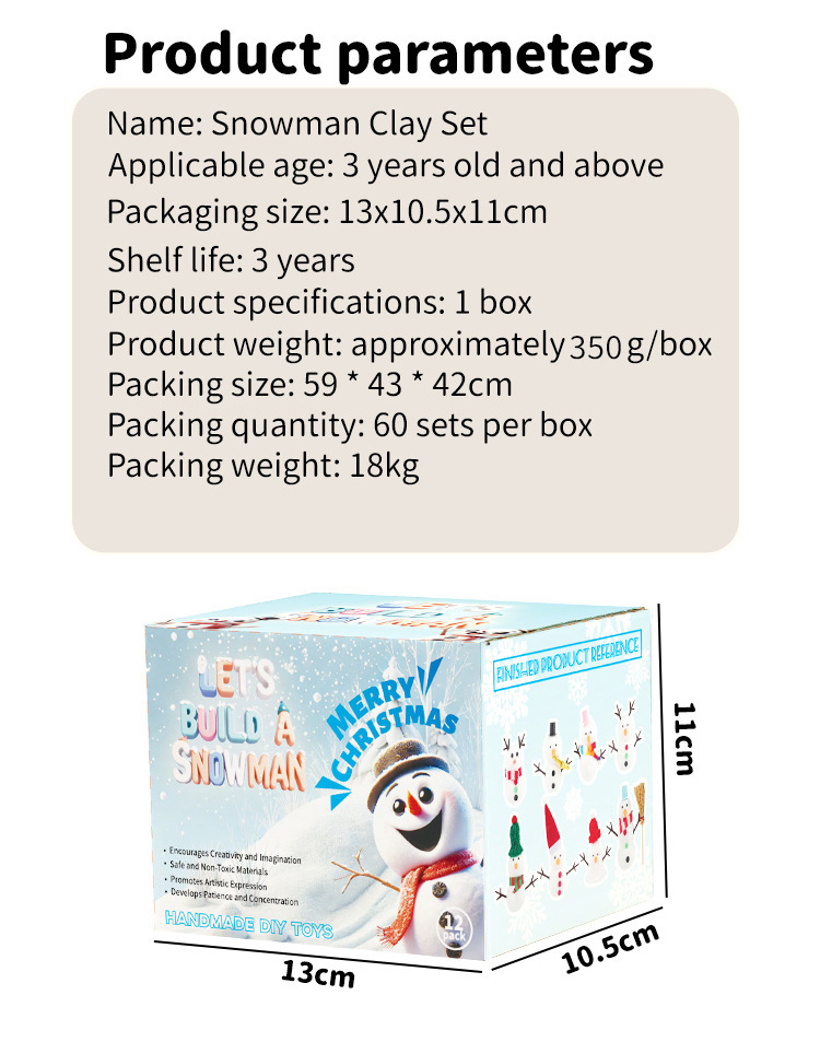| Especificaciones | Set de bricolaje de muñeco de nieve de 3 piezas (41 piezas),9 piezas de arcilla muñeco de nieve juego de bricolaje (96pcs),Set de manualidades de muñeco de nieve de arcilla de 9 piezas (117 piezas),Juego de bricolaje de muñeco de nieve de arcilla de 12 piezas (86pcs),12 piezas de arcilla muñeco de nieve DIY Set (131pcs),Conjunto de muñeco de nieve de 3 piezas.,Set de manualidades de muñeco de nieve de arcilla de 6 piezas (73 piezas),Set de muñeco de nieve grande de arcilla de 3 piezas (39 piezas),Set de manualidades de muñeco de nieve de arcilla de 24 piezas (296 piezas en total) |