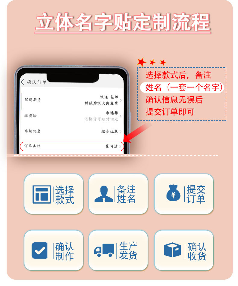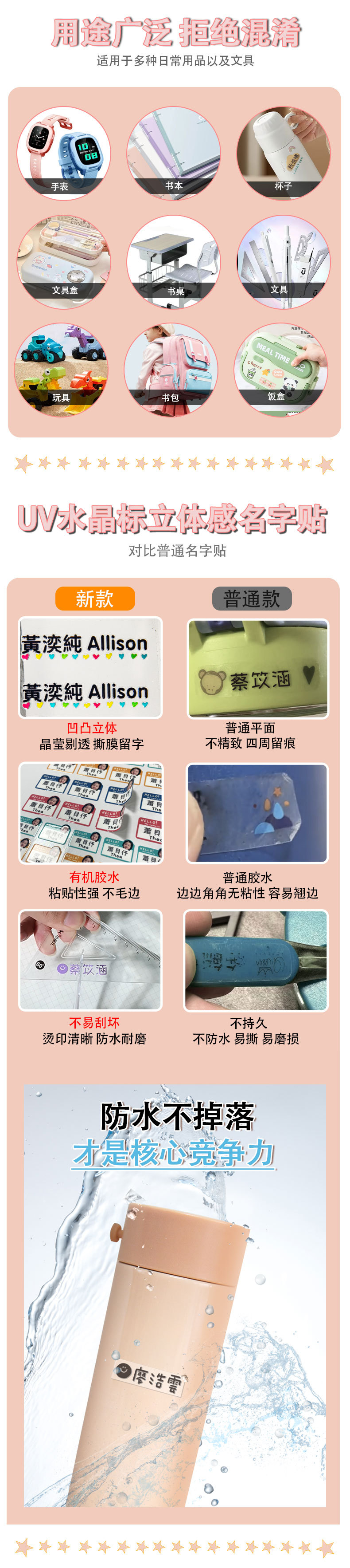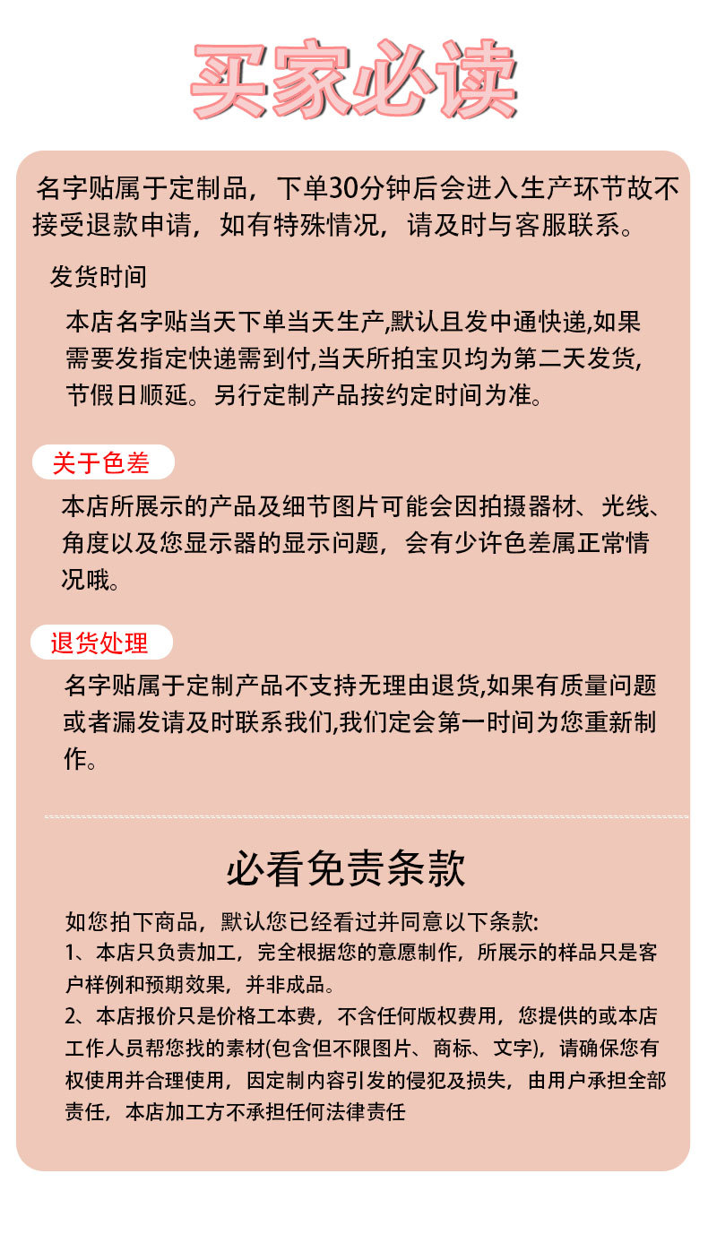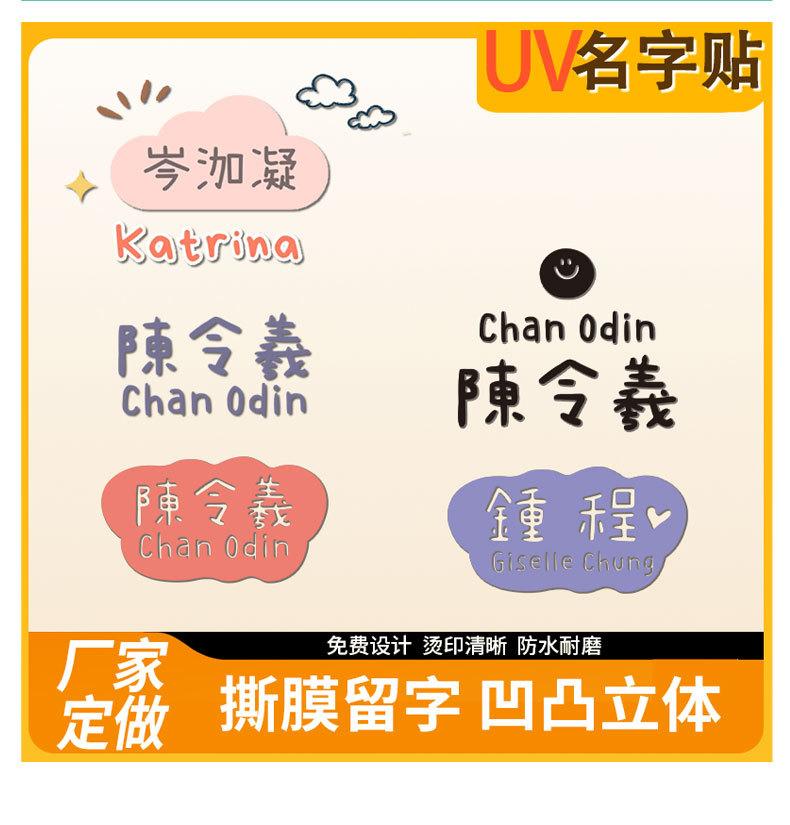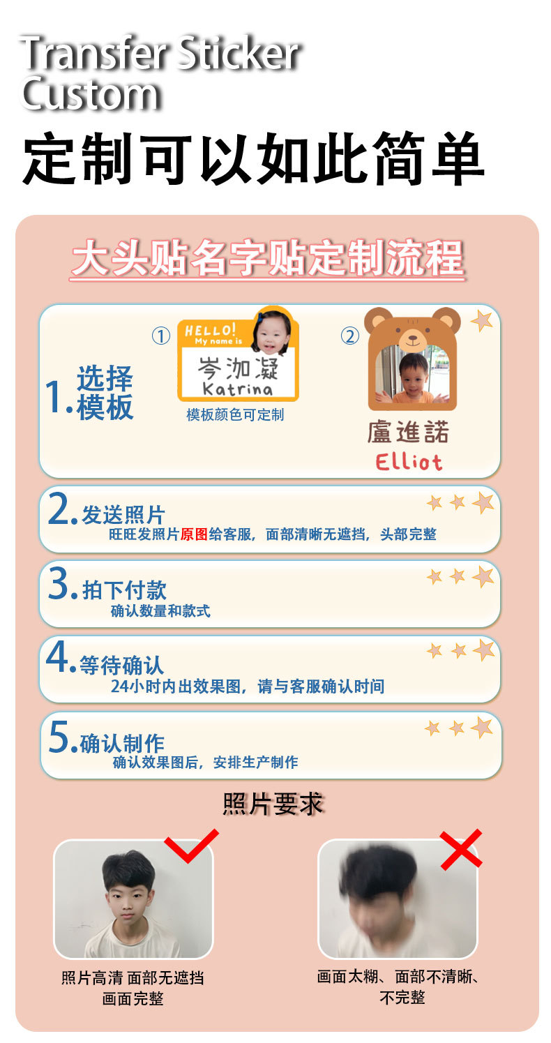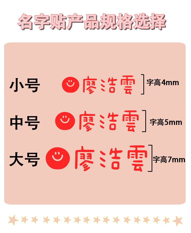 | Especificaciones y modelos | Pegatinas de nombre de texto sólido, pegatinas de nombre de estilo de cabeza grande (fotos personalizables) (), pegatinas de nombre de estilo de placa de identificación (fotos personalizables), pegatinas de nombre de patrón de estilo meteorológico, pegatinas de nombre de texto de dibujos animados 1, pegatinas de nombre de texto de dibujos animados 2, pegatinas de nombre de texto de dibujos animados 3 |