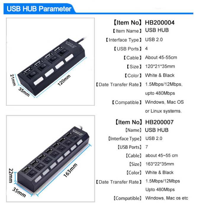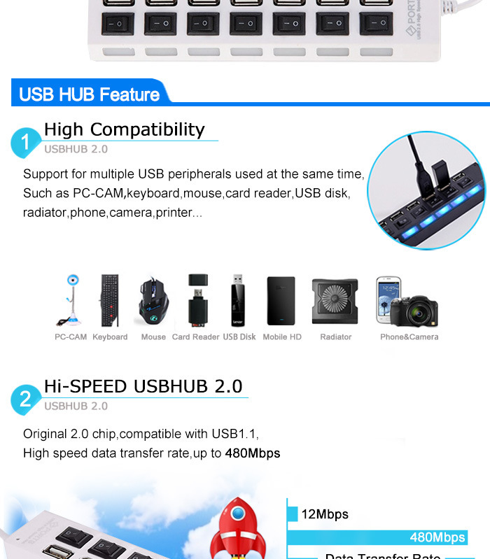 Designed with 4/7-port,this compact USB2.0 high-speed hub is small enough for travel,and cable enough to meet your connectivity needs