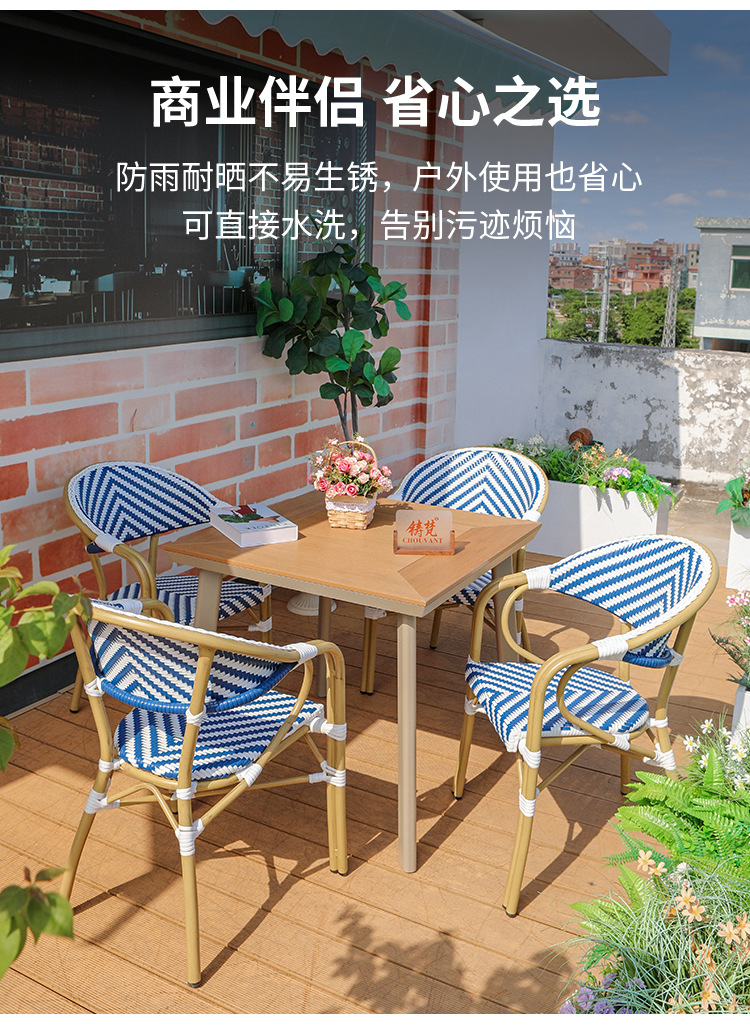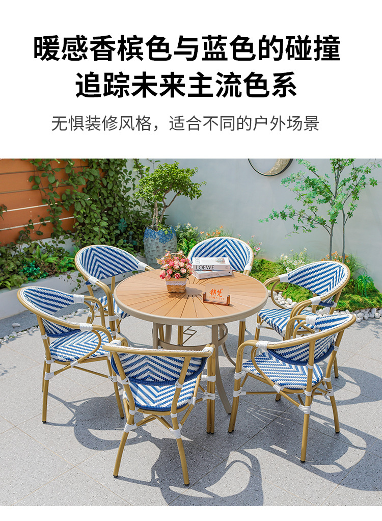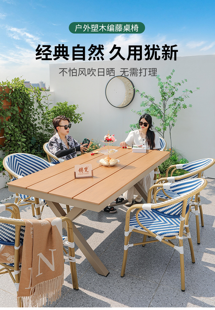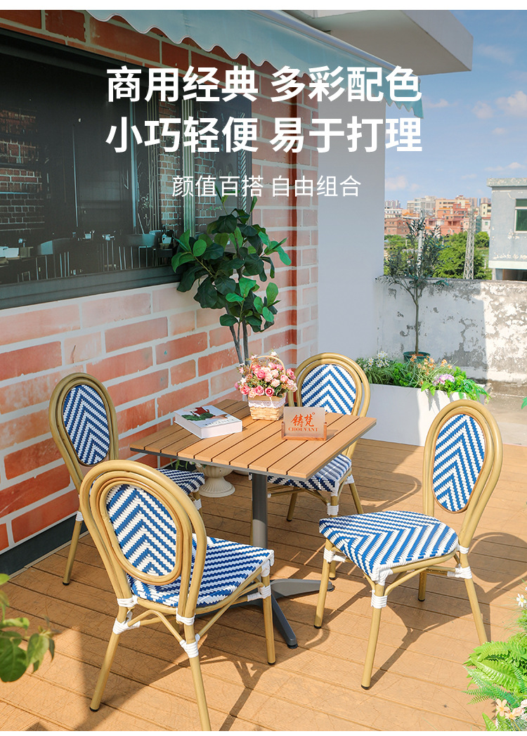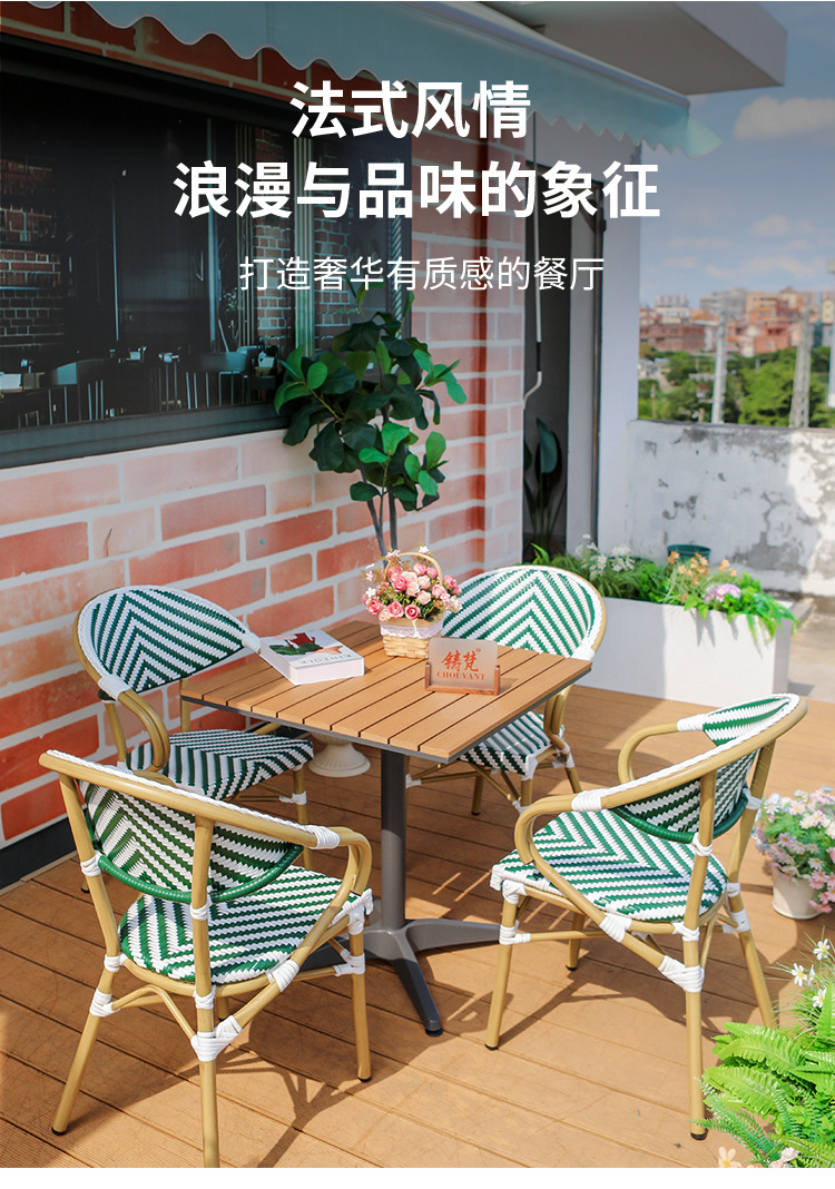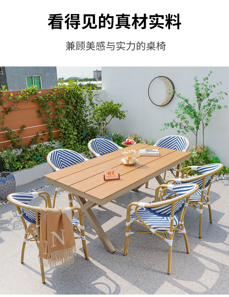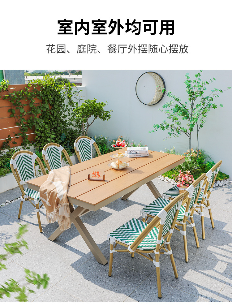 | Modelo | Mesa de madera de plástico, silla de ratán, marco de aleación de aluminio |