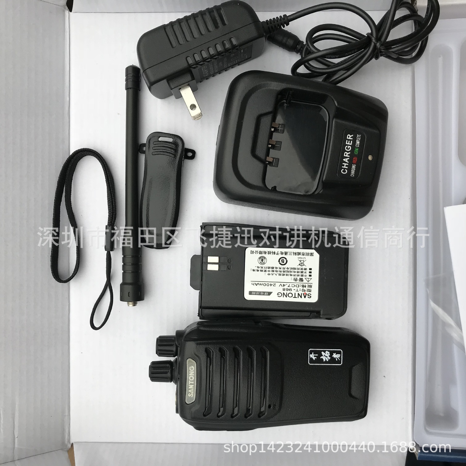 配置:主机一台、2500毫安锂电电池一个、充电器一个、天线一条、说明书一本、包装盒一个。