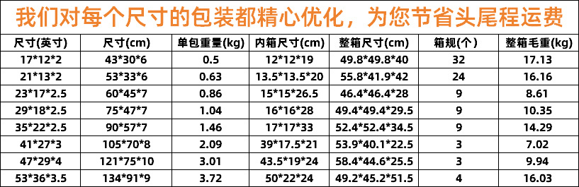 | Especificaciones | (29 pulgadas) 75*47*7cm (dentro de 30 kg),(35 pulgadas) 90*57*7cm (dentro de 50 kg),(41 pulgadas) 105*70*8cm (dentro de 80 kg) |