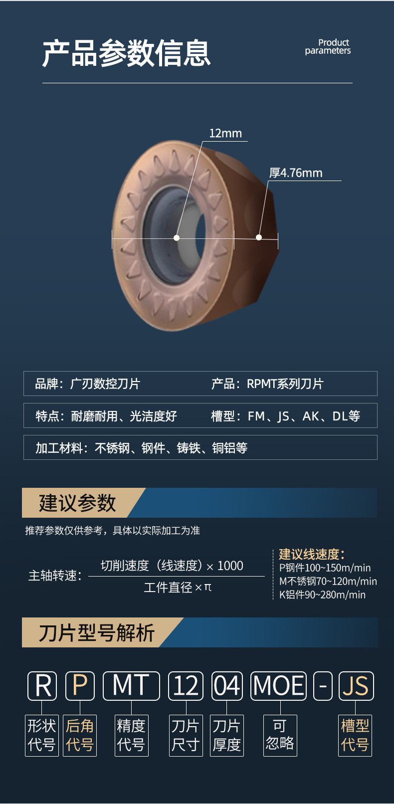 | Modelo | Rpmw1003mo [especial para acero inoxidable], rpmt10t3moe - JS [especial para acero inoxidable], rpmt1204moe - JS [especial para acero inoxidable], rpmw1003mo [actualización para acero inoxidable], rpmt1204mo [actualización para acero inoxidable], rpmw1003mo [material general], rpmt1204mo [material general], rdmw1204mo - du [material general de alto rendimiento], rpmt08t2moe - FM [actualización para uso general], rpmw1003mo - FM [actualización para uso general], rpmt1204mo - FM [actualización para uso general], rpmt1204mo - FM [actualización para uso general], rpmt1204mo - FM [actualización para uso general], rpmt1204mo - FM rpmt1003mo - DL [modelo universal de alta gama], Rpmt1204mo - DL [modelo general de alta gama], rpmw1003mo [modelo especial de piezas de acero], rpmt1204 - M - C [modelo especial de piezas de acero], rpmt1204mo [modelo de actualización de piezas de acero], rpmt1003mo - DL [modelo de alta gama de piezas de acero], rpmt1204mo - DL [modelo de alta gama de piezas de acero], rpm1003mo - DL [modelo especial de acero templado], rpmt1204mo - DL [acero templado], rpmt10t3mo [modelo duro de alto color], rpmt1204mo [modelo duro de alto color], rpm100w3mo[cerámicas metálicas], rpmt1203 - BB [cerámicas metálicas], rpgt1003mo - AK [especial para cobre y aluminio], rpgt10t3mo - AK [especial para cobre y aluminio], rpgt1204mo - AK [especial para cobre y aluminio], rpgt1204mo - DL [resistencia al desgaste de piezas de acero], rpmt1204mo - LZW [especial para alta dureza], rpmt1204mo - LZW [especial para alta dureza], rpmt1204mo - ljf [especial para aleación de titanio], rpmt1204moe - ljf [especial para aleación de titanio][original: inglés] |