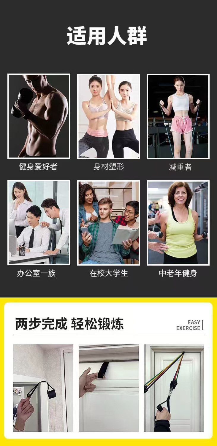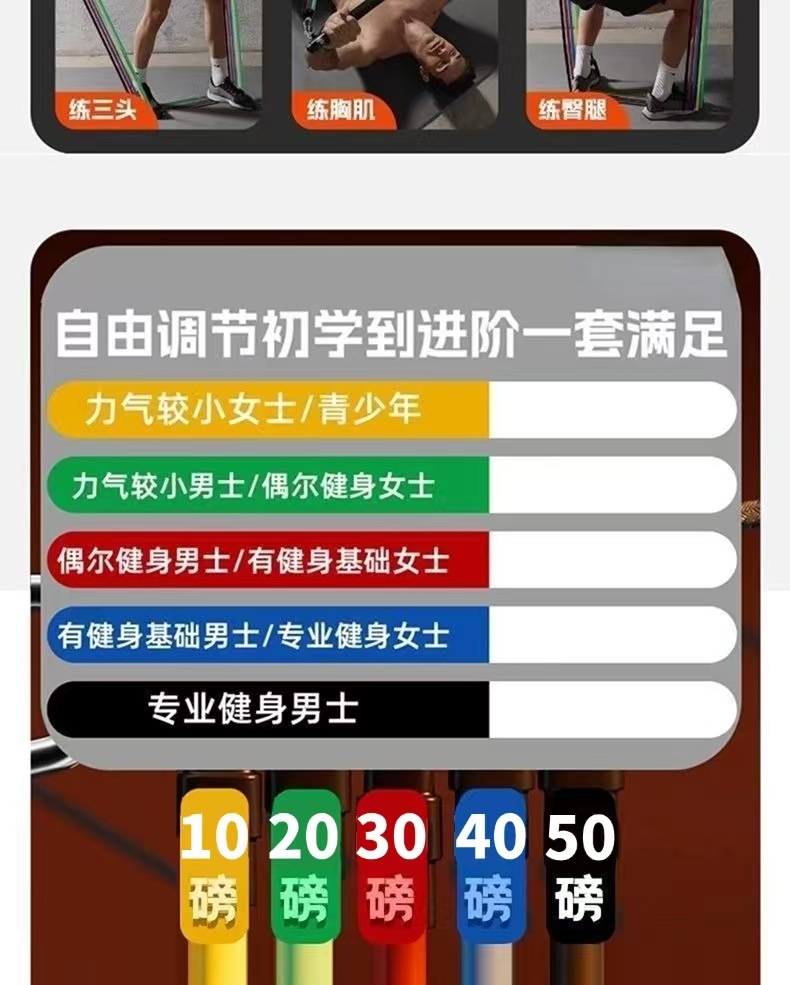 | Colores | [Introducción básica para principiantes: 3 cuerdas/alrededor de 60 libras de fuerza de tracción],Set de 10 piezas para principiantes - 3 bandas de resistencia (90 lbs ≈ 80 lbs de resistencia ajustable),Juego intermedio de 11 piezas: 4 cuerdas (se pueden ajustar a voluntad 120 libras ≈ 108 libras de tensión),Juego mejorado de 12 piezas: 5 cuerdas (se pueden ajustar a voluntad 150 libras ≈ 135 libras de tensión),Juego profesional de 13 piezas: 6 cuerdas (se pueden ajustar a voluntad 200 libras ≈ 180 libras de tensión),[Cuerda de tensión reforzada individual],varilla de empuje y tracción |