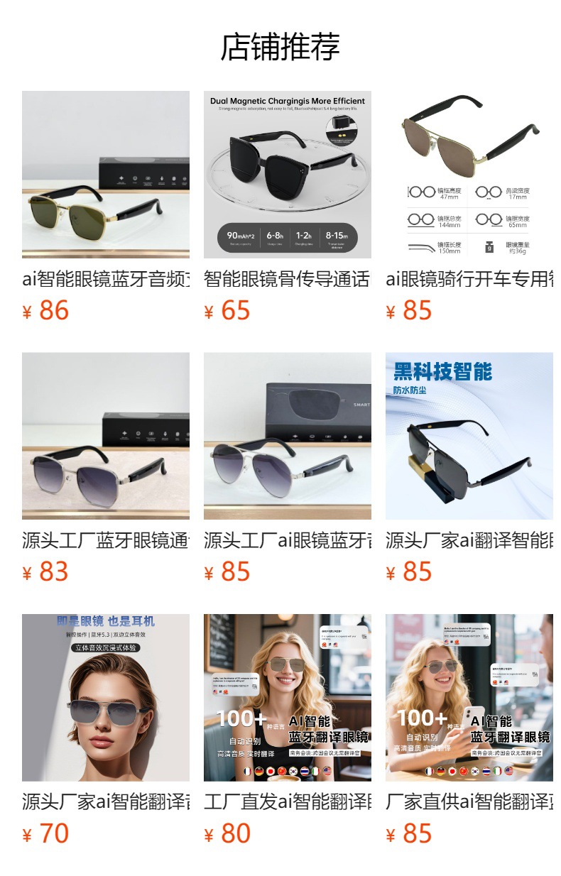| Lista de envases | Gafas inteligentes ai * 1, cable de carga magnética DC * 1, bolsa de almacenamiento de gafas * 1, tela de gafas * 1, instrucciones * 1, tarjeta de membresía ai. ...... |