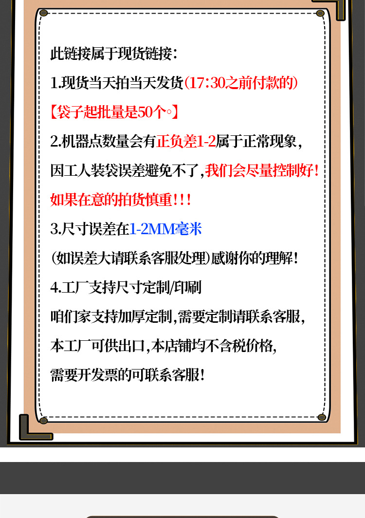 | Especificaciones y modelos | 拉链袋Pe透明12丝;宽10*长15;PE,拉链袋Pe透明12丝;宽15*长15;PE,拉链袋Pe透明12丝;宽15*长20;PE,拉链袋Pe透明12丝;宽18*长20;PE,拉链袋Pe透明12丝;宽18*长25;PE,拉链袋Pe透明12丝;宽20*长25;PE,拉链袋Pe透明12丝;宽20*长30;PE,拉链袋Pe透明12丝;宽20*长35;PE,拉链袋Pe透明12丝;宽25*长25;PE,拉链袋Pe透明12丝;宽25*长30;PE,拉链袋Pe透明12丝;宽25*长35;PE,拉链袋Pe透明12丝;宽25*长40;PE,拉链袋Pe透明12丝;宽27*长35;PE,拉链袋Pe透明12丝;宽28*长40;PE,拉链袋Pe透明12丝;宽30*长30;PE,拉链袋Pe透明12丝;宽30*长35;PE,拉链袋Pe透明12丝;宽30*长45;PE,拉链袋Pe透明12丝;宽30*长40;PE,拉链袋Pe透明12丝;宽35*长35;PE,拉链袋Pe透明12丝;宽35*长40;PE,拉链袋Pe透明12丝;宽35*长45;PE,拉链袋Pe透明12丝;宽35*长50;PE,拉链袋Pe透明12丝;宽40*长45;PE,拉链袋Pe透明12丝;宽40*长50;PE,拉链袋Pe透明12丝;40*55;PE,拉链袋Pe透明12丝;宽40*长60;PE,拉链袋Pe透明12丝;宽45*长55;PE,拉链袋Pe透明12丝;宽45*长60;PE,拉链袋Pe透明12丝;宽45*长65;PE,拉链袋Pe透明12丝;宽45*长70;PE,拉链袋Pe透明12丝;宽50*长60;PE,拉链袋Pe透明12丝;宽50*长65;PE,拉链袋Pe透明12丝;宽50*长70;PE,拉链袋Pe透明12丝;宽55*长70;PE,拉链袋Pe透明12丝;宽60*长70;PE,拉链袋Pe透明12丝;25*20横版;PE,拉链袋Pe透明12丝;30*20横版;PE,拉链袋Pe透明12丝;30*25横版;PE,拉链袋Pe透明12丝;35*25横版;PE,拉链袋低压透明双层5丝;宽20*长25;PE,拉链袋低压透明双层5丝;宽20*长30;PE,拉链袋低压透明双层5丝;宽25*长30;PE,拉链袋低压透明双层5丝;宽25*长35;PE,拉链袋低压透明双层5丝;宽30*长35;PE,拉链袋低压透明双层5丝;宽30*长40;PE,拉链袋低压透明双层5丝;宽35*长40;PE,拉链袋低压透明双层5丝;宽35*长45;PE,拉链袋低压透明双层5丝;宽40*长50;PE,拉链袋低压透明双层5丝;宽40*长60;PE,拉链袋pe透明双层8丝;宽15*长20;PE,拉链袋pe透明双层8丝;宽18*长20;PE,拉链袋pe透明双层8丝;宽20*长25;PE,拉链袋pe透明双层8丝;宽20*长30;PE,拉链袋pe透明双层8丝;宽25*长30;PE,拉链袋pe透明双层8丝;宽25*长35;PE,拉链袋pe透明双层8丝;宽30*长35;PE,拉链袋pe透明双层8丝;宽30*长40;PE,拉链袋pe透明双层8丝;宽35*长40;PE,拉链袋pe透明双层8丝;宽35*长45;PE,拉链袋EVA磨砂双层10丝;宽15*长20;EVA,拉链袋EVA磨砂双层10丝;宽18*长20;EVA,拉链袋EVA磨砂双层10丝;宽20*长25;EVA,拉链袋EVA磨砂双层10丝;宽20*长30;EVA,拉链袋EVA磨砂双层10丝;宽25*长30;EVA,拉链袋EVA磨砂双层10丝;宽25*长35;EVA,拉链袋EVA磨砂双层10丝;宽30*长35;EVA,拉链袋EVA磨砂双层10丝;宽35*长40;EVA,拉链袋EVA磨砂双层10丝;宽35*长45;EVA,拉链袋EVA磨砂双层10丝;宽40*长50;EVA,拉链袋Pe透明双层10丝;宽15*长20;PE,拉链袋Pe透明双层10丝;宽18*长20;PE,拉链袋Pe透明双层10丝;宽18*长25;PE,拉链袋Pe透明双层10丝;宽20*长25;PE,拉链袋Pe透明双层10丝;宽20*长30;PE,拉链袋Pe透明双层10丝;宽25*长30;PE,拉链袋Pe透明双层10丝;宽25*长35;PE,拉链袋Pe透明双层10丝;宽27*长35;PE,拉链袋Pe透明双层10丝;宽30*长35;PE,拉链袋Pe透明双层10丝;宽30*长40;PE,拉链袋Pe透明双层10丝;宽35*长40;PE,拉链袋Pe透明双层10丝;宽35*长45;PE,拉链袋Pe透明双层10丝;宽40*长50;PE,拉链袋Pe透明双层10丝;宽40*长60;PE,拉链袋Pe透明双层10丝;宽45*长55;PE,拉链袋Pe透明双层10丝;宽45*长60;PE,拉链袋Pe透明双层10丝;宽45*长65;PE,拉链袋Pe透明双层10丝;宽50*长60;PE,拉链袋Pe透明双层10丝;宽50*长65;PE,拉链袋EVA磨砂双层磨层14丝;宽10*长15;EVA,拉链袋EVA磨砂双层磨层14丝;宽15*长15;EVA,拉链袋EVA磨砂双层磨层14丝;宽15*长20;EVA,拉链袋EVA磨砂双层磨层14丝;宽18*长20;EVA,拉链袋EVA磨砂双层磨层14丝;宽18*长25;EVA,拉链袋EVA磨砂双层磨层14丝;宽20*长25;EVA,拉链袋EVA磨砂双层磨层14丝;宽20*长30;EVA,拉链袋EVA磨砂双层磨层14丝;宽20*长35;EVA,拉链袋EVA磨砂双层磨层14丝;宽25*长25;EVA,拉链袋EVA磨砂双层磨层14丝;宽25*长30;EVA,拉链袋EVA磨砂双层磨层14丝;宽25*长35;EVA,拉链袋EVA磨砂双层磨层14丝;宽25*长40;EVA,拉链袋EVA磨砂双层磨层14丝;宽27*长35;EVA,拉链袋EVA磨砂双层磨层14丝;宽28*长40;EVA,拉链袋EVA磨砂双层磨层14丝;宽30*长30;EVA,拉链袋EVA磨砂双层磨层14丝;宽30*长35;EVA,拉链袋EVA磨砂双层磨层14丝;宽30*长45;EVA,拉链袋EVA磨砂双层磨层14丝;宽30*长40;EVA,拉链袋EVA磨砂双层磨层14丝;宽35*长35;EVA,拉链袋EVA磨砂双层磨层14丝;宽35*长40;EVA,拉链袋EVA磨砂双层磨层14丝;宽35*长45;EVA,拉链袋EVA磨砂双层磨层14丝;宽35*长50;EVA,拉链袋EVA磨砂双层磨层14丝;宽40*长45;EVA,拉链袋EVA磨砂双层磨层14丝;宽40*长50;EVA,拉链袋EVA磨砂双层磨层14丝;40*55;EVA,拉链袋EVA磨砂双层磨层14丝;宽40*长60;EVA,拉链袋EVA磨砂双层磨层14丝;宽45*长55;EVA,拉链袋EVA磨砂双层磨层14丝;宽45*长60;EVA,拉链袋EVA磨砂双层磨层14丝;宽45*长65;EVA,拉链袋EVA磨砂双层磨层14丝;宽45*长70;EVA,拉链袋EVA磨砂双层磨层14丝;宽50*长60;EVA,拉链袋EVA磨砂双层磨层14丝;宽50*长65;EVA,拉链袋EVA磨砂双层磨层14丝;宽50*长70;EVA,拉链袋EVA磨砂双层磨层14丝;宽55*长70;EVA,拉链袋EVA磨砂双层磨层14丝;宽60*长70;EVA,拉链袋EVA磨砂双层磨层14丝;25*20横版;EVA,拉链袋EVA磨砂双层磨层14丝;30*20横版;EVA,拉链袋EVA磨砂双层磨层14丝;30*25横版;EVA,拉链袋EVA磨砂双层磨层14丝;35*25横版;EVA,拉链袋EVA磨砂双层磨层14丝;25*14横版;EVA,拉链袋EVA磨砂双层磨层14丝;28*15横版;EVA,拉链袋EVA一面磨砂一面透明14丝;宽20*长25;PE+EVA,拉链袋EVA一面磨砂一面透明14丝;宽20*长30;PE+EVA,拉链袋EVA一面磨砂一面透明14丝;宽25*