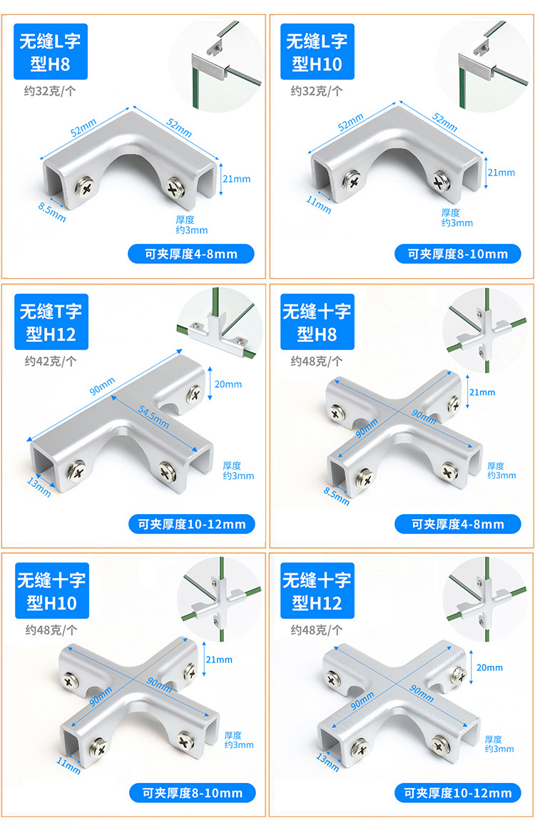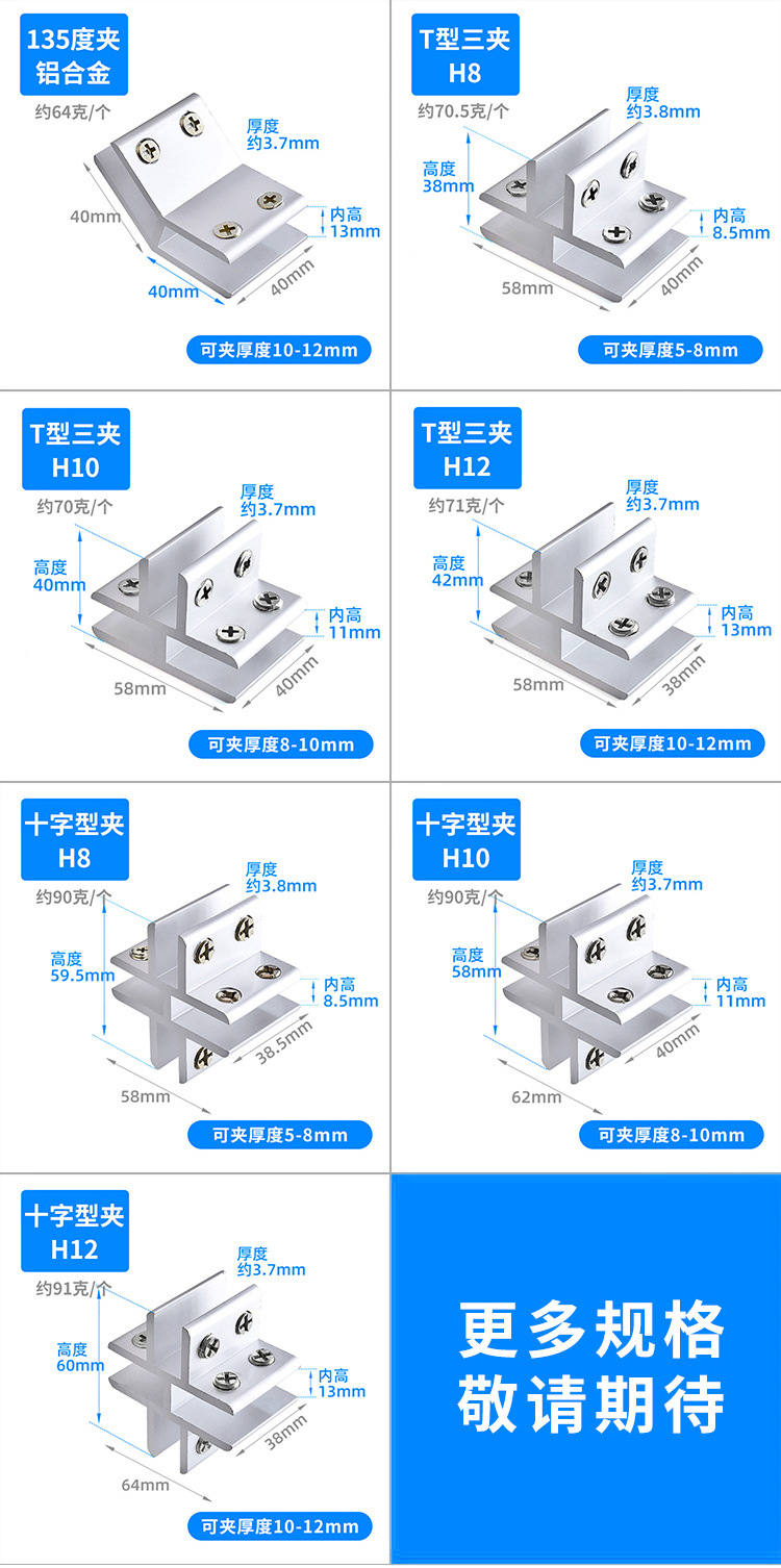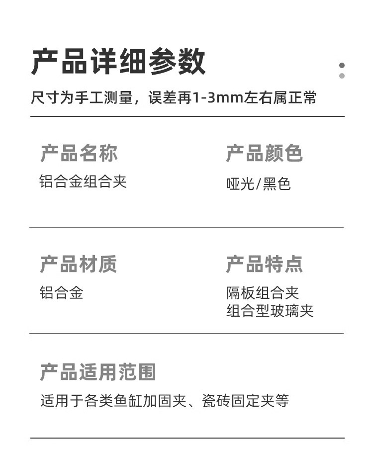 | Especificaciones | 银色90度(夹5-8mm),银色90度(夹8-10mm),银色90度(夹10-12mm),银色90度(夹14-16mm),银色90度(夹18-20mm),银色135度(夹10-12mm),银色180度(夹5-8mm),银色180度(夹8-10mm),银色180度(夹10-12mm),银色180度(夹14-16mm),银色180度(夹18-20mm),银色T型(夹5-8mm),银色T型(夹8-10mm),银色T型(夹10-12mm),银色十字型(夹5-8mm),银色十字型(夹8-10mm),银色十字型(夹10-12mm),黑色90度(夹5-8mm),黑色90度(夹8-10mm),黑色90度(夹10-12mm),黑色90度(夹14-16mm),黑色90度(夹18-20mm),黑色135度(夹10-12mm),黑色180度(夹5-8mm),黑色180度(夹8-10mm),黑色180度(夹10-12mm),黑色180度(夹14-16mm),黑色180度(夹18-20mm),黑色T型(夹5-8mm),黑色T型(夹8-10mm),黑色T型(夹10-12mm),黑色十字型(夹5-8mm),黑色十字型(夹8-10mm),黑色十字型(夹10-12mm),银色无缝L型(夹4-8mm),银色无缝L型(夹8-10mm),银色无缝L型(夹10-12mm),银色无缝T型(夹4-8mm),银色无缝T型(夹8-10mm),银色无缝T型(夹10-12mm),银色无缝十字型(夹4-8mm),银色无缝十字型(夹8-10mm),银色无缝十字型(夹10-12mm),银色无孔U型(夹4-8mm),银色无孔U型(夹8-10mm),银色无孔U型(夹10-12mm),单联箱配件1套(夹6-10mm),单联箱配件1套(夹10-12mm),二联箱配件1套(夹6-10mm),二联箱配件1套(夹10-12mm),三联箱配件1套(夹6-10mm),三联箱配件1套(夹10-12mm),四联箱配件1套(夹6-10mm),四联箱配件1套(夹10-12mm),五联箱配件1套(夹6-10mm),五联箱配件1套(夹10-12mm),六联箱配件1套(夹6-10mm),六联箱配件1套(夹10-12mm),二联箱带隔断配件1套(夹6-10mm),二联箱带隔断配件1套(夹10-12mm),三联箱带隔断配件1套(夹6-10mm),三联箱带隔断配件1套(夹10-12mm),四联箱带隔断配件1套(夹6-10mm),四联箱带隔断配件1套(夹10-12mm),五联箱带隔断配件1套(夹6-10mm),五联箱带隔断配件1套(夹10-12mm),六联箱带隔断配件1套(夹6-10mm),六联箱带隔断配件1套(夹10-12mm),单联箱配件2套(夹6-10mm),单联箱配件2套(夹10-12mm),二联箱配件2套(夹6-10mm),二联箱配件2套(夹10-12mm),三联箱配件2套(夹6-10mm),三联箱配件2套(夹10-12mm),四联箱配件2套(夹6-10mm),四联箱配件2套(夹10-12mm),五联箱配件2套(夹6-10mm),五联箱配件2套(夹10-12mm),六联箱配件2套(夹6-10mm),六联箱配件2套(夹10-12mm) |