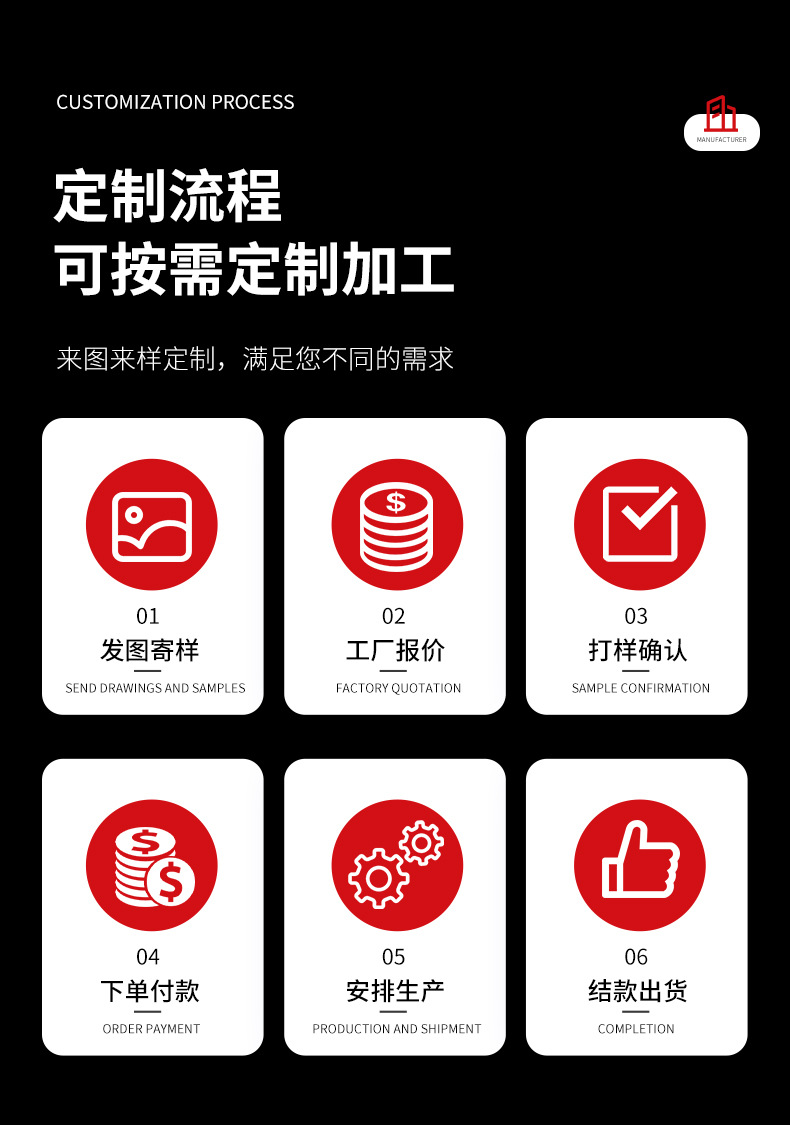 5.付款流程:阿里巴巴支付宝下单,或通过我厂提供的银行帐号进行付款。货款到帐,有现货当天即发货,没现货正常约1-5天内发货,定制类产品按货期交货。到货时间-物流运输一般为1~6天左右。