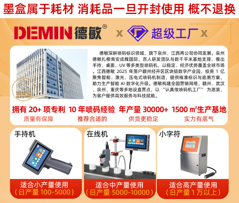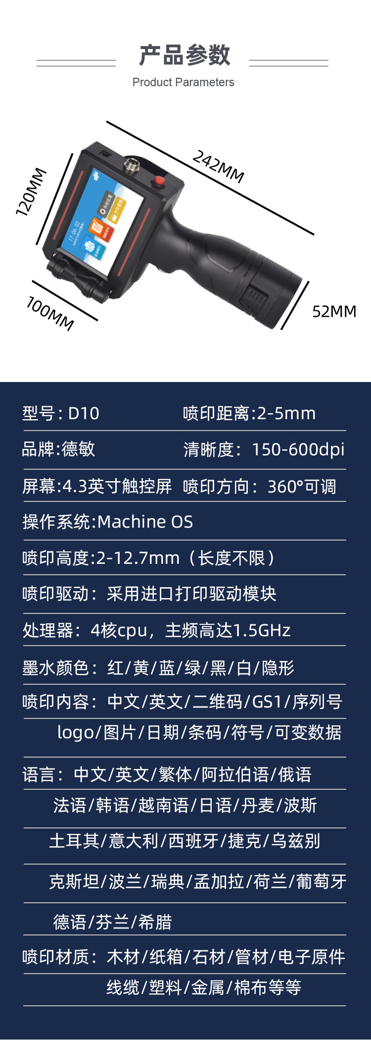 | Especificaciones | Impresora de inyección de tinta D10-M (con tinta de alta adherencia),Impresora de inyección de tinta D10-M (con tinta original de secado rápido),Impresora de inyección de tinta D10-M (metal desnudo, sin accesorios) |