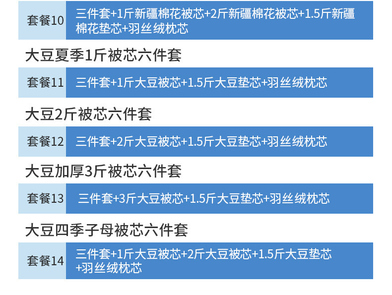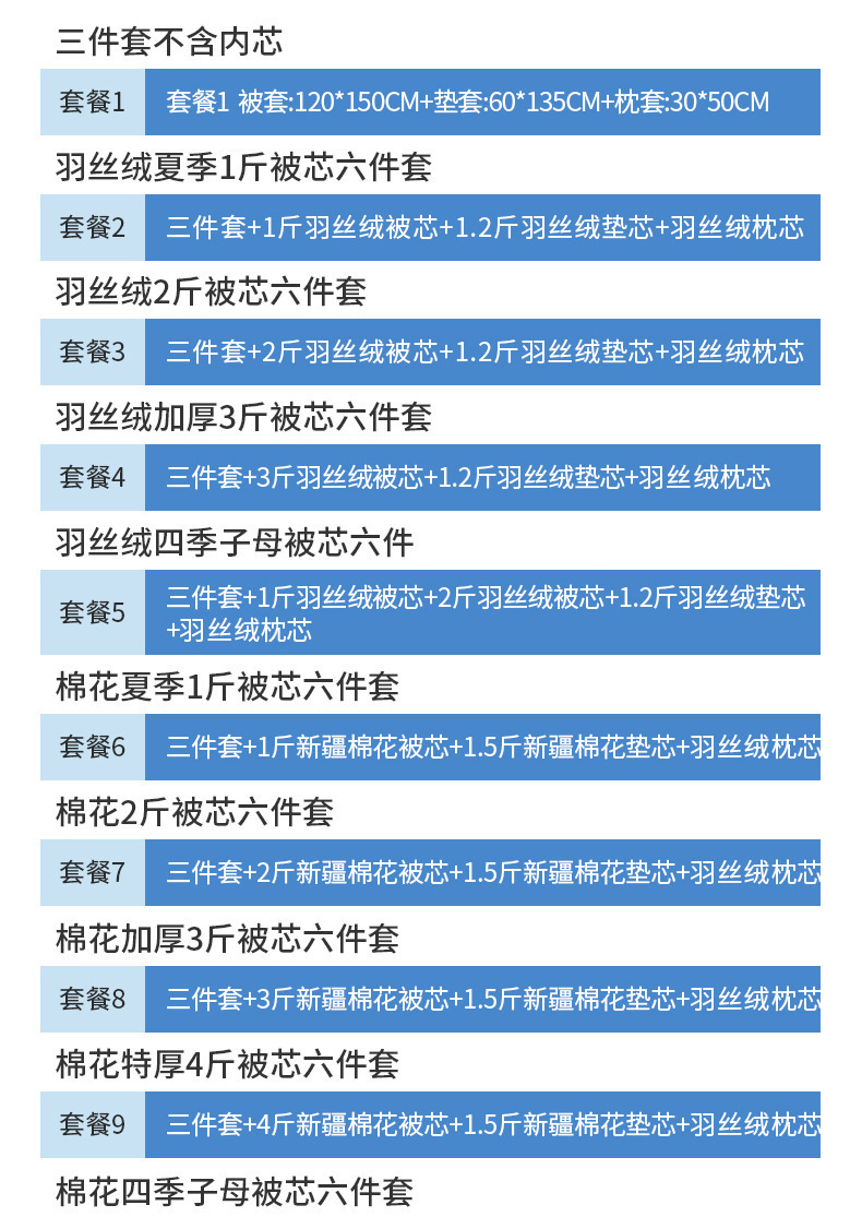 | Especificaciones de tamaño | Fundas de almohada individuales de 30x50cm, fundas de almohadilla individuales de 60x135cm, fundas de colcha individuales de 120x150cm, fundas de tres piezas de algodón (fundas de colcha de 120x150cm, fundas de almohadilla de 60x135, fundas de almohada de 30x50), 1 kilogramo de seis juegos [tres juegos + núcleo de edredón de plumas 1 kilogramo + núcleo de edredón de plumas 1,5 kilogramos + núcleo de almohada de plumas] 2 kilogramos de seis juegos [tres juegos + núcleo de edredón de plumas 2 kilogramos + núcleo de almohadilla de plumas 1,5 kilogramos + núcleo de almohada de plumas], 3 kilogramos de seis juegos [tres Juegos + núcleo de edredón de plumas 3 kilogramos + núcleo de almohadilla de plumas 1,5 kilogramos + núcleo de almohada de plumas], 1 kilogramo de seis juegos [tres juegos + núcleo de edredón de algodón 1 kilogramo + núcleo de almohadilla de plumas 1,5 kilogramos], 2 kilogramos de núcleo de almohada de plumas seis juegos de seis piezas de kilogramo [tres juegos + edredón de algodón 2 kilogramos + núcleo de edredón de algodón 1,5 kilogramos + núcleo de almohada de terciopelo de plumas], tres juegos de seis piezas de kilogramo [tres juegos + núcleo de edredón de algodón 3 kilogramos + núcleo de almohadilla de algodón 1,5 kilogramos + núcleo de almohada de terciopelo de plumas], cuatro juegos de seis piezas de kilogramo [tres juegos + núcleo de edredón de algodón 4 kilogramos + núcleo de almohadilla de algodón 1,5 kilogramos + núcleo de almohada de terciopelo de plumas], un juego de seis piezas de kilogramo [tres juegos + núcleo de edredón de soja 1 kilogramo + núcleo de almohadilla de soja 1,5 kilogramos + núcleo de almohada de terciopelo de plumas], dos juegos de seis piezas de edredón de soja 2 kilogramos + núcleo de cojín de soja 1,5 kilogramos + núcleo de almohada de terciopelo de plumas], Tres kilogramos y seis juegos [tres juegos + edredón de soja 3 kilogramos + núcleo de edredón de soja 1,5 kilogramos + núcleo de almohada de terciopelo de plumas], siete juegos de edredón de seda [tres juegos + núcleo de edredón 1 kilogramo + núcleo de edredón 2 kilogramos + núcleo de almohadilla 1,2 kilogramos + núcleo de almohada], siete juegos de edredón de algodón [tres juegos + núcleo de edredón 1 kilogramo + núcleo de edredón 2 kilogramos + núcleo de almohadilla 1,5 kilogramos + núcleo de almohada], siete juegos de edredón de soja [tres juegos + núcleo de edredón 1 kilogramo + núcleo de edredón 2 kilogramo + núcleo de almohada 1,5 kilogramos] |