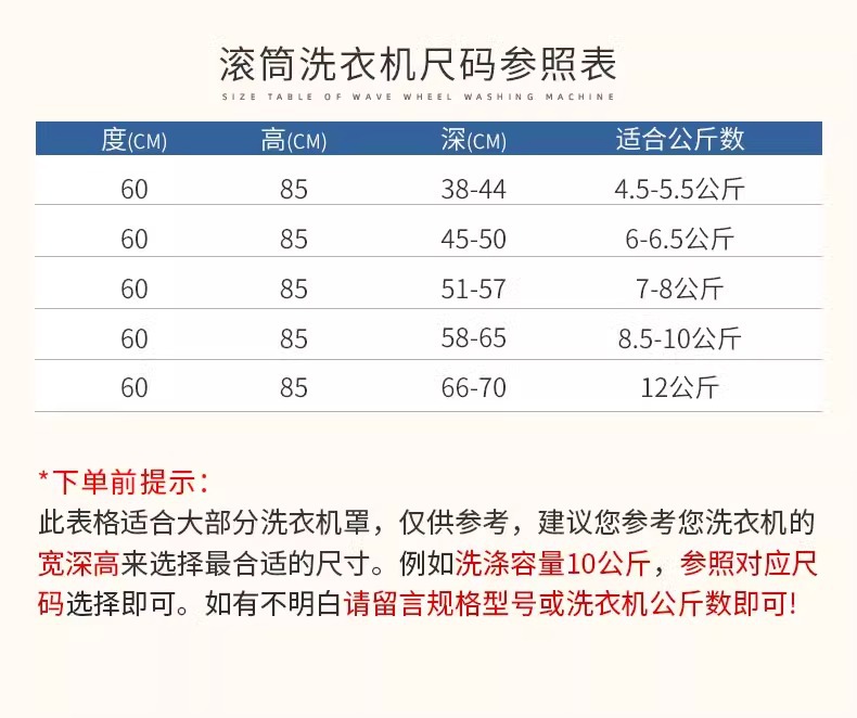 | Tamaño | Adecuado para 4.5 ~ 5.5 kg lavadora,Adecuado para 6 ~ Lavadora 6,5 kg,Adecuado para 7 ~ 8 kg de lavadora,Adecuado para 8.5 ~ Lavadora de 10 kg,Apto para lavadora de 12 kg |