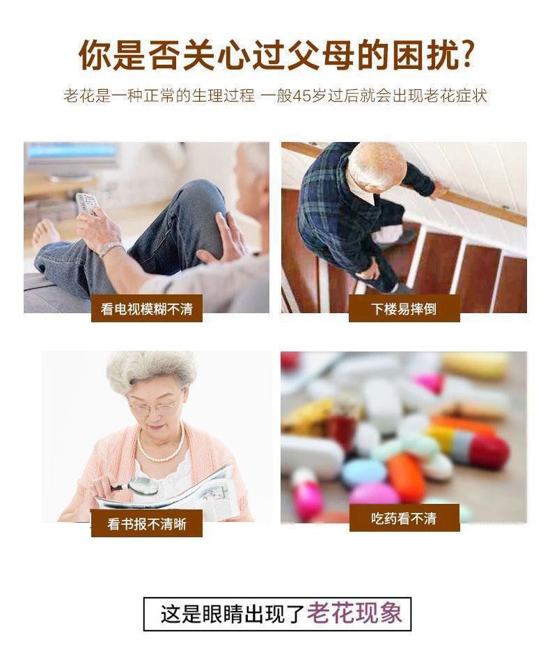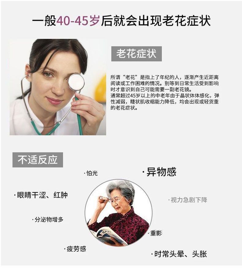 | El grado | Presbiterio de 100 grados [alrededor de 45 años],Presbicia de 150 grados [alrededor de 50 años],Presbicia de 200 grados [alrededor de 55 años],Presbicia de 250 grados [alrededor de 60 años],Presbiterio de 300 grados [alrededor de 65 años],Presbicia de 350 grados [alrededor de 70 años],Presbicia de 400 grados [alrededor de 75 años] |