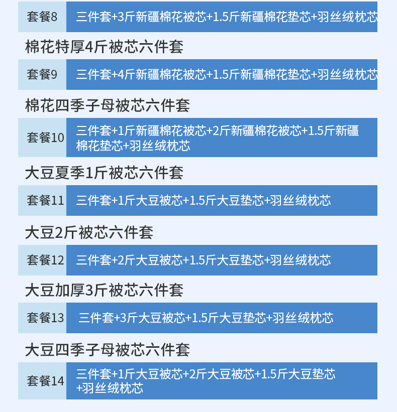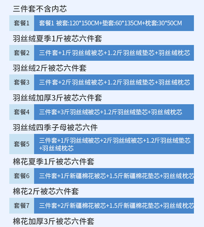 | Especificaciones de tamaño | Fundas de almohada individuales de 30x50cm, fundas de almohadilla individuales de 60x135cm, fundas de colcha individuales de 120x150cm, fundas de tres piezas de algodón (fundas de colcha de 120x150cm, fundas de almohadilla de 60x135, fundas de almohada de 30x50), 1 kilogramo de seis juegos [tres juegos + núcleo de edredón de plumas 1 kilogramo + núcleo de edredón de plumas 1,5 kilogramos + núcleo de almohada de plumas] 2 kilogramos de seis juegos [tres juegos + núcleo de edredón de plumas 2 kilogramos + núcleo de almohadilla de plumas 1,5 kilogramos + núcleo de almohada de plumas], 3 kilogramos de seis juegos [tres Juegos + núcleo de edredón de plumas 3 kilogramos + núcleo de almohadilla de plumas 1,5 kilogramos + núcleo de almohada de plumas], 1 kilogramo de seis juegos [tres juegos + núcleo de edredón de algodón 1 kilogramo + núcleo de almohadilla de plumas 1,5 kilogramos], 2 kilogramos de núcleo de almohada de plumas seis juegos de seis piezas de kilogramo [tres juegos + edredón de algodón 2 kilogramos + núcleo de edredón de algodón 1,5 kilogramos + núcleo de almohada de terciopelo de plumas], tres juegos de seis piezas de kilogramo [tres juegos + núcleo de edredón de algodón 3 kilogramos + núcleo de almohadilla de algodón 1,5 kilogramos + núcleo de almohada de terciopelo de plumas], cuatro juegos de seis piezas de kilogramo [tres juegos + núcleo de edredón de algodón 4 kilogramos + núcleo de almohadilla de algodón 1,5 kilogramos + núcleo de almohada de terciopelo de plumas], un juego de seis piezas de kilogramo [tres juegos + núcleo de edredón de soja 1 kilogramo + núcleo de almohadilla de soja 1,5 kilogramos + núcleo de almohada de terciopelo de plumas], dos juegos de seis piezas de edredón de soja 2 kilogramos + núcleo de cojín de soja 1,5 kilogramos + núcleo de almohada de terciopelo de plumas], Tres kilogramos y seis juegos [tres juegos + edredón de soja 3 kilogramos + núcleo de edredón de soja 1,5 kilogramos + núcleo de almohada de terciopelo de plumas], siete juegos de edredón de seda [tres juegos + núcleo de edredón 1 kilogramo + núcleo de edredón 2 kilogramos + núcleo de almohadilla 1,2 kilogramos + núcleo de almohada], siete juegos de edredón de algodón [tres juegos + núcleo de edredón 1 kilogramo + núcleo de edredón 2 kilogramos + núcleo de almohadilla 1,5 kilogramos + núcleo de almohada], siete juegos de edredón de soja [tres juegos + núcleo de edredón 1 kilogramo + núcleo de edredón 2 kilogramo + núcleo de almohada 1,5 kilogramos] |
