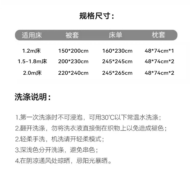 | Especificaciones de tamaño | [Cama para niños] Set de sábanas de 0,9 m de tres piezas [adecuado para edredones de 150 * 200 cm], [Dornos de estudiantes disponibles] Set de sábanas de 1,2 m de tres piezas [adecuado para edredones de 150 * 200 cm], Set de sábanas de 1,5 m de cuatro piezas [adecuado para edredones de 200 * 230 cm], Set de sábanas de 1,8 m de cuatro piezas [adecuado para edredones de 200 * 230 cm], Set de sábanas de 2.0 m de cuatro piezas [adecuado para edredones de 220 * 240 cm], 1.5m cama gaza de cuatro piezas conjunto [para edredón 200 * 230cm], 1.8m cama gaza de cuatro piezas conjunto [para edredón 200 * 230cm], una sola pieza de colcha [para núcleo de edredón 150 * 200cm], una sola pieza de colcha doble [para núcleo de edredón 200 * 230cm], una sola pieza de colcha grande [para núcleo de edredón 220 * 240cm] |