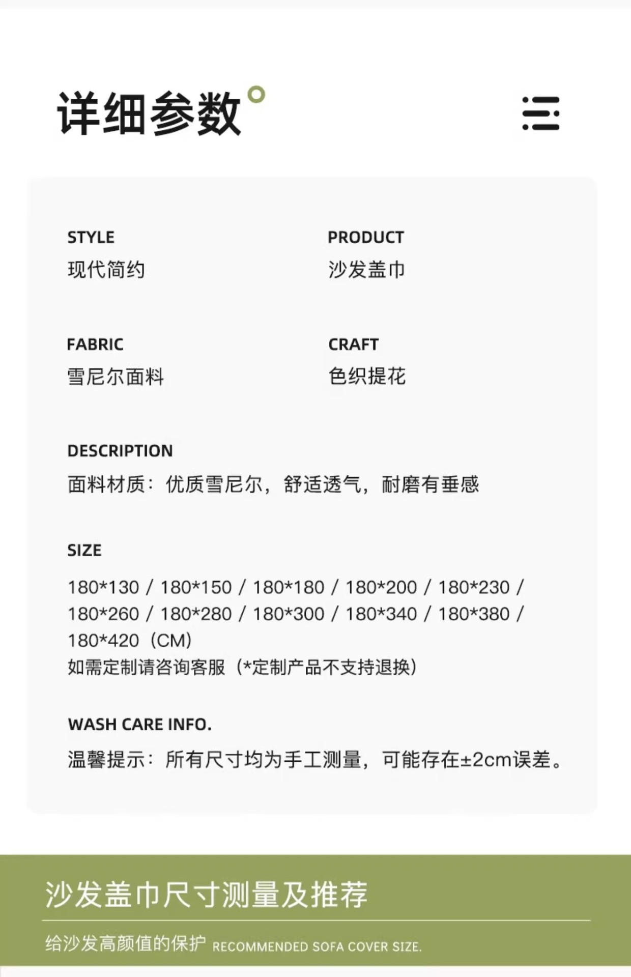 | Tamaño | 90 * 90 cm, adecuado para cojines pequeños cuadrados, 180 * 130 cm, adecuado para sofás individuales pequeños, 180 * 150 cm, adecuado para sofás individuales dobles con cobertura completa, 180 * 180 cm, adecuado para sofás individuales grandes, 180 * 230cm, adecuado para sofás dobles pequeños, 180 * 260cm, adecuado para sofás dobles, 180 * 300cm, adecuado para sofás triples pequeños, 180 * 340 cm, adecuado para sofás triples, 180 * 380 cm, adecuado para sofás triples con cobertura completa o concubinas nobles, 180 * 420cm, adecuado para sofás individuales pequeños, 180 * 480 cm, tamaño personalizado [40 metros] 180 anchos fijos solo admiten longitud personalizada |